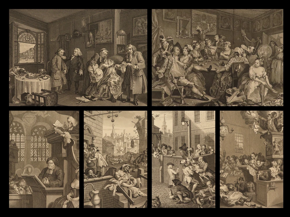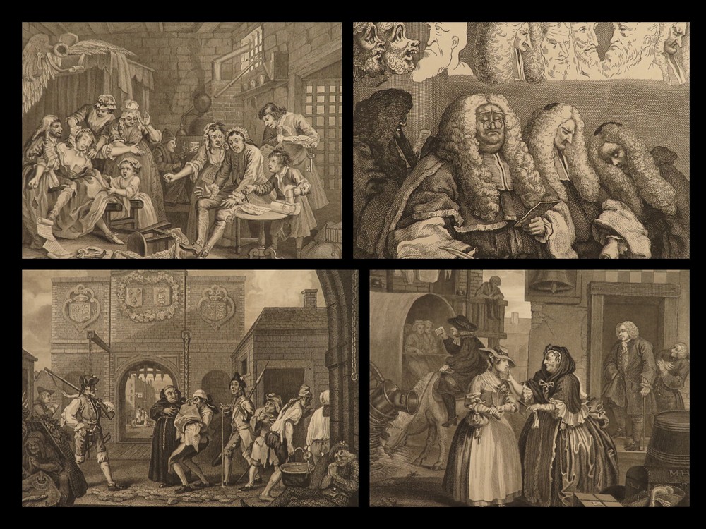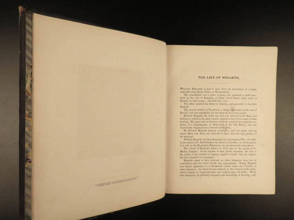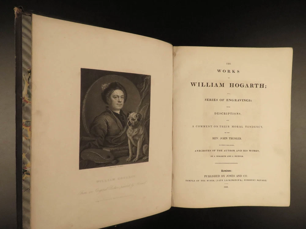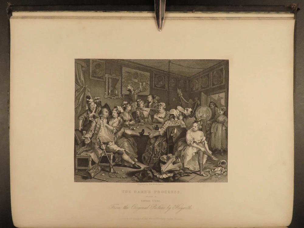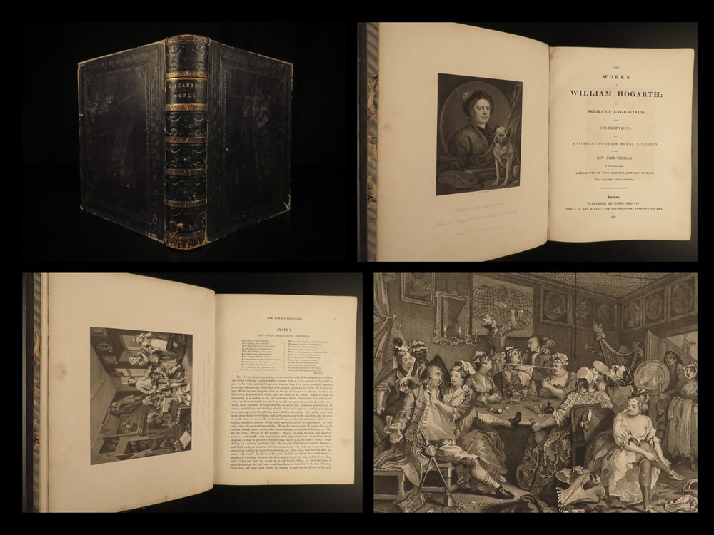 1833 William Hogarth Illustrated ART Political Hudibras Rakes Progress FOLIO William Hogarth was one of the most famous English artists of the 18th-century and his satirical cartoons appeared in comic-strips and other printed works for decades. His most famous works were short series of sketches that told moral stories through the lens of political satire – ‘ A Harlot’s Progress ,’ ‘ A Rake’s Progress ,’ and ‘ Marriage-A-La-Mode .’ This 1833 printing of the works of Hogarth include his most famous works including illustrations to ‘ Hudibras ,’ and ‘ Industry and Idleness .’ Item number: #17608 Price: $550 HOGARTH, William The works of William Hogarth, in a series of engravings with descriptions, and a comment on their moral tendency, by the Reverend John Trusler: to which are added, anecdotes of the author and his works; by J. Hogarth and J. Nichols. London: Jones and Co., 1833. Details : · Collation: Complete with all pages; 2 volumes in 1 o 224, [6] o 107 engraved plates · Provenance: Armorial Bookplate/Handwritten – William Nathaniel Fraser o Motto: CONSTANT JE SUIS PREST o William Nathaniel Fraser was a Scottish peer of Tornaveen, and possibly a member of the Royal Company of Archers, the Queen’s Body Guard for Scotland. · Language: English · Binding: Leather; tight and secure · Size : ~11in X 9in (28cm x 23cm) Our Guarantee: Very Fast. Very Safe. Free Shipping Worldwide. Customer satisfaction is our priority! Notify us with 7 days of receiving, and we will offer a full refund without reservation! 17608