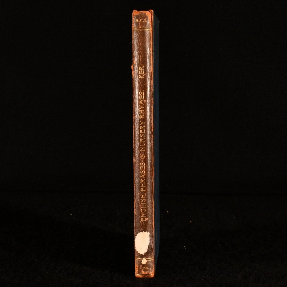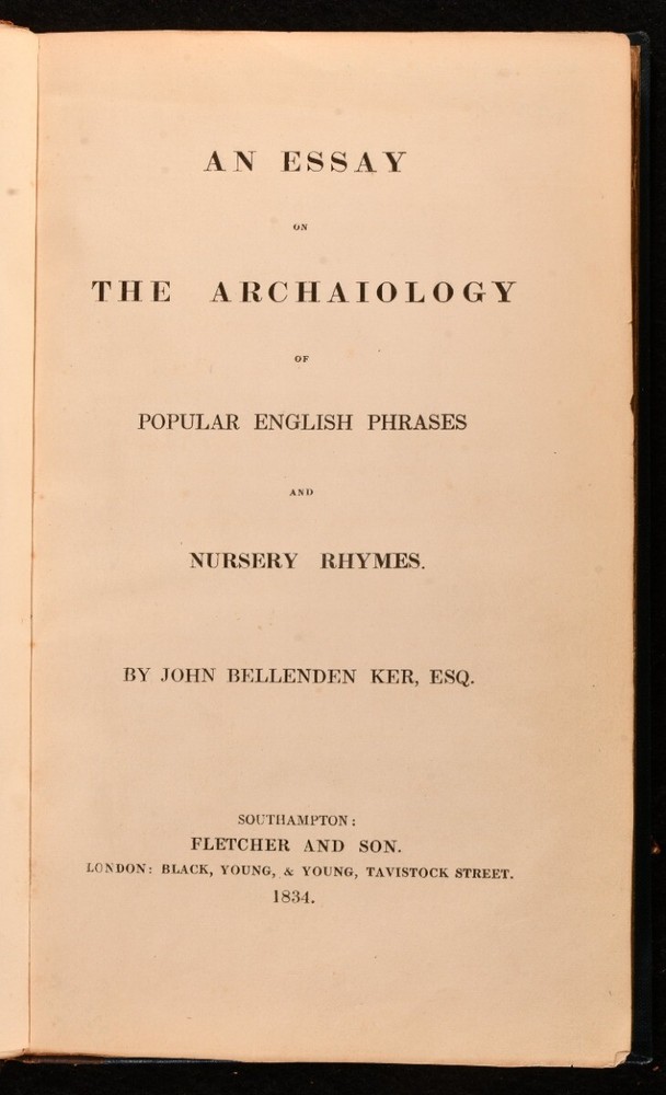 Click here to see our other books! An Essay on the Archaiology of Popular English Phrases and Nursery Rhymes John Bellenden Ker 1834 Fletcher and Son : Southampton 9" by 6" viii, 163pp SUMMARY The first edition of this fascinating 19th century study of popular English phrases and nursery rhymes, written by John Bellenden Ker. First Edition,Leather Binding,Rebound Overall Condition: Good This book weighs 0.5 KG when packed UK Postage: £ 3.99 US Postage: £ 15.99 EU Postage : £ 13.99 European Postage: £ 14.99 Asia Postage: £ 18.99 Worldwide Postage: £ 19.99 DESCRIPTION A fascinating nineteenth-century work on the archaeology of popular English phrases and nursery rhymes. An interesting treatise on the derivation of popular English language phrases and rhymes. Written by John Bellenden Ker Gawler, a seventeenth and eighteenth century English botanist and writer. The first edition of this work. This copy was previously housed in the Nottingham Public Libraries, and contains library stickers to the front pastedown and front free-endpaper. Rebound in quarter cloth library binding. CONDITION Rebound in quarter cloth library binding. Externally, some light shelf wear to the boards and rubbing to the spine and joints. A sticker to the tail of the spine. Front joint is starting at the head. Containing library stickers to the front pastedown and front free-endpaper. A library ink notation to the verso of the title page. Internally, front hinge is lightly strained, remaining binding is firm. Pages are bright and clean, especially considering the age of the work. Overall Condition: Good GLOSSARY OF TERMS Overall Condition (Dustwrapper condition rating is shown after that for the book itself, where a dustwrapper is present) Fine - Very well preserved copy showing very little wear Very Good Indeed - Only one or two minor faults, really a very attractive copy Very Good - Quite a wide term meaning no major faults but probably several smaller ones often expected given the age of the book, but still a respectable copy Good - Meaning not very good. Some more serious faults as will be described in the condition report under 'condition' Good Only - Meaning one or more faults that could really do with repair Fair - As with good only above but with other faults leaving a compromised copy even after repair Poor - Really bad and possibly seriously incomplete. We only sell books in this condition where their rarity or value makes them attractive none the less. Major defects will be described. GUARANTEE We offer a full money back guarantee on our descriptions. Please ask for details and conditions. We prefer PAYPAL. If you pay via PAYPAL we will post the item off the same or the next working day with the postage you have selected. Please note we cannot accept USD cheques