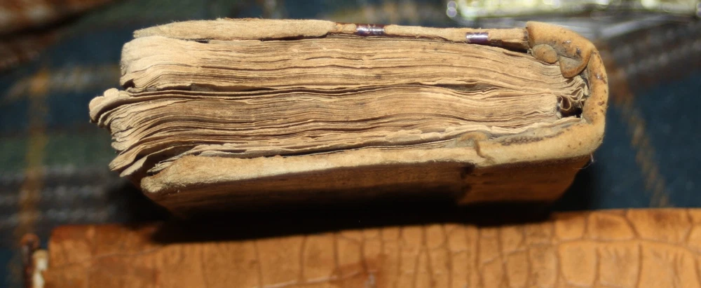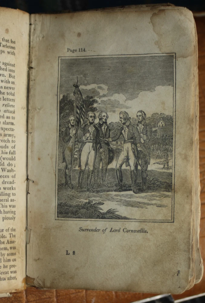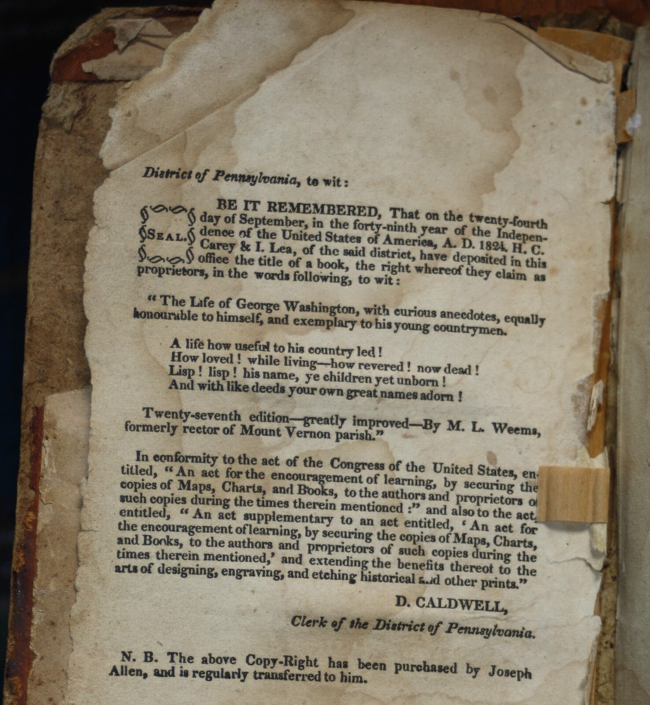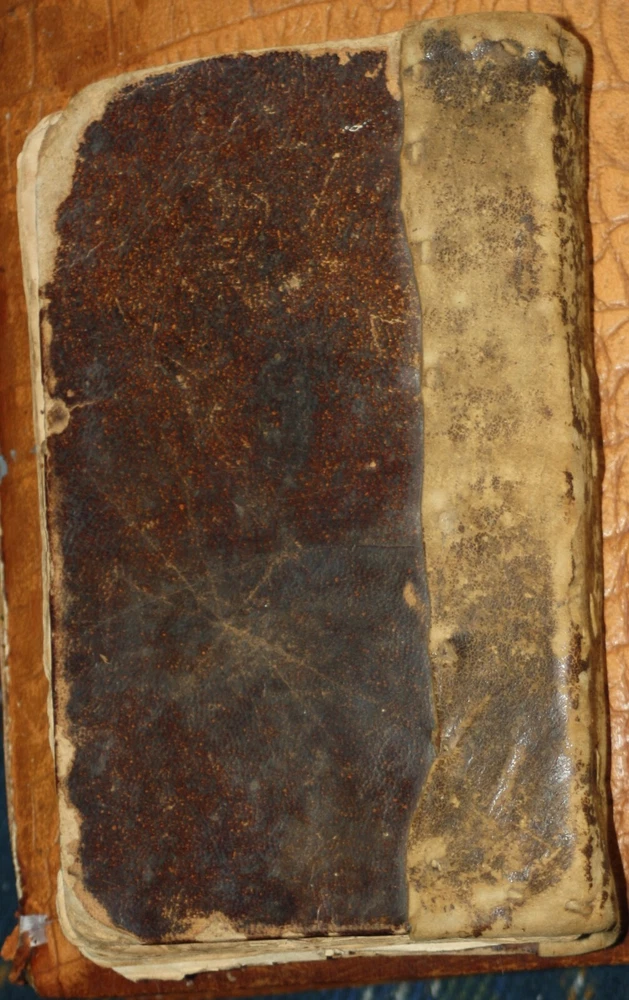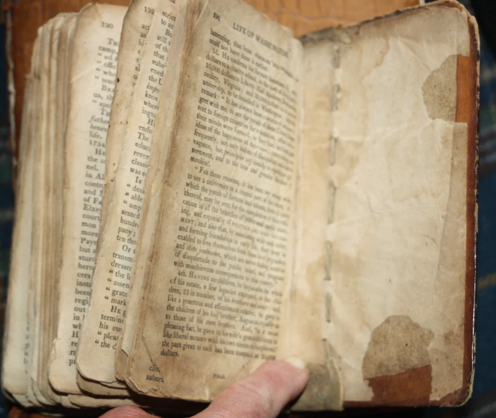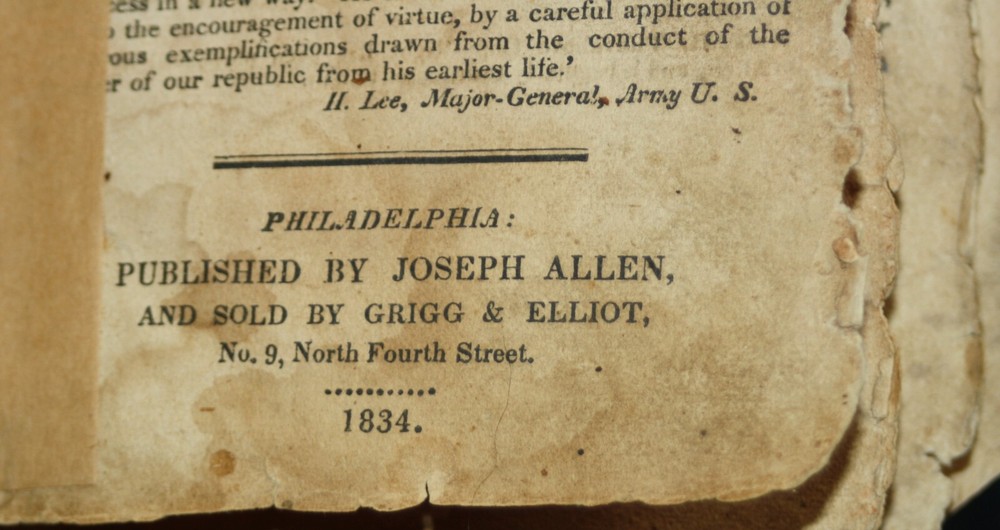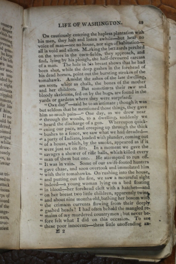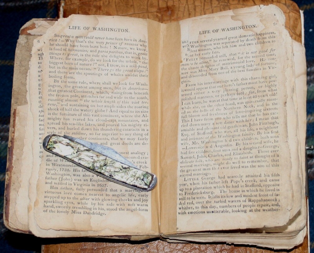 1834 Ed. Of 'The Life of George Washington with Curios Anecdotes' by ML Weems- This is a book that's probably been read a thousand times and carried around in many, many back pockets and it shows it with lots of honest wear and repairs. It's probably got a more interesting history than the contents of this book which was written to cash in on Washingtons popularity directly after his death in 1799. He became like a saint and this book was written quickly to cash in on that. The famous story of the cherry tree fiasco wasn't in the first edition but was a dded to the second one in 1806 so this edition will have that famous story, entirely made up by the author, included too. The repairs to the cover are my favorite feature here. The spine was redone in leather and sewn on with rawhide lacing. Those repairs might be 150 years old. Many pages had to be reattached, too. inv 8