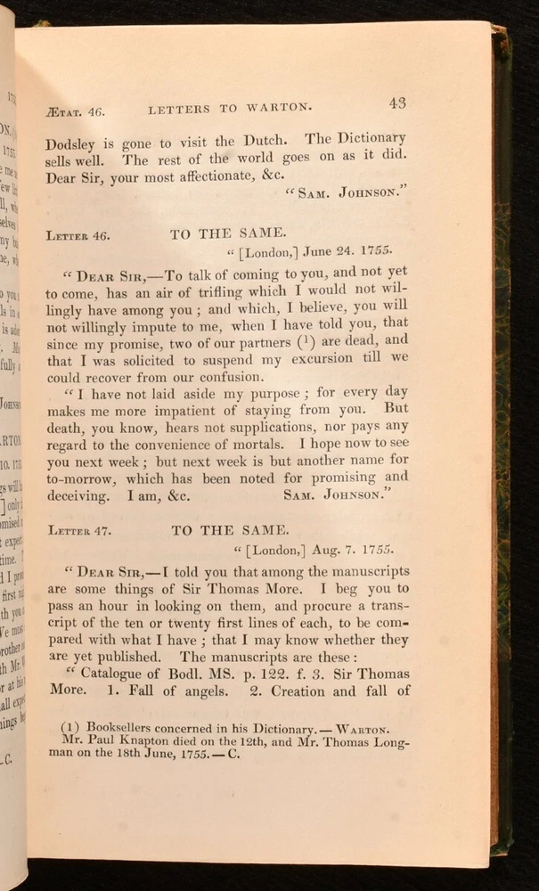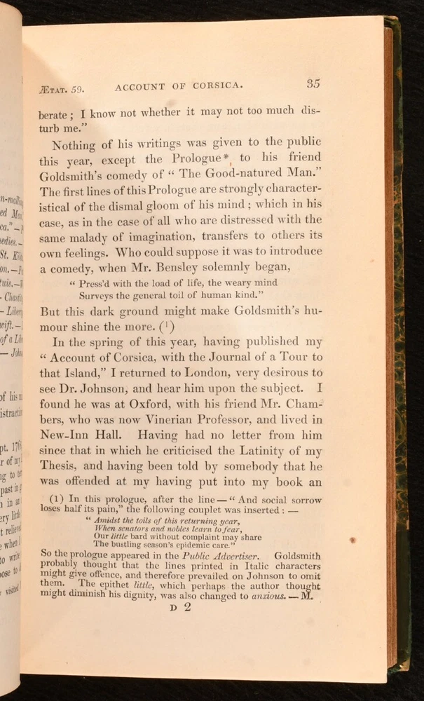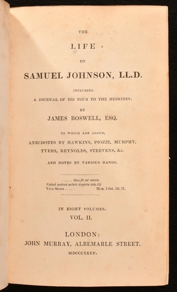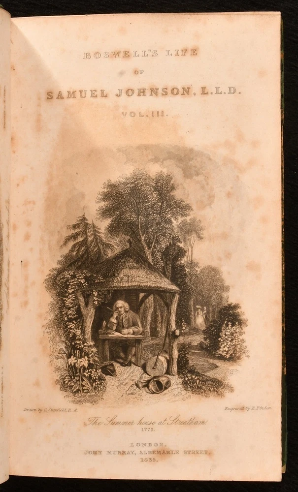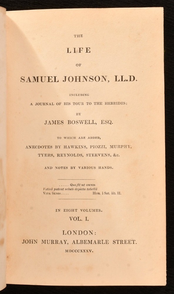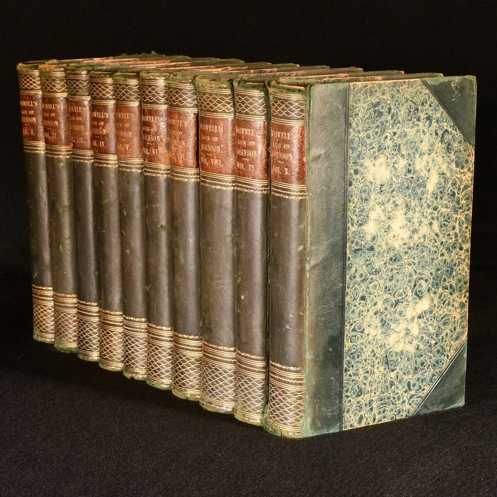 Click here to see our other books! The Life of Samuel Johnson Including a Journal of His Tour to the Hebrides James Boswell 1835 John Murray : London 7" by 4.5" xxiv, 325, (2); viii, 344; ix, 323; xii, 343; viii, 341; viii, 342; viii, 381; xi, 431; xv, 335; xii, 376pp. SUMMARY A smartly bound set of Boswell's famous biography of Samuel Johnson, featuring illustrations and valuable additions. Illustrated,Leather Binding Overall Condition: Good This book weighs 2 KG when packed UK Postage: £ 3.99 US Postage: £ 29.99 EU Postage : £ 21.99 European Postage: £ 23.99 Asia Postage: £ 37.99 Worldwide Postage: £ 38.99 DESCRIPTION Complete in ten volumes. Celebrated work of Scottish biographer James Boswell, often described as one of the greatest English biographies of all time. With engraved frontispiece and additional engraved title page to each volume. As well as a folding plate to volume one, a folding map to volume four, and a folding facsimile to volume six. Collation seems to vary in various copies seen in commerce. Complete with half titles. Samuel Johnson was an English author, well-known in the literary world for his many lasting contributions to various areas of humanist art, including poetry, essay-writing, biography, and more. He is described by the 'Oxford Dictionary of National Biographies' as the most distinguished man of letters in English history. Including 'A Journal of his Tour to the Hebrides.' With additions of anecdotes by Hawkins, Piozzi, Murphym Tyers, Reynolds, Steevens, and notes by various hands. Also featuring the original texts, augmented by the additional writings of the biographer and his subject. This biography is notable for its extensive reports of Johnson's conversation, compiled through Boswell's acquaintance of Johnson since 1763. CONDITION Bound in half green calf with marbled boards. Externally, sound with rubbing and light bumping to the extremities. Fading to the spines with the odd mark to the boards. Minor loss to the head and tail of the spines as well as the board tips. Small cracks to the joints at the head and tail. Internally, firmly bound. Pages are very bright with the odd small spot and light age toning to the extremities. The odd small handling mark or pencil annotation. Contemporary ink inscription to the front endpaper of volume one and the title page of the odd volume. Overall Condition: Good GLOSSARY OF TERMS Overall Condition (Dustwrapper condition rating is shown after that for the book itself, where a dustwrapper is present) Fine - Very well preserved copy showing very little wear Very Good Indeed - Only one or two minor faults, really a very attractive copy Very Good - Quite a wide term meaning no major faults but probably several smaller ones often expected given the age of the book, but still a respectable copy Good - Meaning not very good. Some more serious faults as will be described in the condition report under 'condition' Good Only - Meaning one or more faults that could really do with repair Fair - As with good only above but with other faults leaving a compromised copy even after repair Poor - Really bad and possibly seriously incomplete. We only sell books in this condition where their rarity or value makes them attractive none the less. Major defects will be described. GUARANTEE We offer a full money back guarantee on our descriptions. Please ask for details and conditions. We prefer PAYPAL. If you pay via PAYPAL we will post the item off the same or the next working day with the postage you have selected. Please note we cannot accept USD cheques