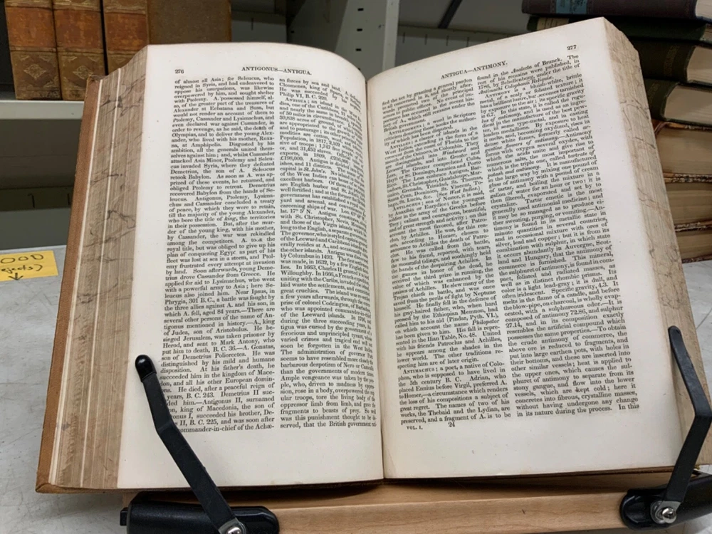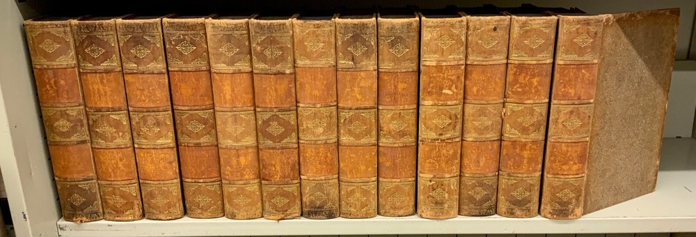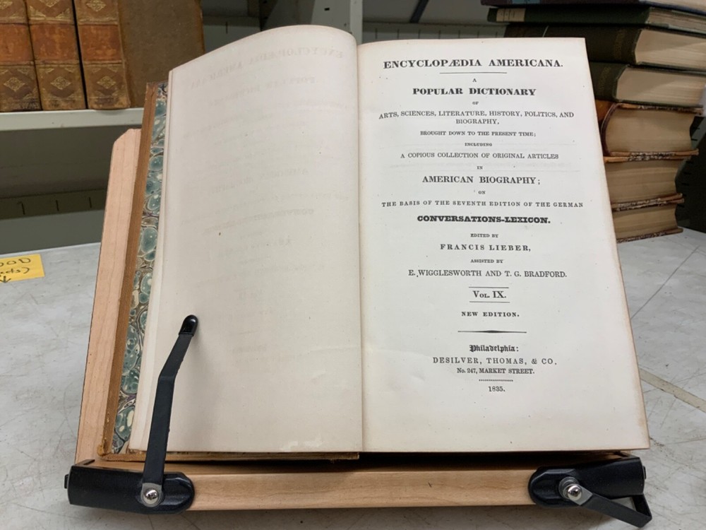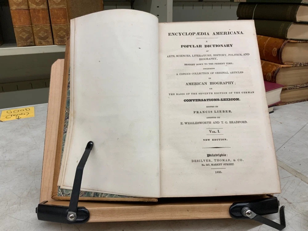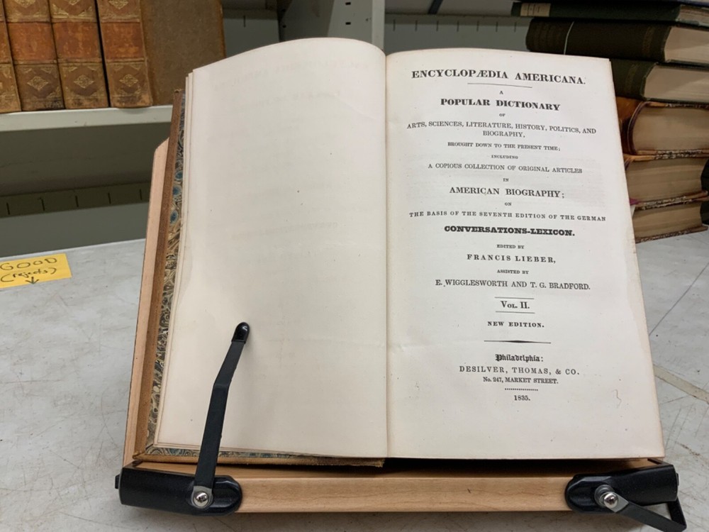 Encyclopaedia Americana. A popular dictionary of arts, sciences, literature, history, politics and biography, brought down to the present time; including a copious collection of original articles in American biography; on the basis of the seventh edition of the German Conversations-Lexicon. Assisted by E. Wigglesworth and T.G. Bradford, Complete in Thirteen Volumes, full leather, 8.5 x 6”, 8vo. In good condition. Light wear to extremities with scuffing to edges and corners. Spines slightly abraded at joints and ends. Lacking spine labels. All boards attached. Some gutters are tender, fragile. Bindings all intact. Marbled end papers free of ownership or markings. All edges marbled. Textblocks lightly toned with minor instances of foxing. Please see photos. FORN-MSB-0623-Shelf723-LH104