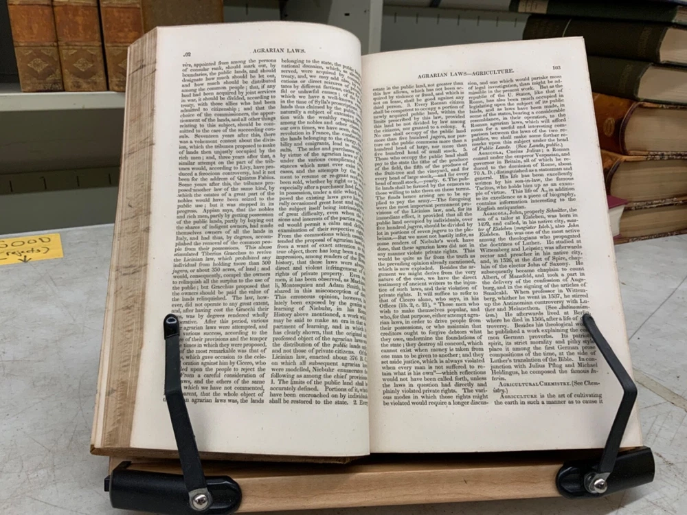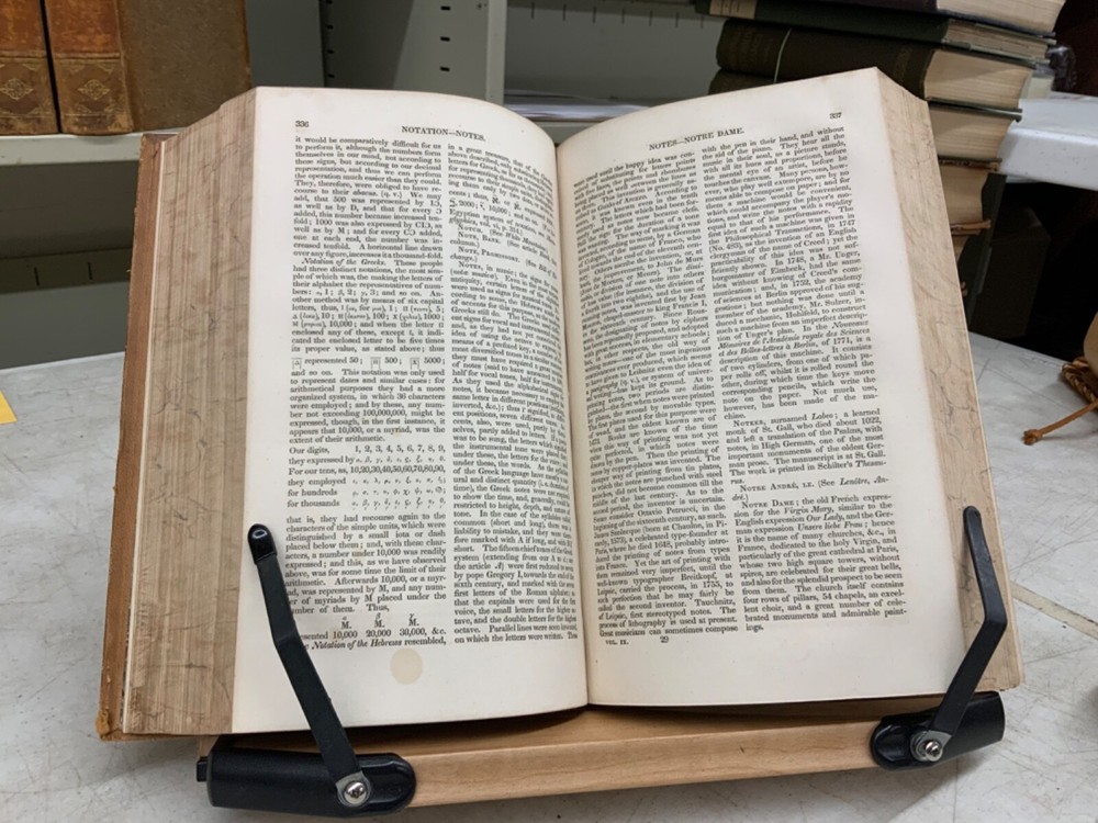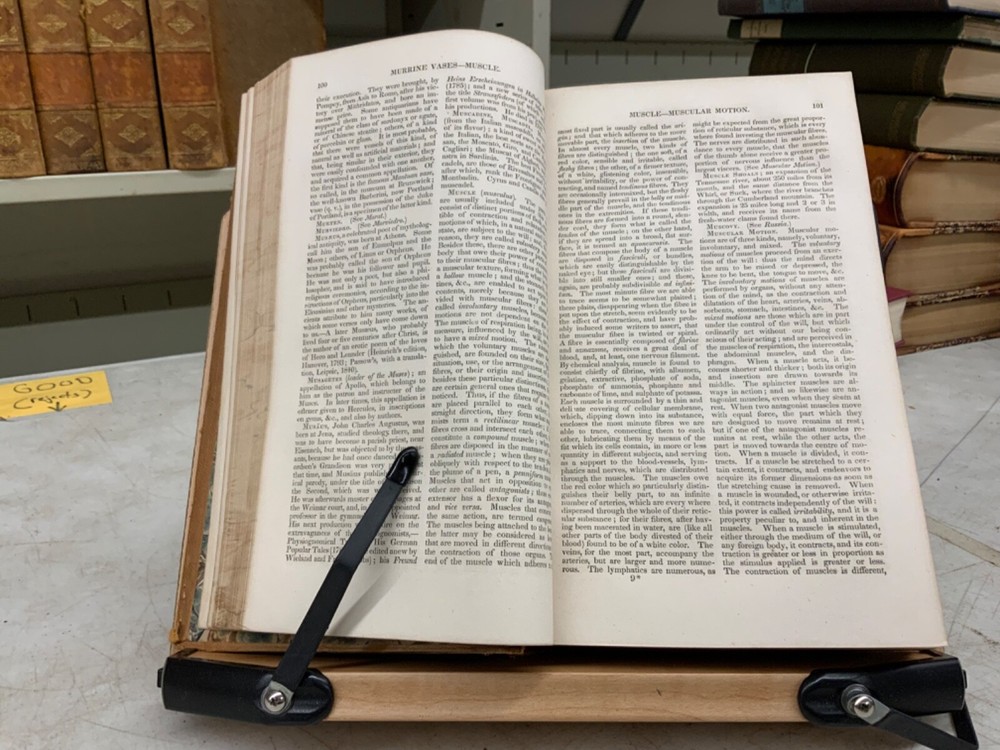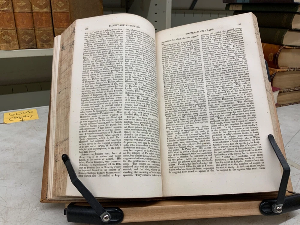 Encyclopaedia Americana. A popular dictionary of arts, sciences, literature, history, politics and biography, brought down to the present time; including a copious collection of original articles in American biography; on the basis of the seventh edition of the German Conversations-Lexicon. Assisted by E. Wigglesworth and T.G. Bradford, Complete in Thirteen Volumes, full leather, 8.5 x 6”, 8vo. In good condition. Light wear to extremities with scuffing to edges and corners. Spines slightly abraded at joints and ends. Lacking spine labels. All boards attached. Some gutters are tender, fragile. Bindings all intact. Marbled end papers free of ownership or markings. All edges marbled. Textblocks lightly toned with minor instances of foxing. Please see photos. FORN-MSB-0623-Shelf723-LH104
