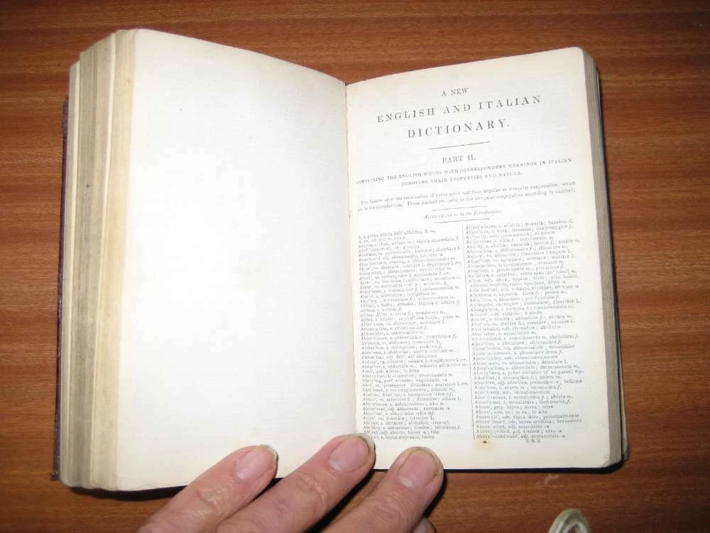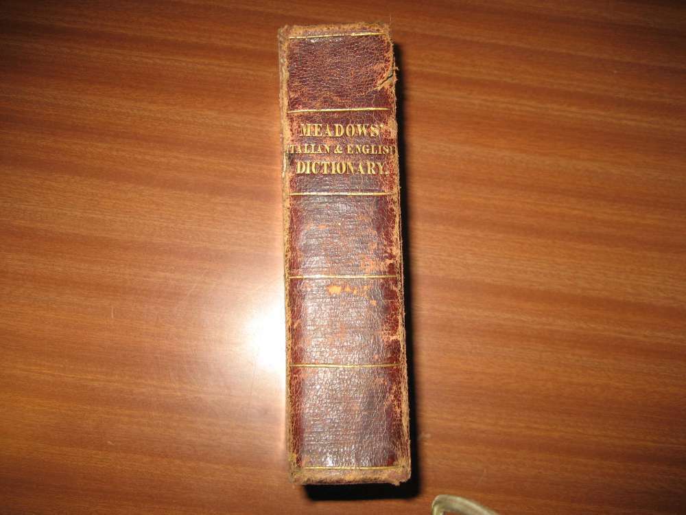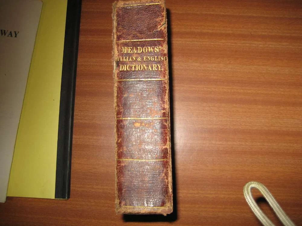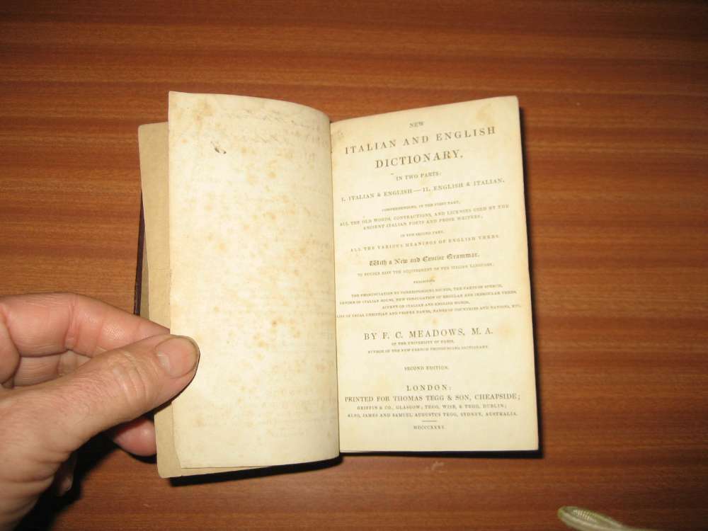 1835 MEADOW'S ITALIAN & ENGLISH DICTIONARY LEATHER BOUND PUBLISHED BY THOMAS TEGG & SONS Poor condition , various signs of use and damage. The item is complete. Buy with confidence from a trusted seller ALL PHOTOS SHOW ACTUAL BOOK FOR SALE All our books are sent carefully wrapped in cardboard, then placed in a high quality 'jiffy' style protected postal bag. They are sent the day after payment is received excepting weekends when it is sent the following Monday. Selling with no reserve. We will always combine postage if you buy more than one of our items. Thanks for looking and good luck if you decide to bid. >>