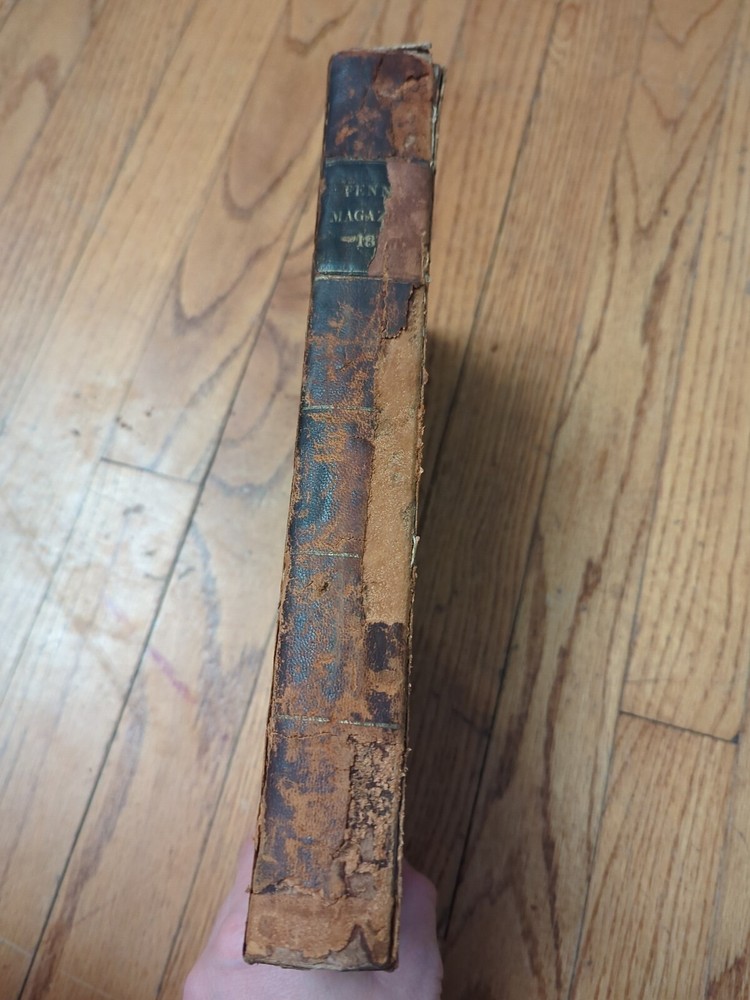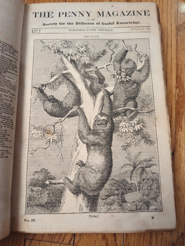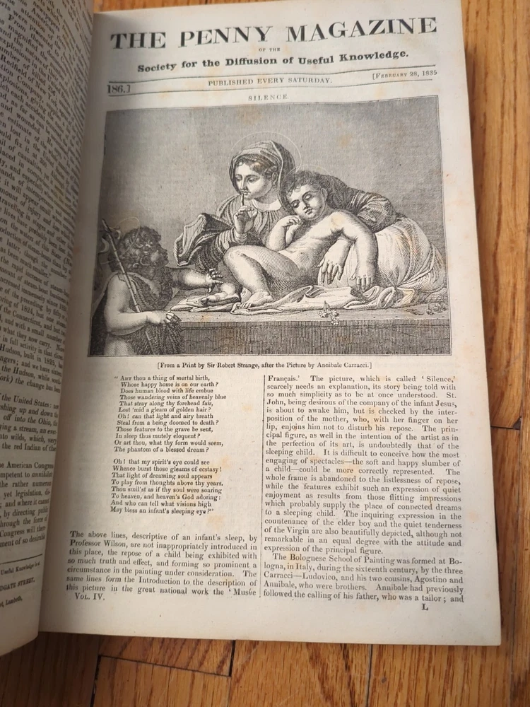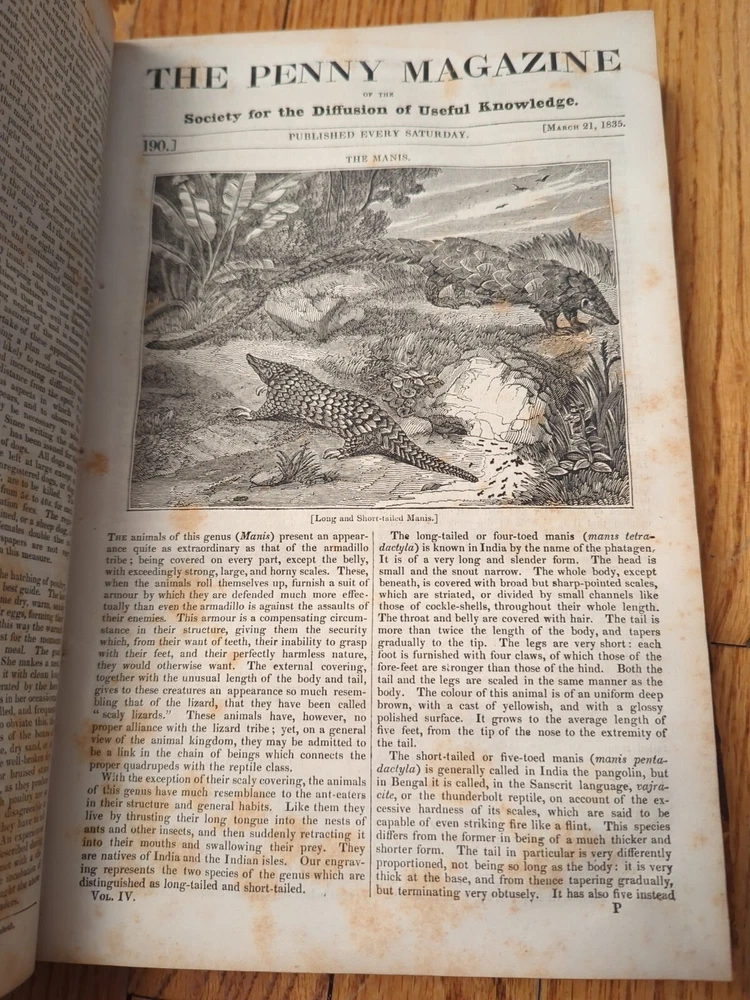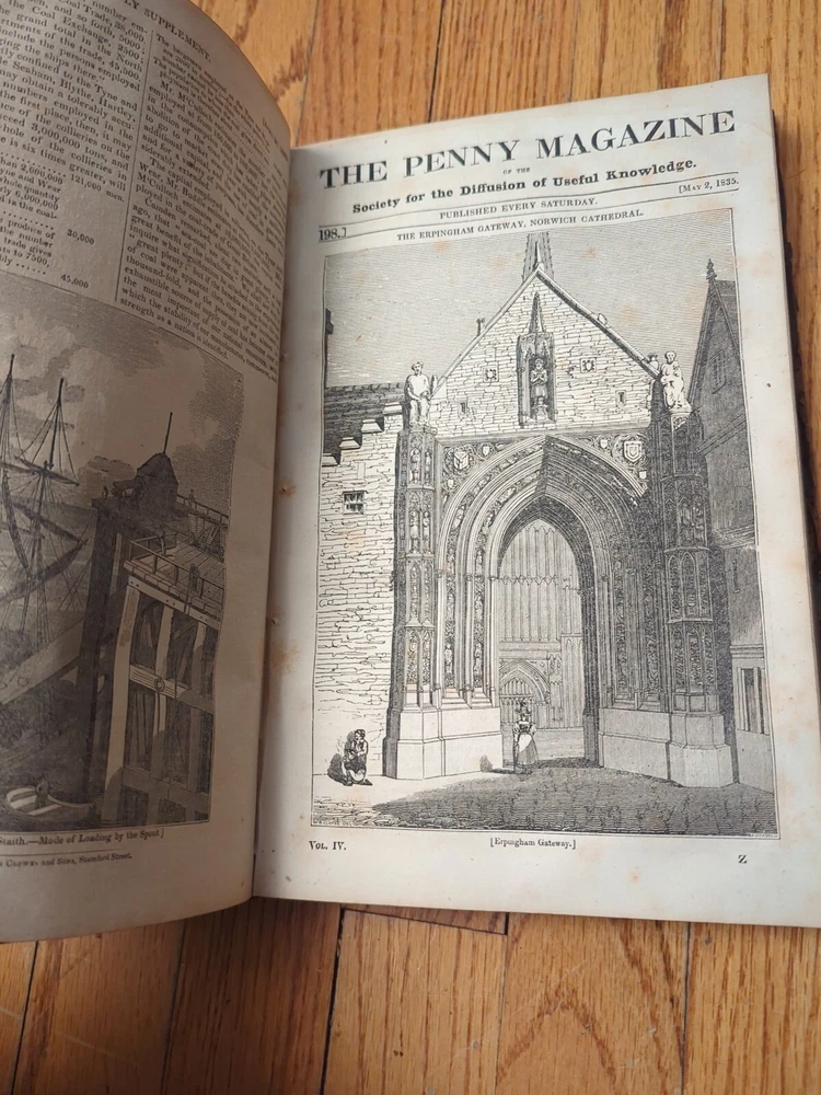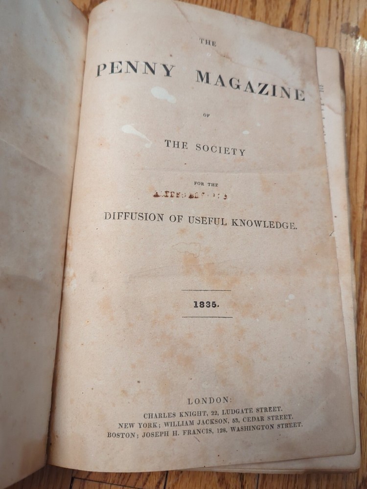 1835 The Penny Magazine (Vol IV bound Jan-Dec 1835). Some chipping on spine. Hinges are still good with some cracking. Still tightly bound. See photos. Illustrated.