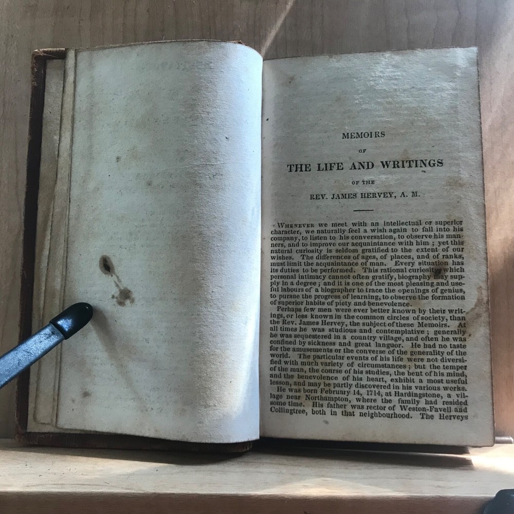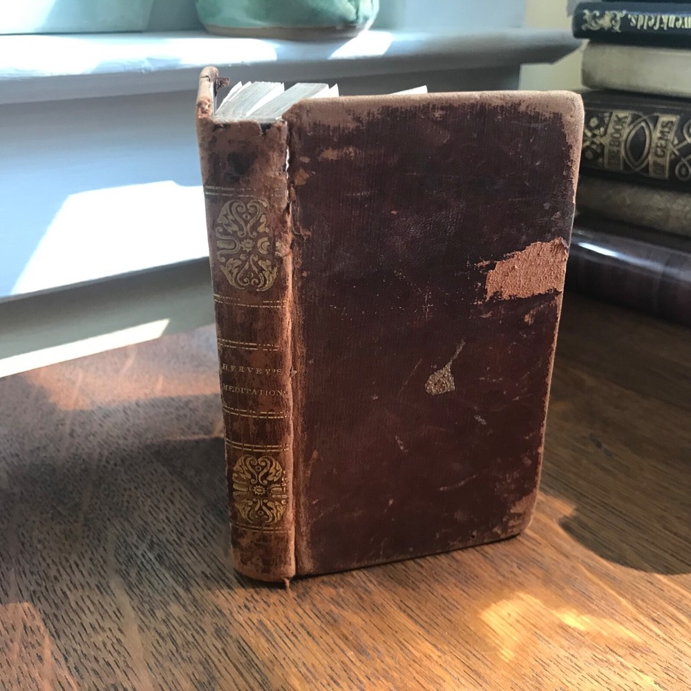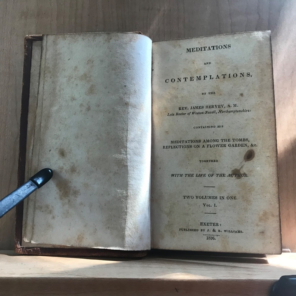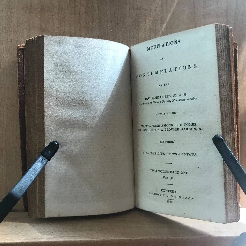 Meditations and Contemplations, by the Rev. James Hervey, Containing His Meditations Among the Flowers, Reflections on a Flower Garden, &c., Together with the Life of the Author, Two Volumes in One, Published by J. & B. Williams, Exeter, 1836, 240 pp, continuous pagination, original leather, 5.5 x 3.25”, 32mo. In fair condition. Ex-library of the Lebanon Historical Society. Binding moderately worn with areas of loss, particularly at head of spine. Red rot to edges, corners. Small instance of worming to bottom edge of front board. Leather dulled overall. Spine abraded with red rot and cracking at joints. Interior good with light toning and scattered foxing, typical defects for an antiquarian book. A few small age-stains throughout text. Free of markings. End papers soiled. Ex-library evidence located only at front fly leaf. Binding intact. Please see photos. James Hervey (1714-1759) was an English clergyman and writer. His style is often bombastic, but he displays a rare appreciation of natural beauty, and his simple piety made him many friends. His earliest work, Meditations and Contemplations , said to have been modeled on Robert Boyle’s Occasional Reflexions on various Subjects , within fourteen years passed through as many editions. COLR1836ABCM-variant