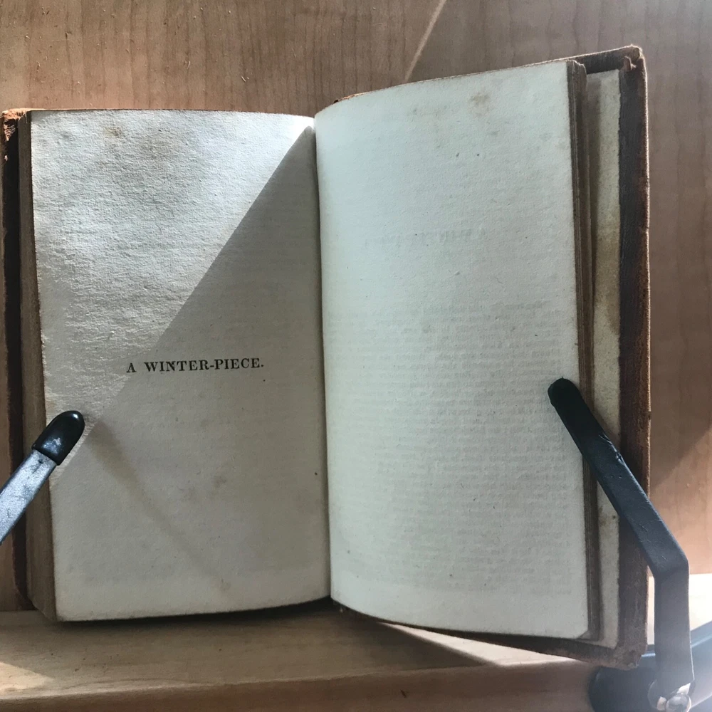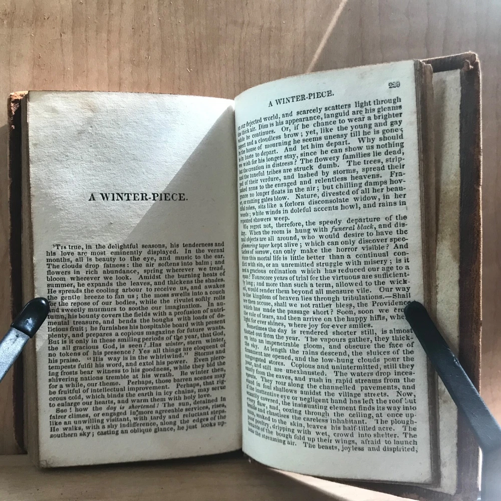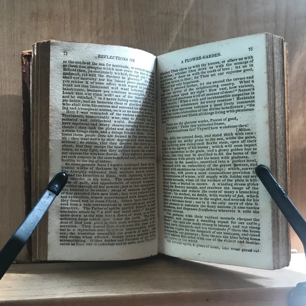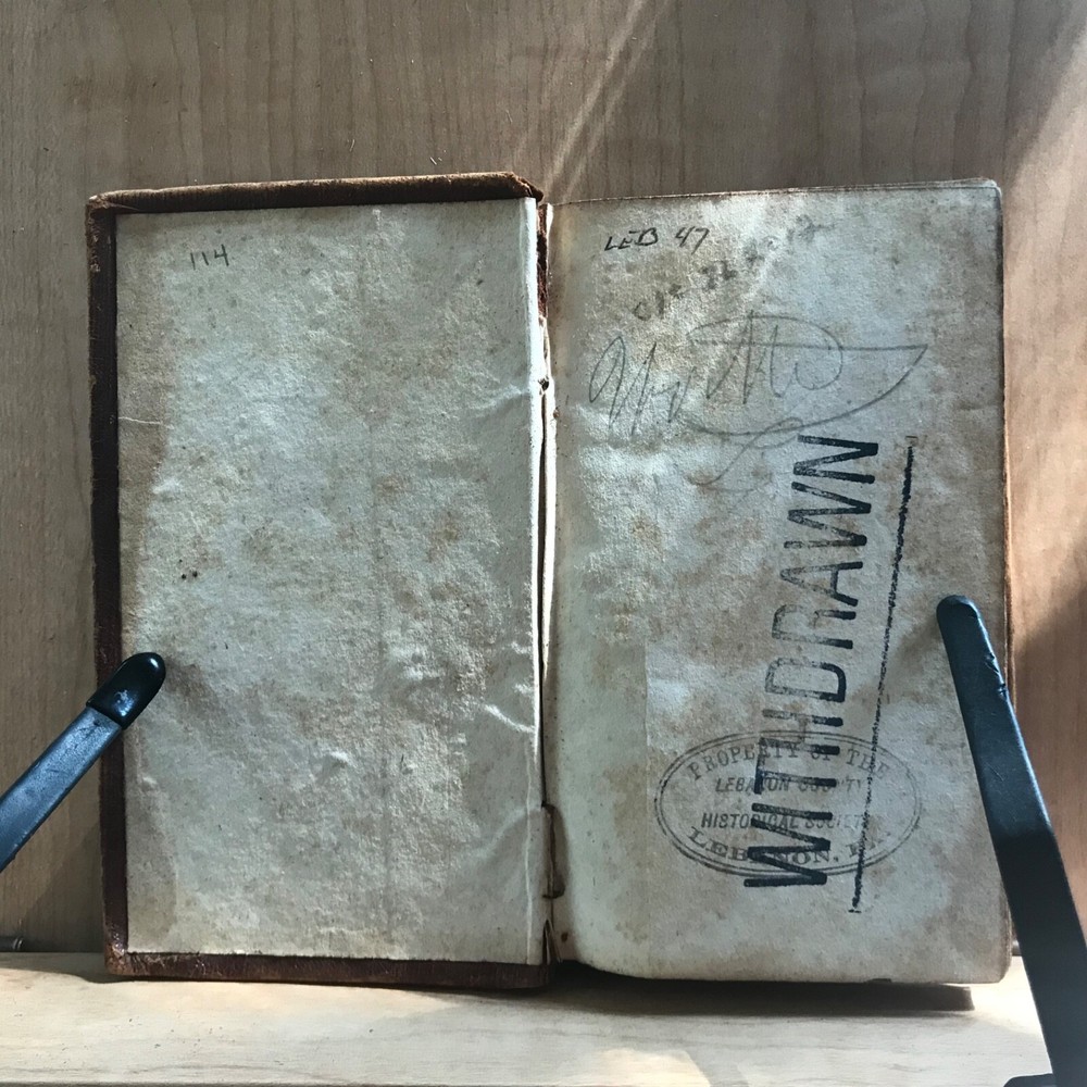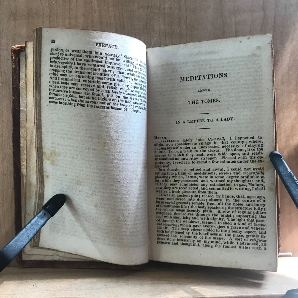 Meditations and Contemplations, by the Rev. James Hervey, Containing His Meditations Among the Flowers, Reflections on a Flower Garden, &c., Together with the Life of the Author, Two Volumes in One, Published by J. & B. Williams, Exeter, 1836, 240 pp, continuous pagination, original leather, 5.5 x 3.25”, 32mo. In fair condition. Ex-library of the Lebanon Historical Society. Binding moderately worn with areas of loss, particularly at head of spine. Red rot to edges, corners. Small instance of worming to bottom edge of front board. Leather dulled overall. Spine abraded with red rot and cracking at joints. Interior good with light toning and scattered foxing, typical defects for an antiquarian book. A few small age-stains throughout text. Free of markings. End papers soiled. Ex-library evidence located only at front fly leaf. Binding intact. Please see photos. James Hervey (1714-1759) was an English clergyman and writer. His style is often bombastic, but he displays a rare appreciation of natural beauty, and his simple piety made him many friends. His earliest work, Meditations and Contemplations , said to have been modeled on Robert Boyle’s Occasional Reflexions on various Subjects , within fourteen years passed through as many editions. COLR1836ABCM-variant