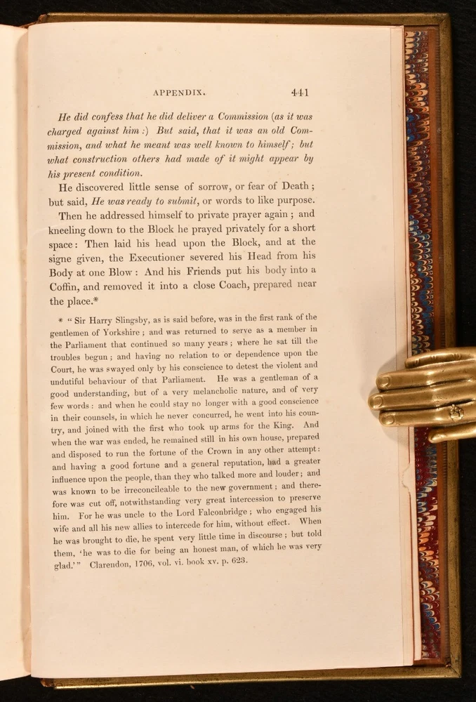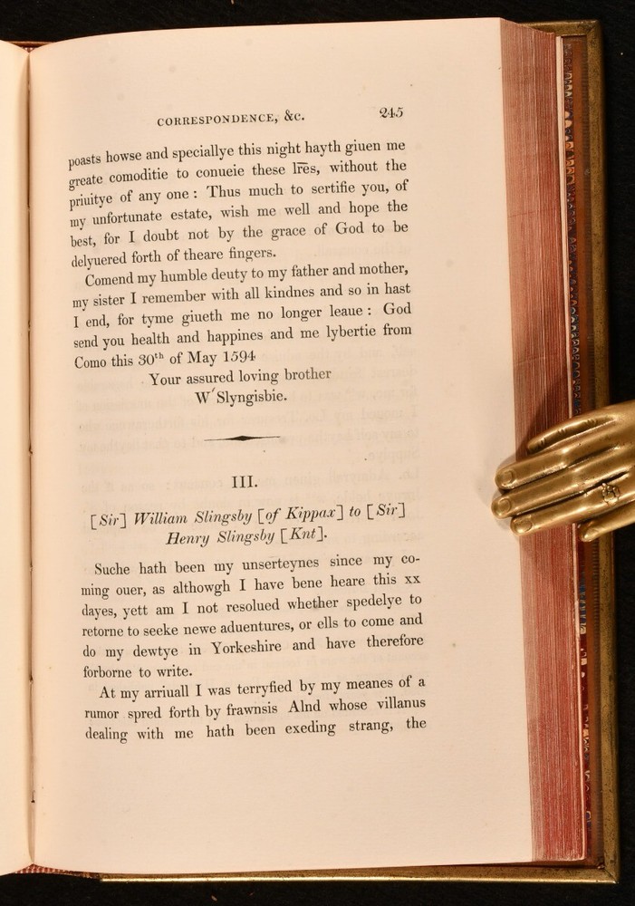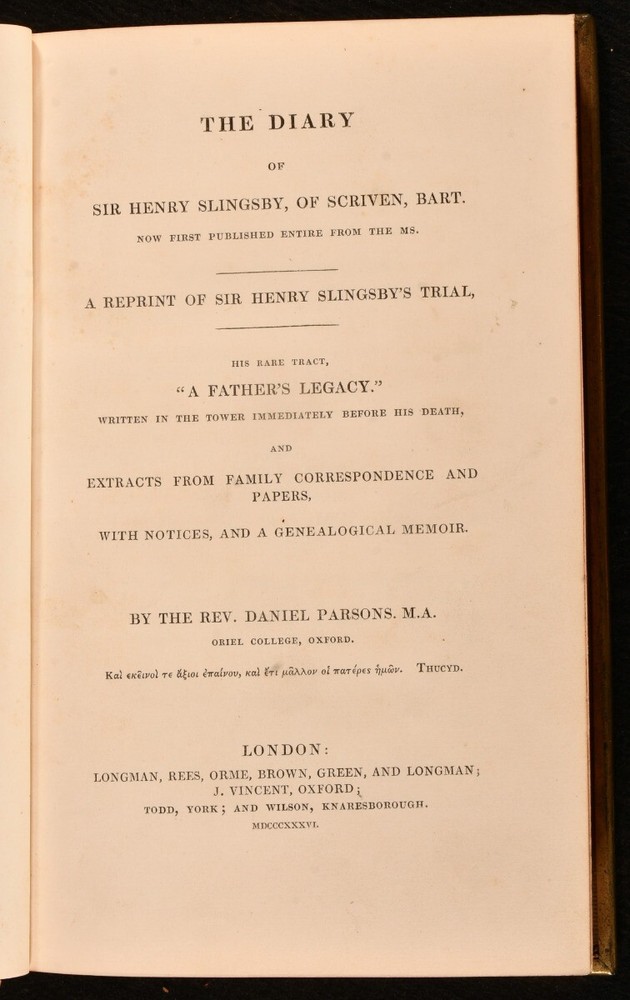 Click here to see our other books! The Diary of Sir Henry Slingsby Rev. Daniel Parsons 1836 Longman, Rees, Orme, Brown et al : London 9" by 6" xxiii [2], 2-441pp SUMMARY The very scarce first edition of this work, combining the first publication of Slingsby's diary, with a reprint of his trial and further related papers. In a full calf binding, with unique brass edges. First Edition,Leather Binding,Very Scarce Overall Condition: Very Good Indeed This book weighs 1.5 KG when packed UK Postage: £ 3.99 US Postage: £ 23.99 EU Postage : £ 18.99 European Postage: £ 19.99 Asia Postage: £ 31.99 Worldwide Postage: £ 32.99 DESCRIPTION The first edition of this very scarce work. Sir Henry Slingsby was a Royalist who supported Charles I during the Civil War. After the defeat of the Royalists, he was arrested and charged with high treason. He was hung, drawn and quartered in 1658. Despite his controversial political views and actions, Slingsby was also known for his contributions to science and technology. He was a member of the Royal Society and made several important advances in the fields of chemistry and metallurgy, including the development of a new method for making gunpowder. This work, compiled by Daniel Parsons, combines Slingsby's own diary - here first published from the original manuscript - alongside a reprint of his trial, a tract he wrote shortly before his death while in the Tower of London, extracts from his family papers, and a genealogical memoir. With the inscription of A. Thompson to a front blank. An exceptionally bright copy of this very scarce work, bound with brass edges. CONDITION In a full calf binding, with gilt detailing to back strip and brass edges to boards. Minor rubbing to joints, with a small area of rubbing towards the tail of the front board. Inscription to a front blank. Internally, firmly bound. Pages exceptionally clean and bright. Overall Condition: Very Good Indeed GLOSSARY OF TERMS Overall Condition (Dustwrapper condition rating is shown after that for the book itself, where a dustwrapper is present) Fine - Very well preserved copy showing very little wear Very Good Indeed - Only one or two minor faults, really a very attractive copy Very Good - Quite a wide term meaning no major faults but probably several smaller ones often expected given the age of the book, but still a respectable copy Good - Meaning not very good. Some more serious faults as will be described in the condition report under 'condition' Good Only - Meaning one or more faults that could really do with repair Fair - As with good only above but with other faults leaving a compromised copy even after repair Poor - Really bad and possibly seriously incomplete. We only sell books in this condition where their rarity or value makes them attractive none the less. Major defects will be described. GUARANTEE We offer a full money back guarantee on our descriptions. Please ask for details and conditions. We prefer PAYPAL. If you pay via PAYPAL we will post the item off the same or the next working day with the postage you have selected. Please note we cannot accept USD cheques