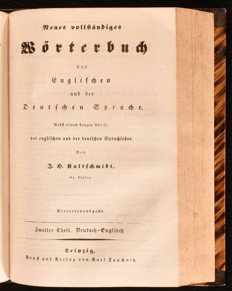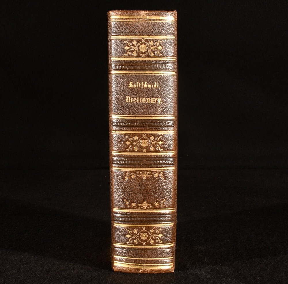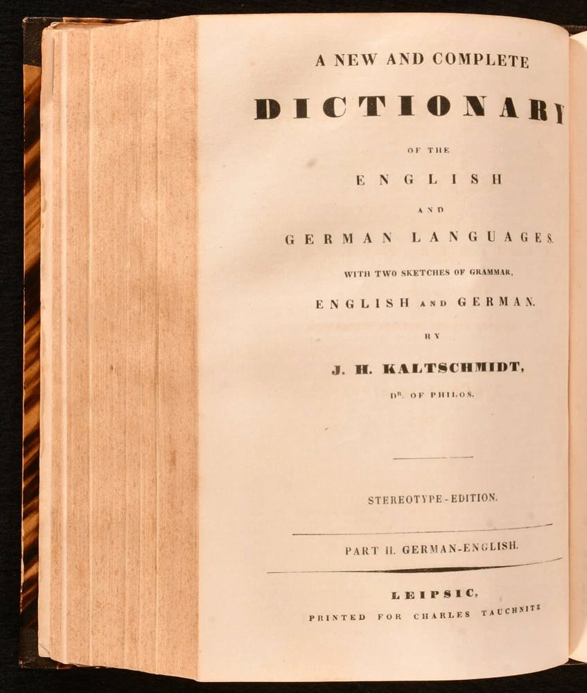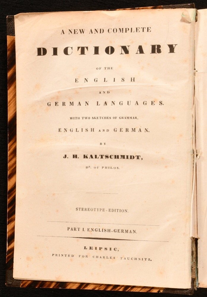 Click here to see our other books! A New and Complete Dictionary of the English and German Languages; Neues und Vollstandiges Worterbuch der Englischen und der Deutschen Sprache J. H. Kaltschmidt 1837 Charles Tauchnitz; Karl Tauchnitz : Leipsic; Leipzig 8" by 6" xxiv [1], 2-783 [6], vi-xviii [1], 2-514pp SUMMARY A smart copy of this German-English and English-German dictionary, in a half morocco binding. Leather Binding Overall Condition: Very Good This book weighs 1.5 KG when packed UK Postage: £ 3.99 US Postage: £ 23.99 EU Postage : £ 18.99 European Postage: £ 19.99 Asia Postage: £ 31.99 Worldwide Postage: £ 32.99 DESCRIPTION The three volumn stereotype edition of this work, edited by Jacob Heinrich Kaltschmidt. Two volumes in one, with the first part consisting of the English-German portion, and the second part containing the German-English part. With two title pages to each part - one in German and one in English - and individual pagination. Featuring also some information on rules for English and German grammar. Undated; dated 1837 via Jisc. CONDITION In a half morocco binding, with paper covered boards, and gilt detailing to spine. Light rubbing to boards, otherwise externally excellent. Front hinge strained, but firmly held. Internally, firmly bound, with the exception of second gathering of volume I, which is working loose, and volume II title page, which is detached and loosely inserted. Pages bright, with the odd spot and handling mark throughout, most concentrated to first and last few pages. Significant closed tears to page xv of volume I. Overall Condition: Very Good GLOSSARY OF TERMS Overall Condition (Dustwrapper condition rating is shown after that for the book itself, where a dustwrapper is present) Fine - Very well preserved copy showing very little wear Very Good Indeed - Only one or two minor faults, really a very attractive copy Very Good - Quite a wide term meaning no major faults but probably several smaller ones often expected given the age of the book, but still a respectable copy Good - Meaning not very good. Some more serious faults as will be described in the condition report under 'condition' Good Only - Meaning one or more faults that could really do with repair Fair - As with good only above but with other faults leaving a compromised copy even after repair Poor - Really bad and possibly seriously incomplete. We only sell books in this condition where their rarity or value makes them attractive none the less. Major defects will be described. GUARANTEE We offer a full money back guarantee on our descriptions. Please ask for details and conditions. We prefer PAYPAL. If you pay via PAYPAL we will post the item off the same or the next working day with the postage you have selected. Please note we cannot accept USD cheques