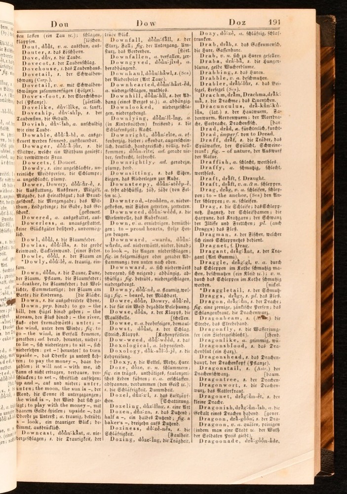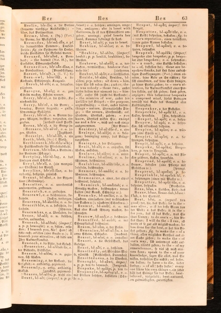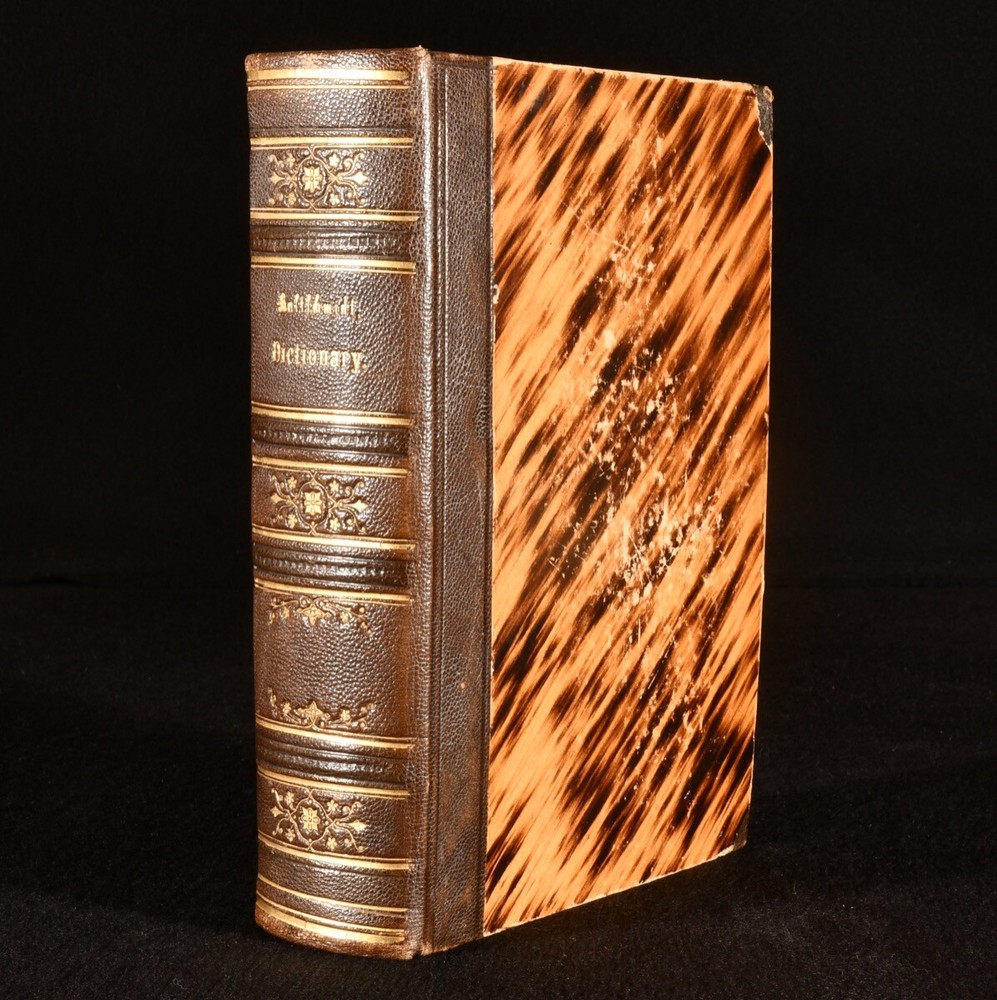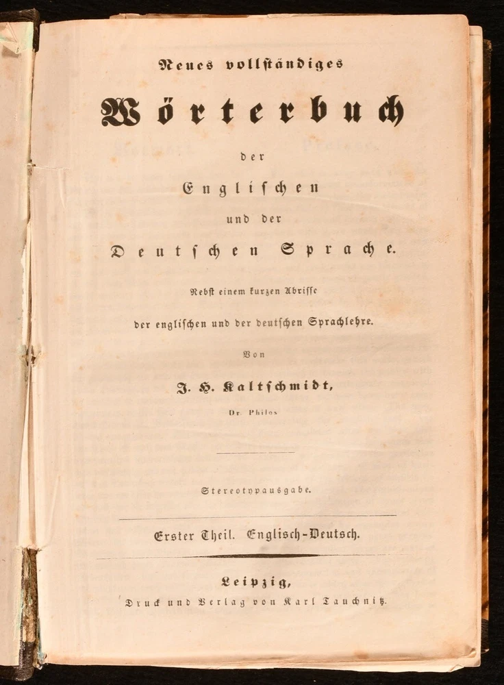 Click here to see our other books! A New and Complete Dictionary of the English and German Languages; Neues und Vollstandiges Worterbuch der Englischen und der Deutschen Sprache J. H. Kaltschmidt 1837 Charles Tauchnitz; Karl Tauchnitz : Leipsic; Leipzig 8" by 6" xxiv [1], 2-783 [6], vi-xviii [1], 2-514pp SUMMARY A smart copy of this German-English and English-German dictionary, in a half morocco binding. Leather Binding Overall Condition: Very Good This book weighs 1.5 KG when packed UK Postage: £ 3.99 US Postage: £ 23.99 EU Postage : £ 18.99 European Postage: £ 19.99 Asia Postage: £ 31.99 Worldwide Postage: £ 32.99 DESCRIPTION The three volumn stereotype edition of this work, edited by Jacob Heinrich Kaltschmidt. Two volumes in one, with the first part consisting of the English-German portion, and the second part containing the German-English part. With two title pages to each part - one in German and one in English - and individual pagination. Featuring also some information on rules for English and German grammar. Undated; dated 1837 via Jisc. CONDITION In a half morocco binding, with paper covered boards, and gilt detailing to spine. Light rubbing to boards, otherwise externally excellent. Front hinge strained, but firmly held. Internally, firmly bound, with the exception of second gathering of volume I, which is working loose, and volume II title page, which is detached and loosely inserted. Pages bright, with the odd spot and handling mark throughout, most concentrated to first and last few pages. Significant closed tears to page xv of volume I. Overall Condition: Very Good GLOSSARY OF TERMS Overall Condition (Dustwrapper condition rating is shown after that for the book itself, where a dustwrapper is present) Fine - Very well preserved copy showing very little wear Very Good Indeed - Only one or two minor faults, really a very attractive copy Very Good - Quite a wide term meaning no major faults but probably several smaller ones often expected given the age of the book, but still a respectable copy Good - Meaning not very good. Some more serious faults as will be described in the condition report under 'condition' Good Only - Meaning one or more faults that could really do with repair Fair - As with good only above but with other faults leaving a compromised copy even after repair Poor - Really bad and possibly seriously incomplete. We only sell books in this condition where their rarity or value makes them attractive none the less. Major defects will be described. GUARANTEE We offer a full money back guarantee on our descriptions. Please ask for details and conditions. We prefer PAYPAL. If you pay via PAYPAL we will post the item off the same or the next working day with the postage you have selected. Please note we cannot accept USD cheques