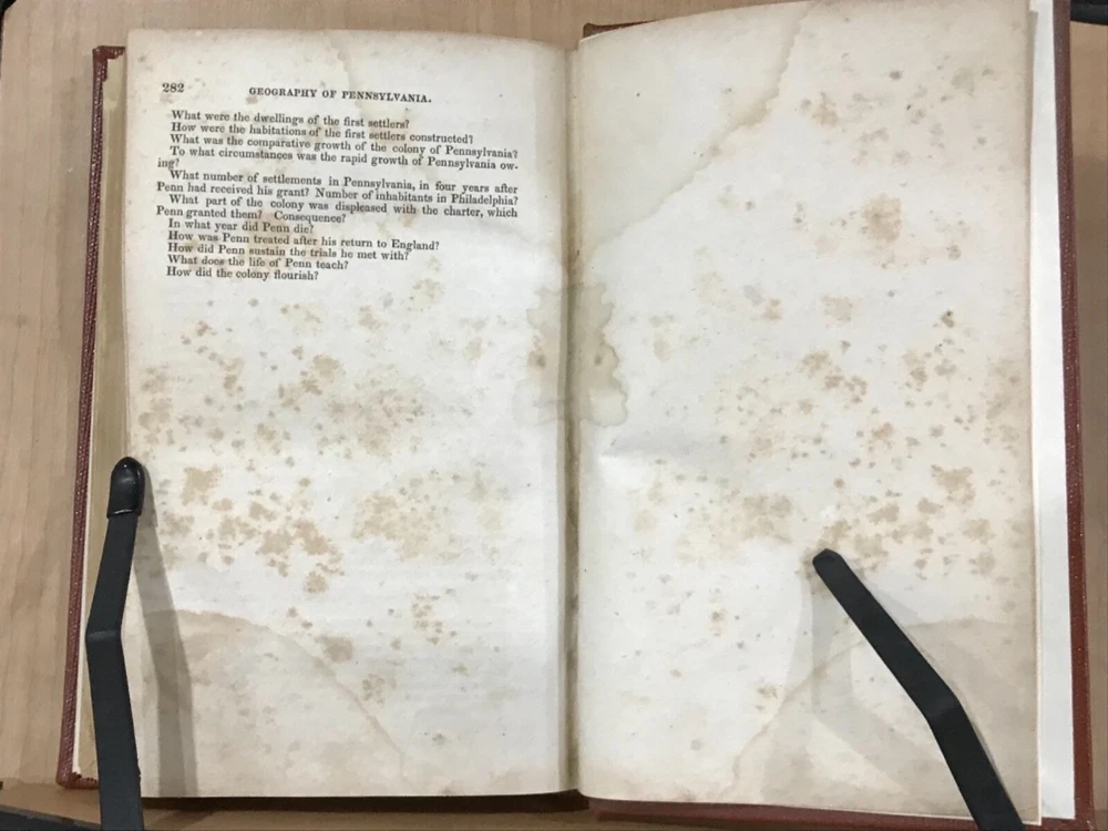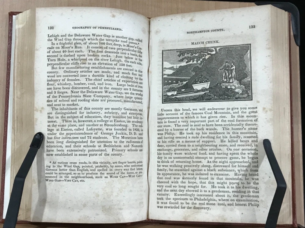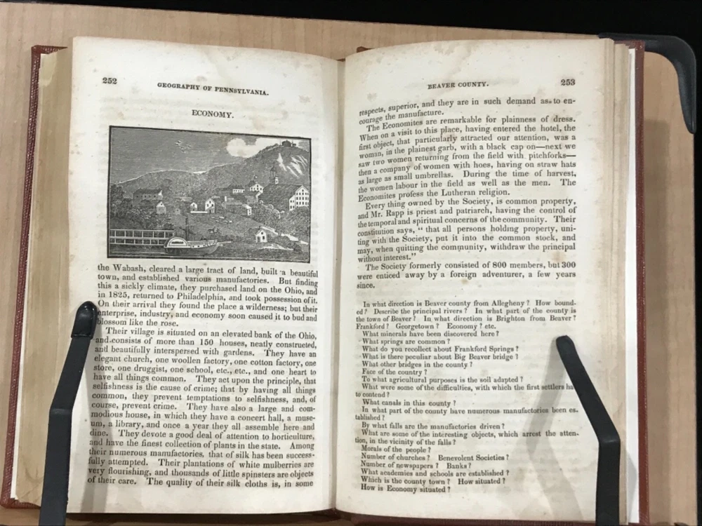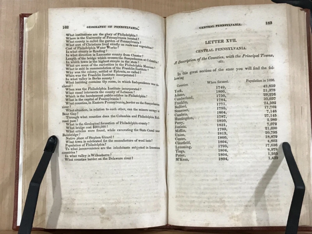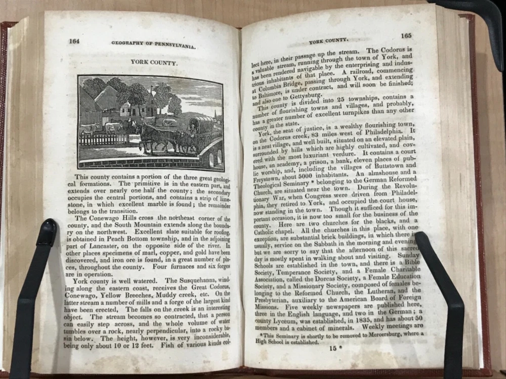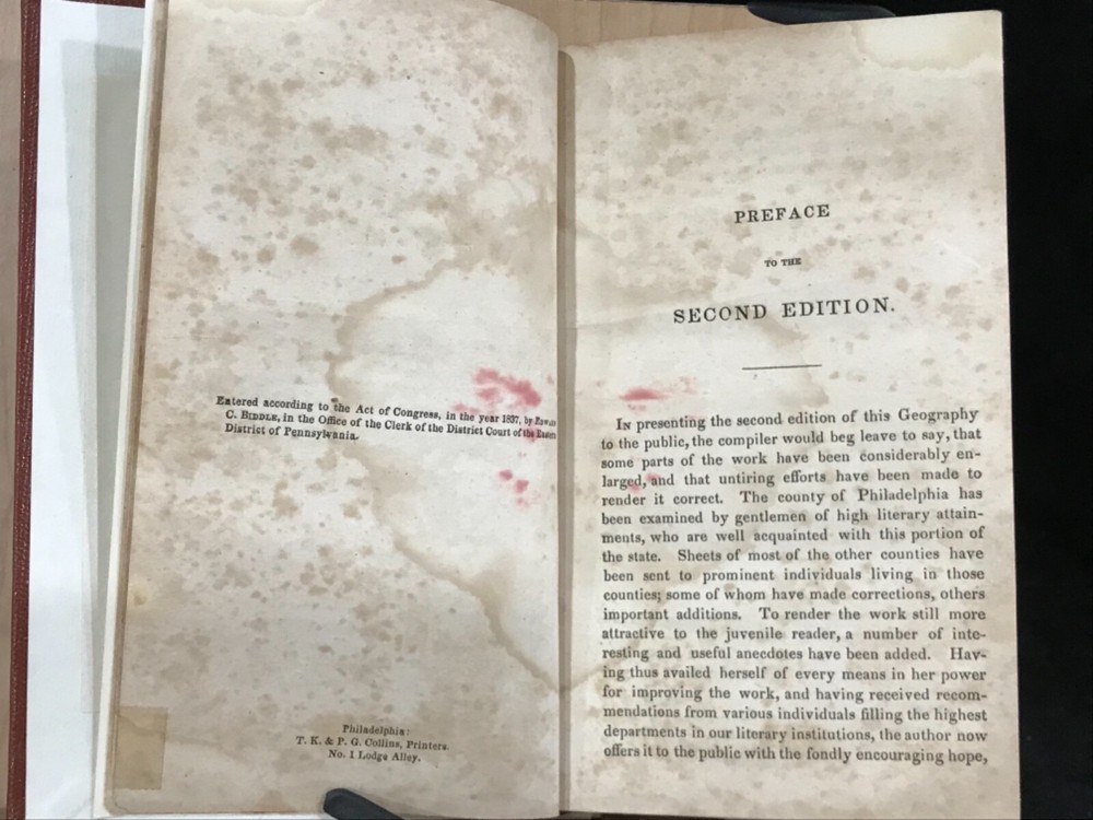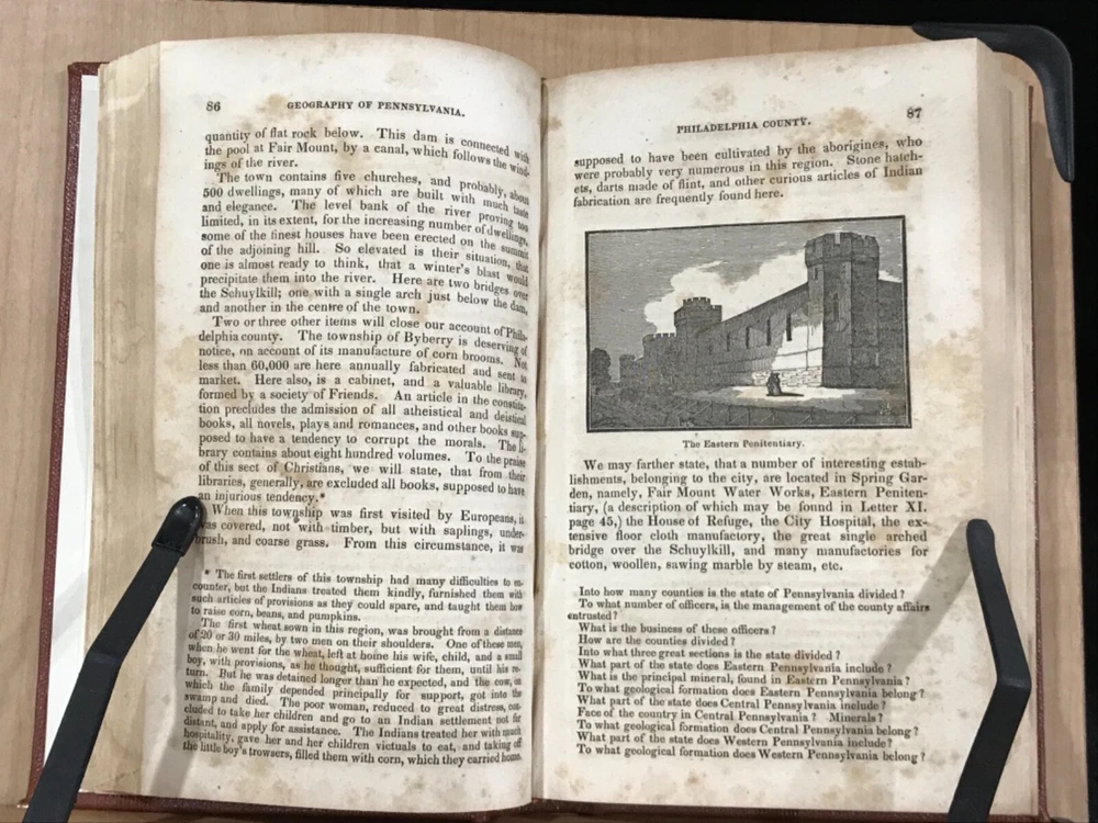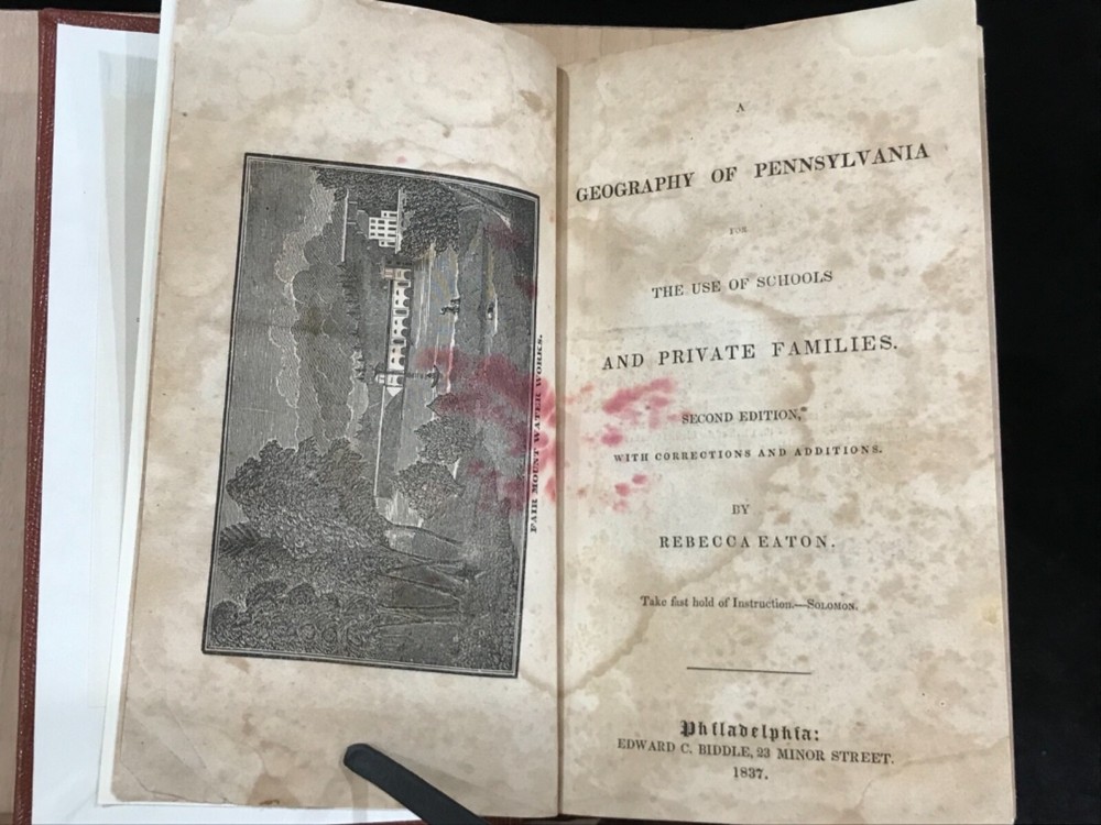 The earliest textbook whose subject is entirely Pennsylvania, Eaton’s work was first published in 1835. Several woodcuts at various chapters highlight some important aspect of the county or town being described. There is little information available about Rebecca Eaton; she was probably a teacher as in the earlier edition, she refers to her readers as “her pupils”. Frontispiece is of the Water Works in Fairmount Park while the other woodcuts serve as chapter headings. Has chapters on the various countries in Pennsylvania and questions at the end of each chapter to test knowledge. It has been very nicely re-bound by Wert Bookbinding in burnt orange with gilt lettering and the previous owner has left a bookplate inside the front. Very Good Condition: 12mo: modern binding in burnt orange with gilt lettering on spine done by Wert Bookbinding of Grantville, Pennsylvania: bookplate inside front: foxing and red stain to frontispiece of Water Works at Fairmount Park with repair to the edge on the verso and pencil “Book given to mother by Whetstones”: foxing throughout text: very neatly trimmed edges: text complete 282 pages: “A Geography of Pennsylvania for the Use of Schools and Private Families”: second edition with corrections and additions: Rebecca Eaton: Philadelphia: Edward C. Biddle publisher: T.K. & P.G. Collins, Printers: 1837 COLU1837ABDA