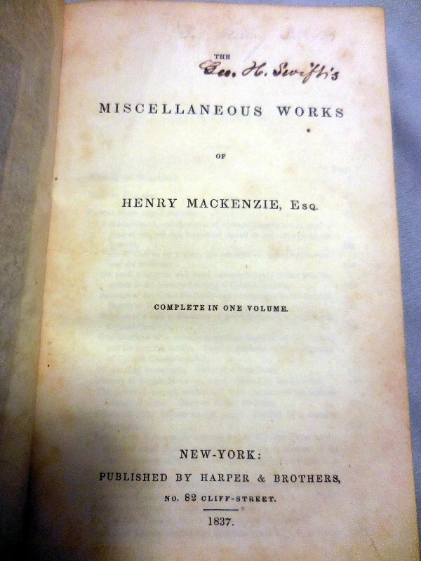1837 MISCELLANEOUS WORKS HENRY MACKENZIE~LEATHER~ILLUS~HB Henry Mackenzie ESQ (26 July 1745 - 14 January 1831) was a Scottish lawyer, novelist and writer. He was also known by the sobriquet "Addison of the North." Though largely remembered as an author his principal income came from his numerous legal roles, ending in (1804-1831) his post as Comptroller of Taxes for Scotland, a well-paid role which allowed him to indulge his interest in writing. MISCELLANEOUS WORKS BY HENRY MACKENZIE PUBLISHED BY HARPER & BROTHERS, 1837, BROWN LEATHER SPINE GILT DECORATIONS SPINE, MARBLED ENDPAPERS, 5" X 8", ILLUSTRATED FRONT PAGE, 512 PAGES. BOOK IS TIGHT, SEPARATED FRONT BOARD LIGHT FOXING, FAIR-GOOD CONDITION! FOR OVER 180 YEARS OLD! NO RESERVE! NO RESERVE! NO RESERVE! NO RESERVE! NO RESERVE! NO RESERVE! NO RESERVE! NO RESERVE! NO RESERVE! NO RESERVE! Postage/handling FREE anywhere in the U.S.A. (INSURANCE, DELIVERY CONFIRMATION WILL BE EXTRA AT BUYERS REQUEST) We will combine shipping for Auctions in the same week only! We accept payments from PayPal anyone with a Credit Card at PayPal. If you have any questions or don't understand anything in the Description please feel free to ask! Satisfaction guaranteed! Good Luck!