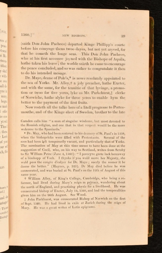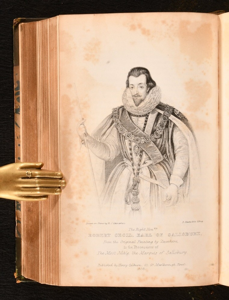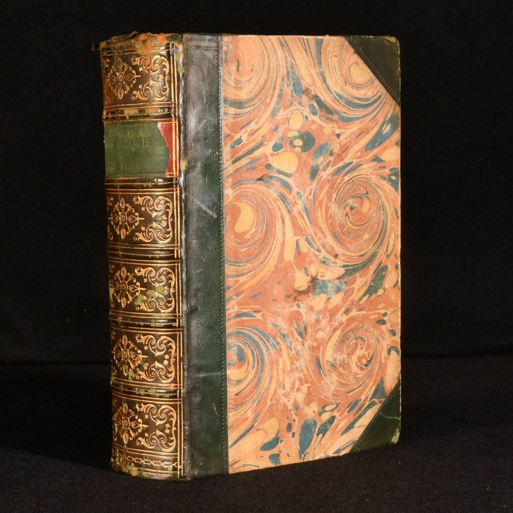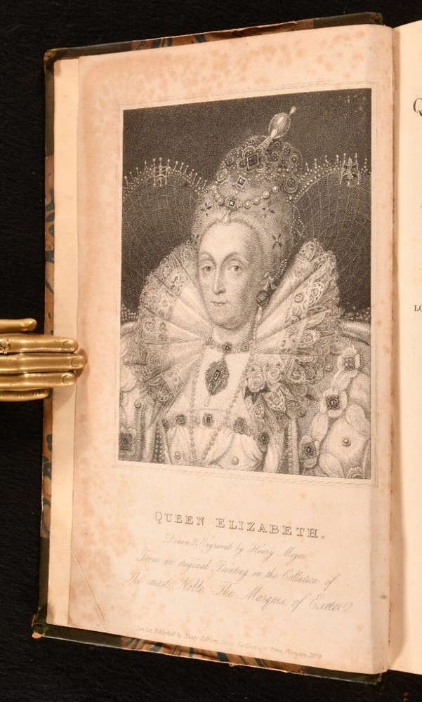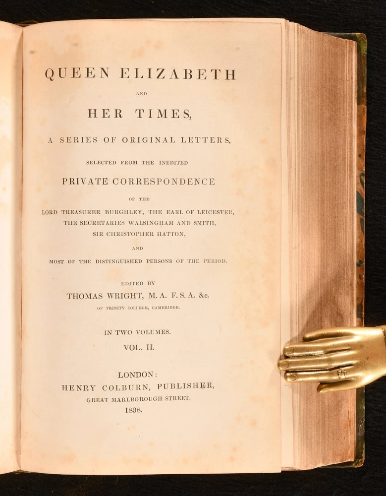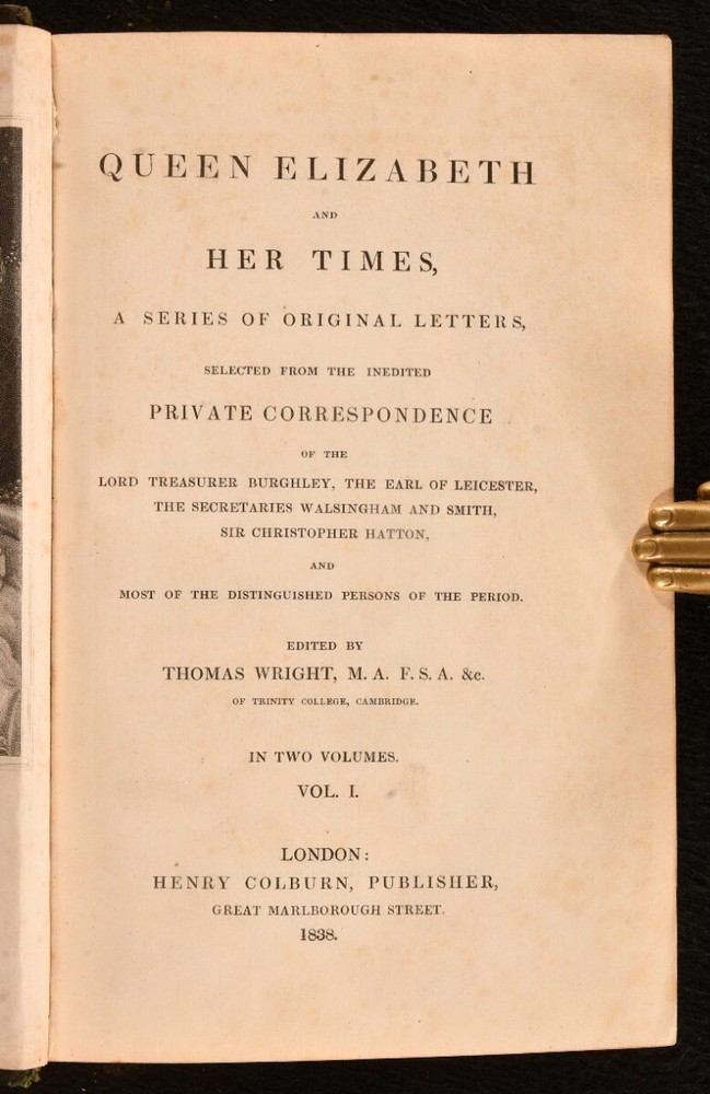 Click here to see our other books! Queen Elizabeth and Her Times, a Series of Original Letters, selected from the inedited Private Correspondence of the Lord Treasurer Burghley, the Earl of Leicester, the Secretaries Walsingham and Smith, Sir Christopher Hatton, and most of the Distinguished Persons of the Period Thomas Wright [ed.] 1838 Henry Colburn : London 8.5" by 5" xlvii, [1], 514; xix, 527, [1]pp. SUMMARY The collected correspondence of Queen Elizabeth I complete in two volumes. First Edition,Folding Plates,Illustrated,Leather Binding,Rebound Overall Condition: Good This book weighs 1.5 KG when packed UK Postage: £ 3.99 US Postage: £ 23.99 EU Postage : £ 18.99 European Postage: £ 19.99 Asia Postage: £ 31.99 Worldwide Postage: £ 32.99 DESCRIPTION The first edition of this work. Complete with two volumes bound in one. Biographical sketch of the life and times of Queen Elizabeth I compiled from a series of original letters from the private correspondence of the Lord Treasurer Burghley, the Earl of Leicester, the Secretaries Walsingham and Smith, Sir Christopher Hatton, and other distinguished people from her time. Selected and edited by antiquarian Thomas Wright. Illustrated with frontispiece to each volume and three further plates, of which two folding. Collated, complete. Folding plate with minor closed tear tape repaired by a previous owner. CONDITION Rebound in half calf over marbled boards, renewed plain endpapers, gilt tooling to spine. Externally with shelf wear, chipped to head of spine, substantial loss to spine title label, back strip rubbed and chipped. Previous ownership inscription to front pastedown, undated. Internally, firmly bound. Pages clean with minor spotting to odd leaf, particularly leaves of plates; pages otherwise generally very clean throughout. Overall Condition: Good GLOSSARY OF TERMS Overall Condition (Dustwrapper condition rating is shown after that for the book itself, where a dustwrapper is present) Fine - Very well preserved copy showing very little wear Very Good Indeed - Only one or two minor faults, really a very attractive copy Very Good - Quite a wide term meaning no major faults but probably several smaller ones often expected given the age of the book, but still a respectable copy Good - Meaning not very good. Some more serious faults as will be described in the condition report under 'condition' Good Only - Meaning one or more faults that could really do with repair Fair - As with good only above but with other faults leaving a compromised copy even after repair Poor - Really bad and possibly seriously incomplete. We only sell books in this condition where their rarity or value makes them attractive none the less. Major defects will be described. GUARANTEE We offer a full money back guarantee on our descriptions. Please ask for details and conditions. We prefer PAYPAL. If you pay via PAYPAL we will post the item off the same or the next working day with the postage you have selected. Please note we cannot accept USD cheques