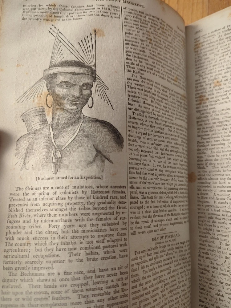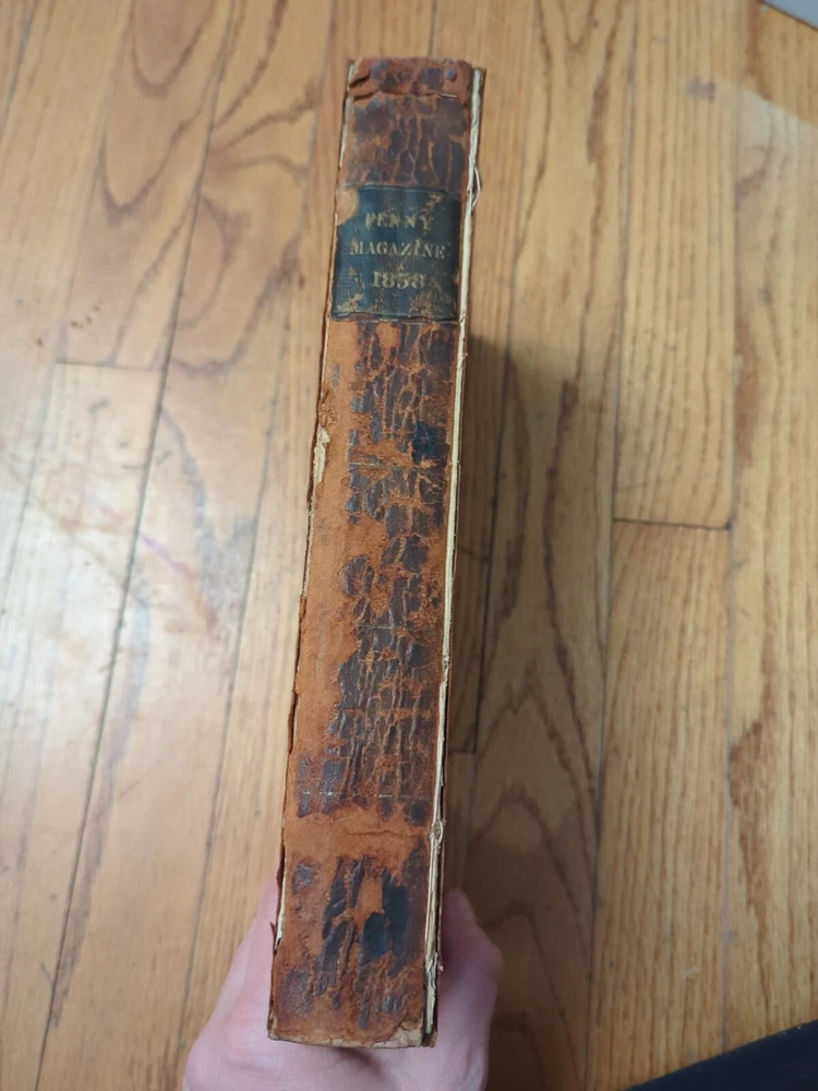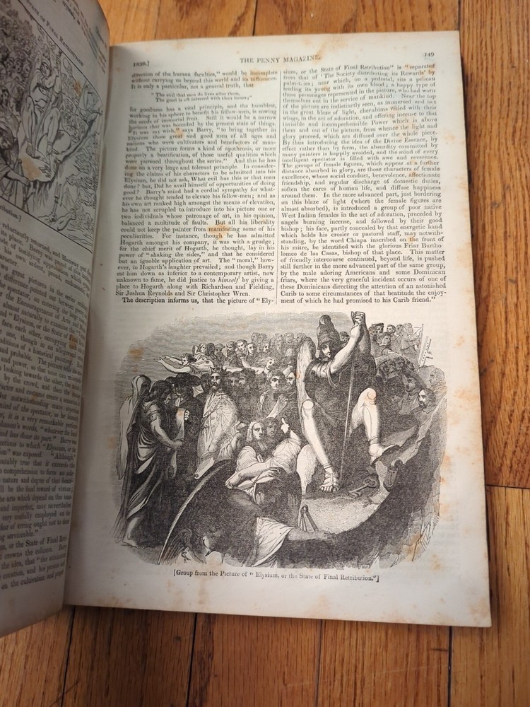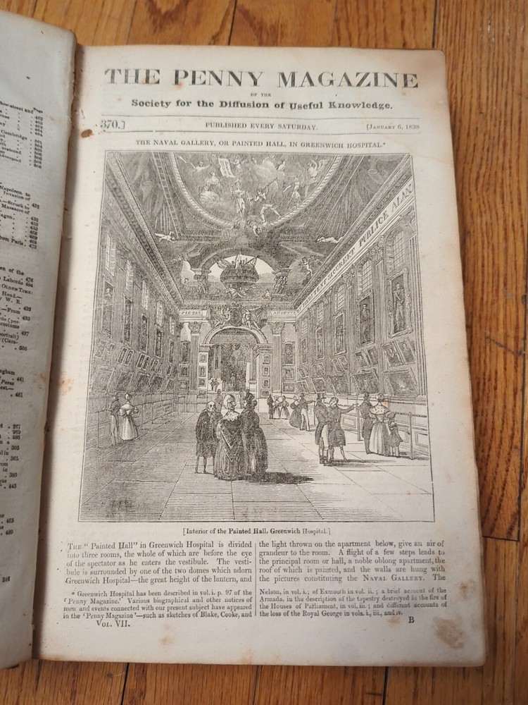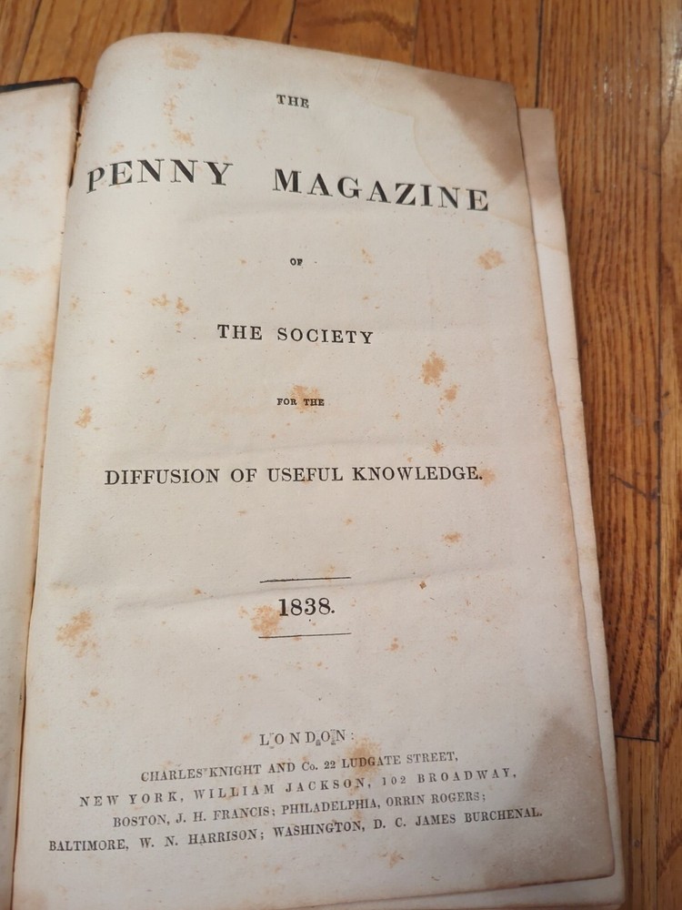 1838 The Penny Magazine (Vol VII bound Jan-Dec 1838). Some chipping and cracked hinges. Still tightly bound. See photos. Illustrated....