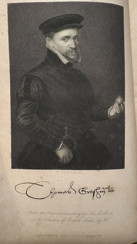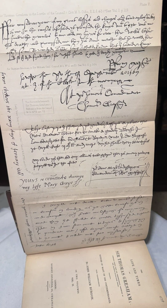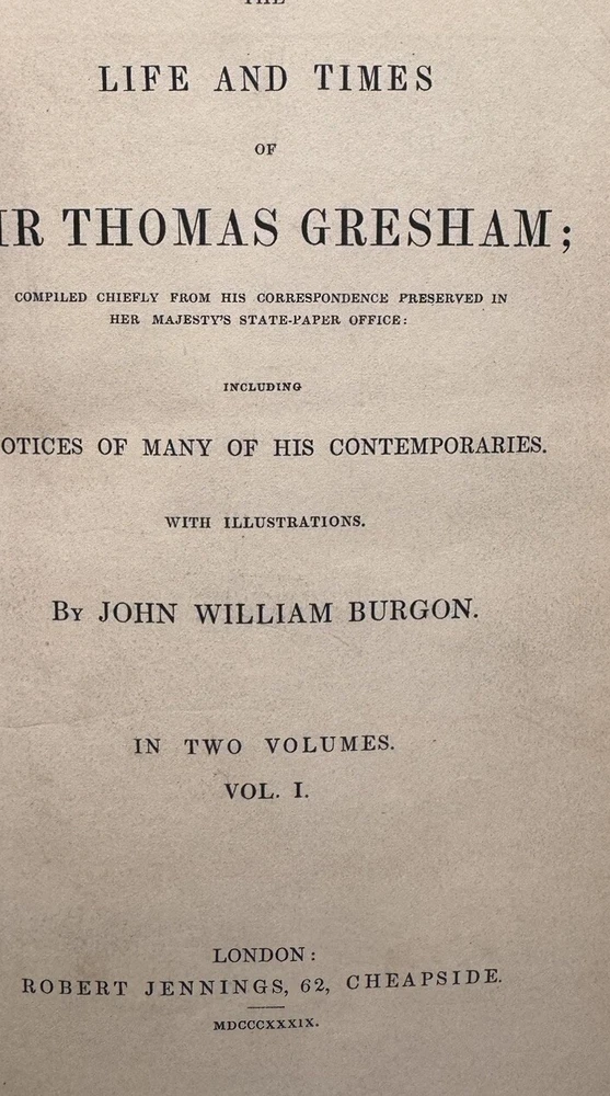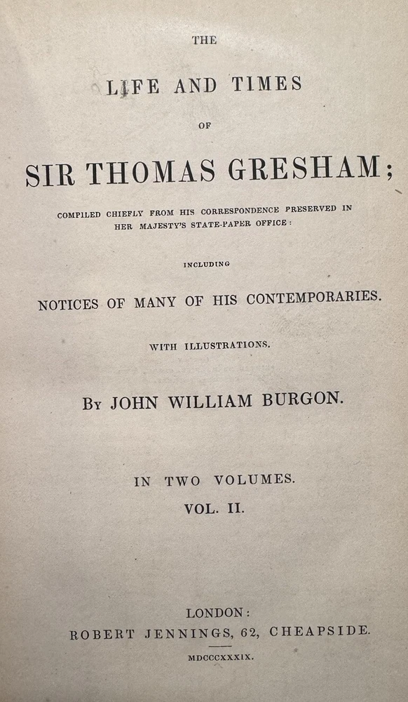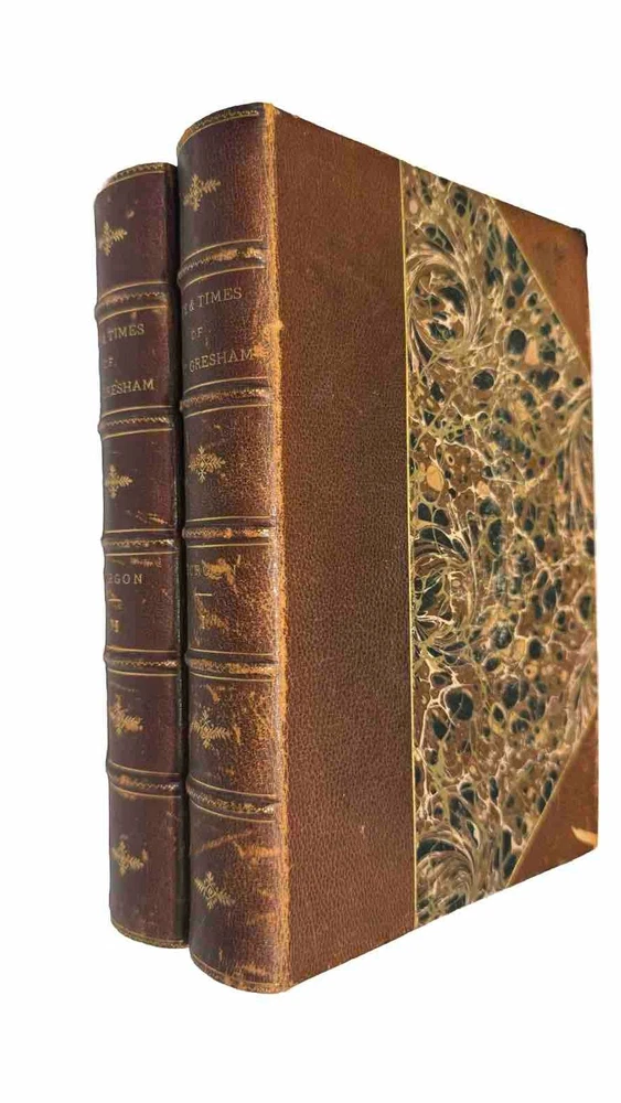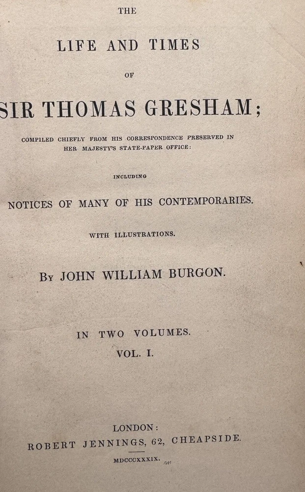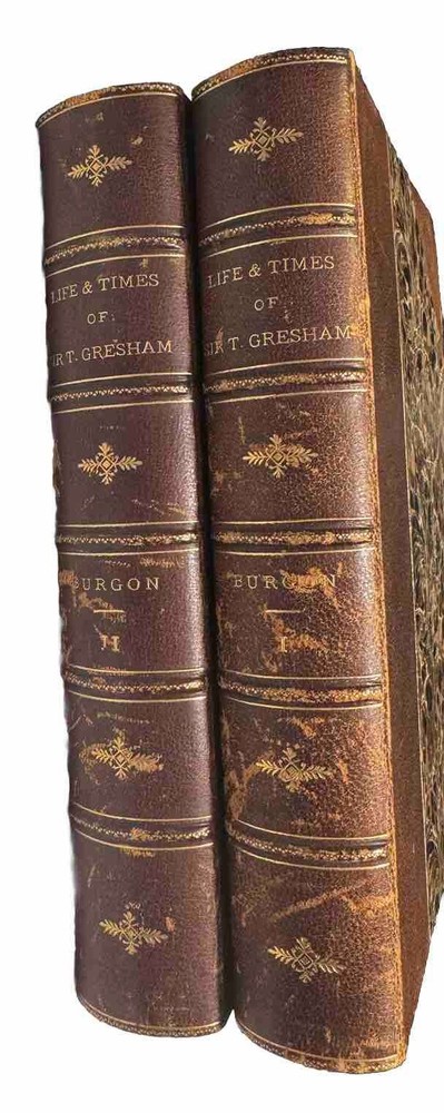 The Life and Times of Sir Thomas Gresham: Compiled Chiefly From His Correspondence Preserved in Her Majesty’s State-Paper Office by John William Burgon. 2 VOLUMES, COLLATED & COMPLETE, IN VERY GOOD OR BETTER CONDITION This is a fascinating biography of the 16th century merchant who founded The Royal Exchange, the center of commerce for the UK for finance, the exchanging of goods and services and later stocks. He was an important representative of Queen Elizabeth I. He is known for “Gresham’s Law” (bad money drives out good money). His ingenious financial acumen helped the Crown remain solvent during precarious times when quite the debt had been accumulated. Published in 1839 by Robert Jennings in London. First edition. Octavo, 8.75” x 6.” Fine binding: contemporary chocolate brown 3/4 morocco leather over marbled paper; covers with single fillets in gilt; spine with five raised gilded bands with gilt lettering and emblems. Top edge gilt. Marbled endpapers. Illustrated with several chapter head and tail pieces and plates. Frontispiece of Sir Thomas Gresham in Volume I. Fold-out facsimile letter in Volume II. CONDITION DESCRIPTION: VERY GOOD Each volume is in Very Good or better antiquarian condition, particularly since the books are 185-years-old. Firmly bound with square bindings and firm hinges and joints. Moderate rubbing to leather (particularly the spines and corners) and shelf wear commensurate with age. Text block is generally quite clean and bright with mild age-toned pages, very little foxing (mostly on the endpapers and near plates, per usual). Some waviness and creasing to several pages. The infrequent smudge, small page tear or other sign of finger handling. Former owner bookplate/stamp on rear pastedown of each volume. Overall, a very good antique first edition - the highest grade on the market as of posting. Please see pictures as they are an important part of the condition description. As a fellow book collector, I know how frustrating it can be when items aren’t accurately described or poorly packaged for shipping. That is why I (1) take a lot of pictures and try to describe condition issues as accurately as possible and (2) pack your book purchases with the utmost care before shipping. I have been selling and buying on eBay for over 10 years and have a 100% satisfaction rating, and offer a 100% satisfaction guarantee 30-day return policy. Please follow me as I have thousands of highly collectible books to list in the coming weeks and months!