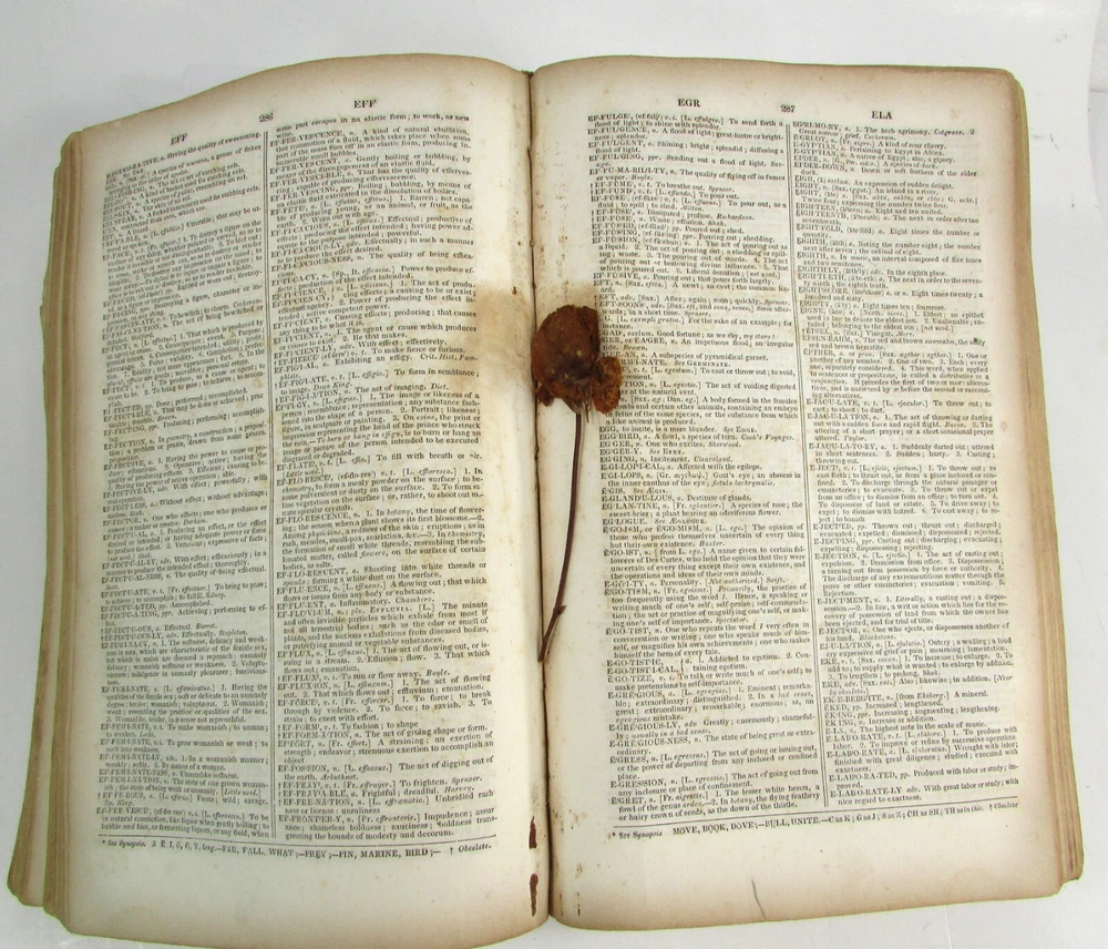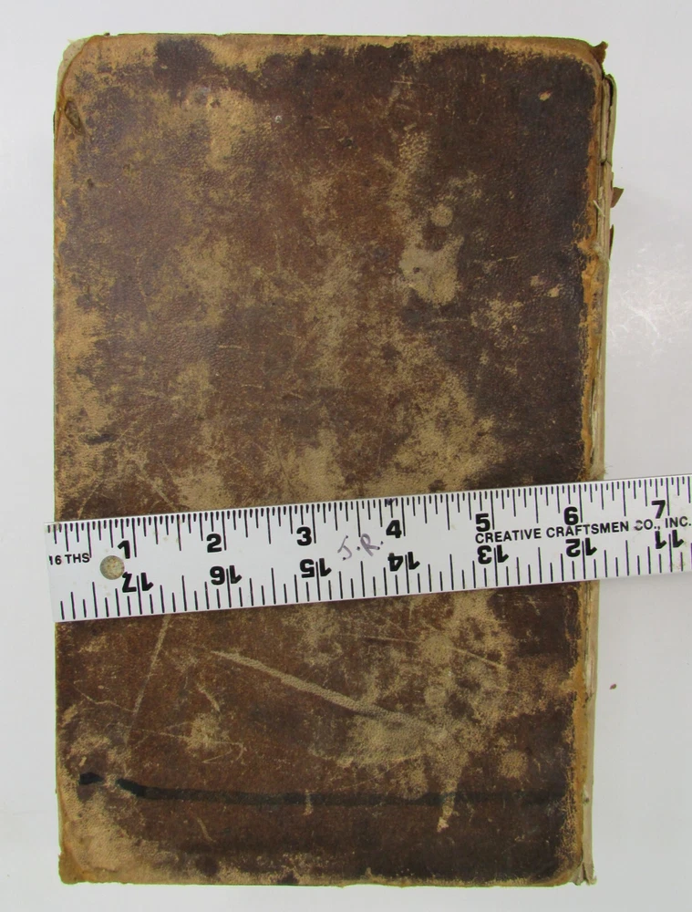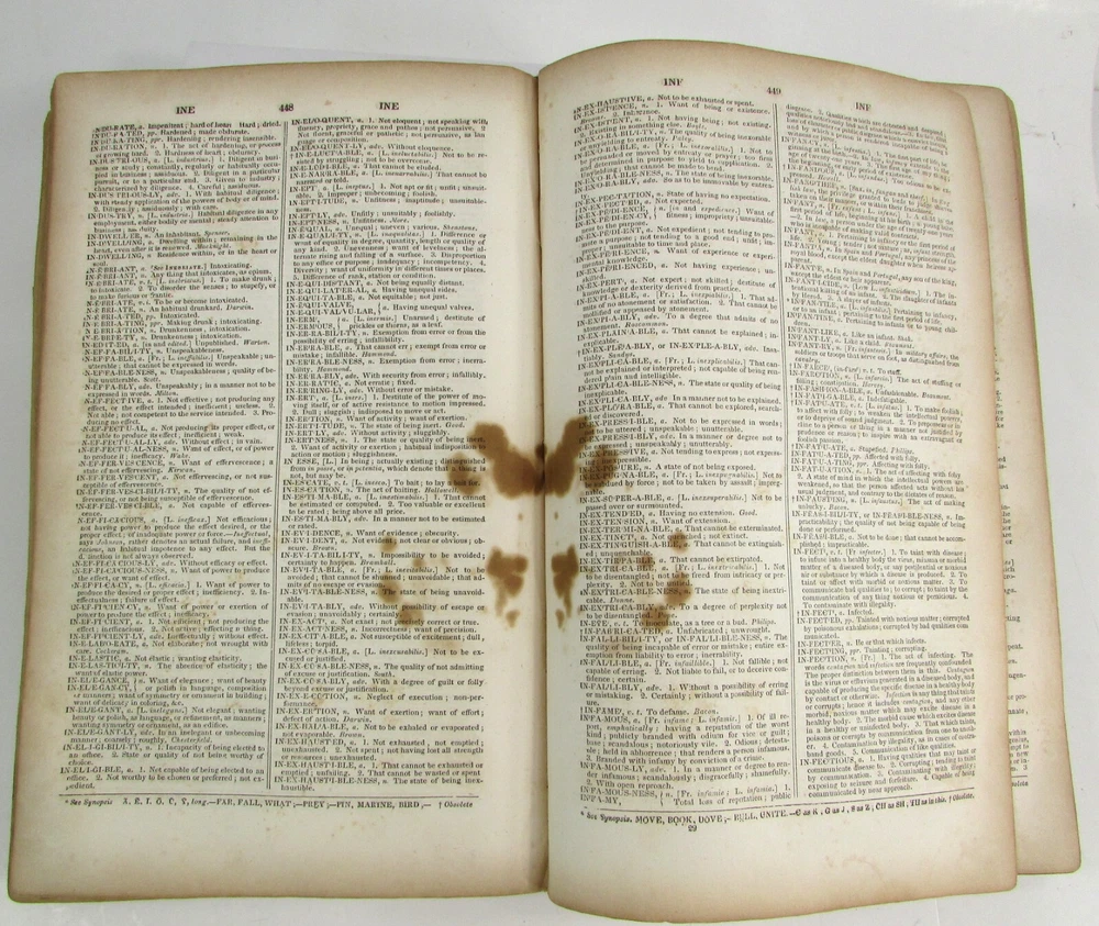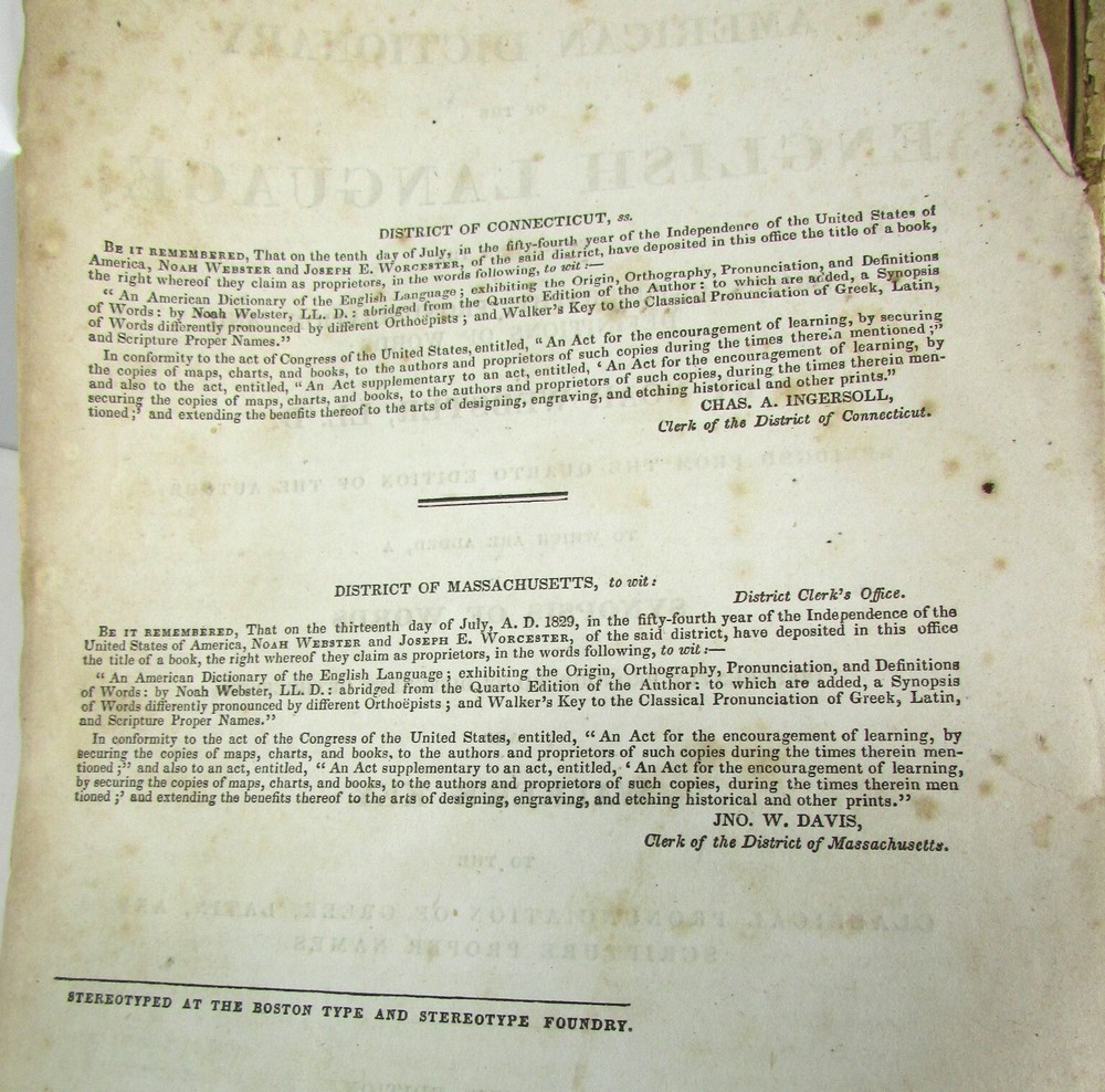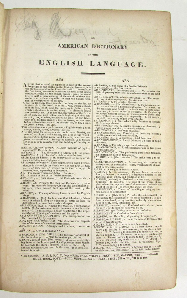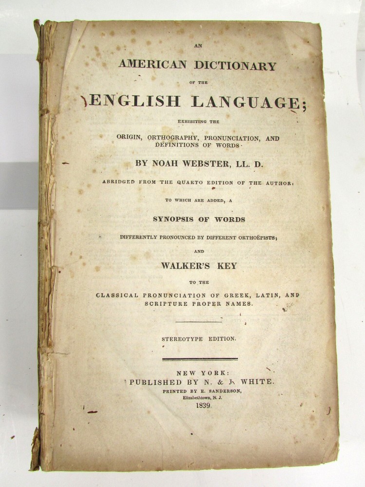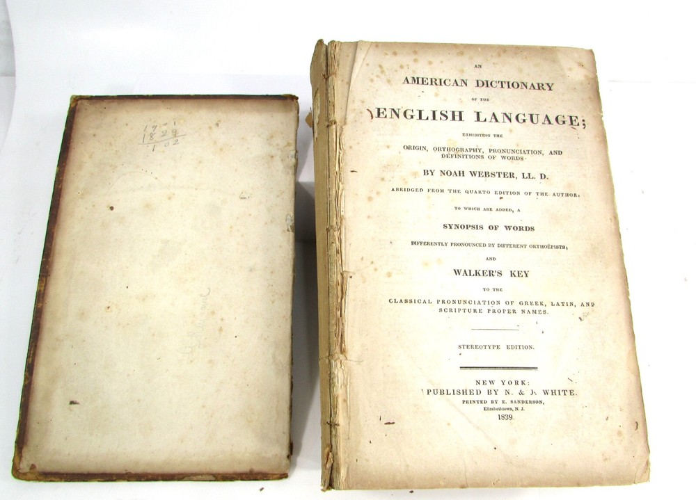 An American Dictionary of the English Language : Exhibiting the Origin, Orthography, Pronunciation, and Definitions of Words / by NOAH WEBSTER ; abridged from the quarto edition of the author, to which are added, a synopsis of words differently pronounced by different orthoëpists ; and WALKER'S KEY to the classical pronunciation of Greek, Latin, and Scripture proper names. 1839 Abridged from the quarto edition Stereotype Edition 1011 Pages Condition: A hardcover book bound in full brown leather. Acceptable condition, considering its age. Covers are heavily scuffed all over; the spine is missing. Front cover is detached and back cover held on by single string . Front end paper/s missing. Rear end paper has several early owners' pencil notations. Pages have varying degrees of foxing and stains, many from pressed flowers. Major issues are shown in photos. "Spatter" stain begins small page 432, increases then decreases till about page 460. Tanned edges. All photos are of actual book and are part of the description, please use for purchase guidance. If any questions or concerns please ask before purchase. Depending on weather, may come signature to avoid floods, hurricanes etc.