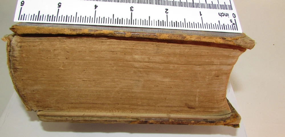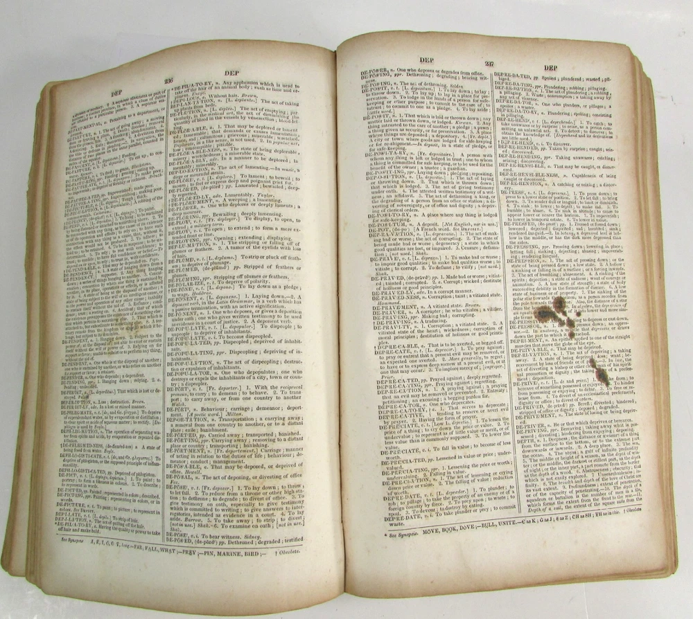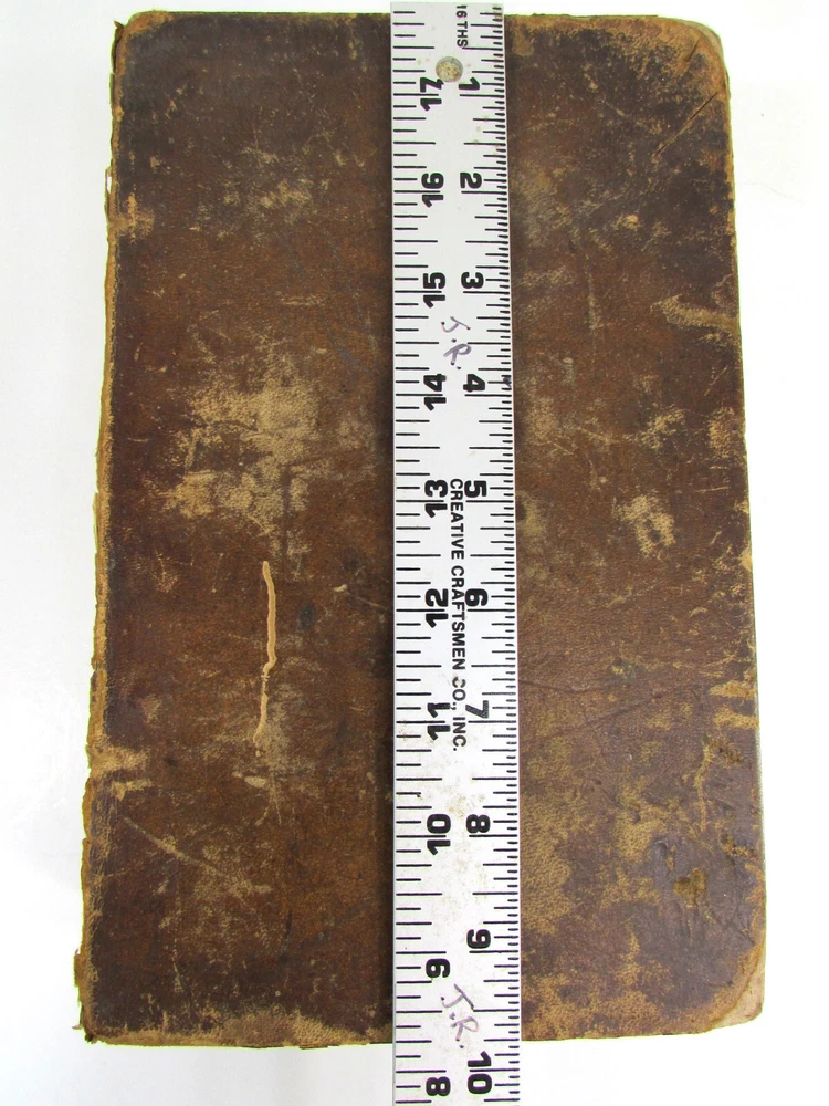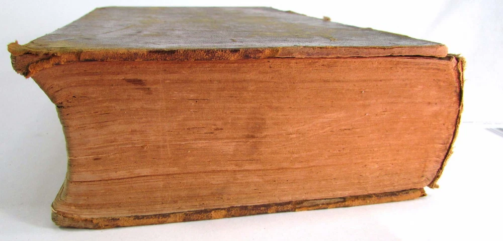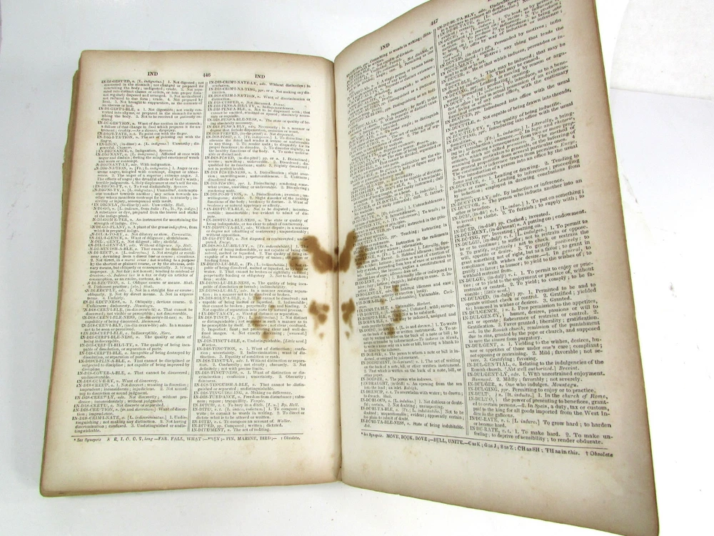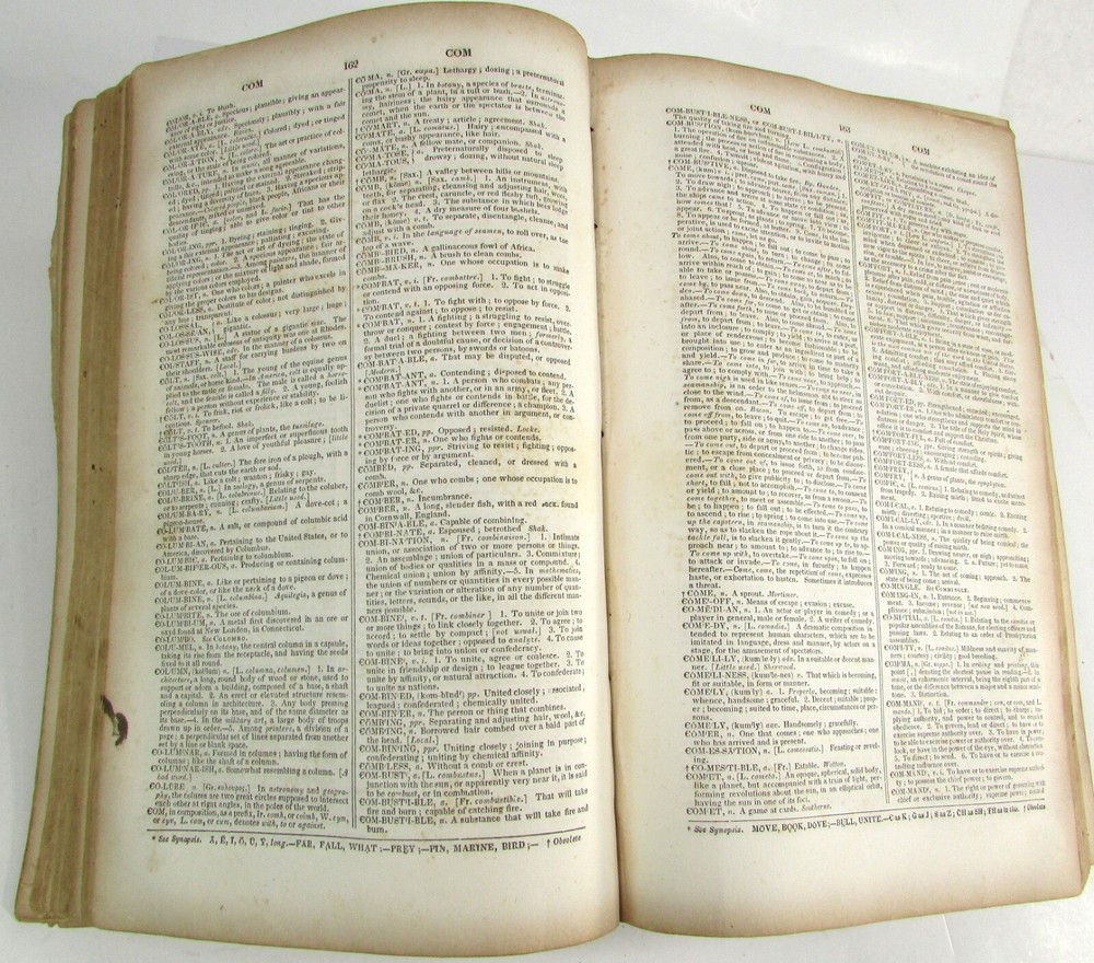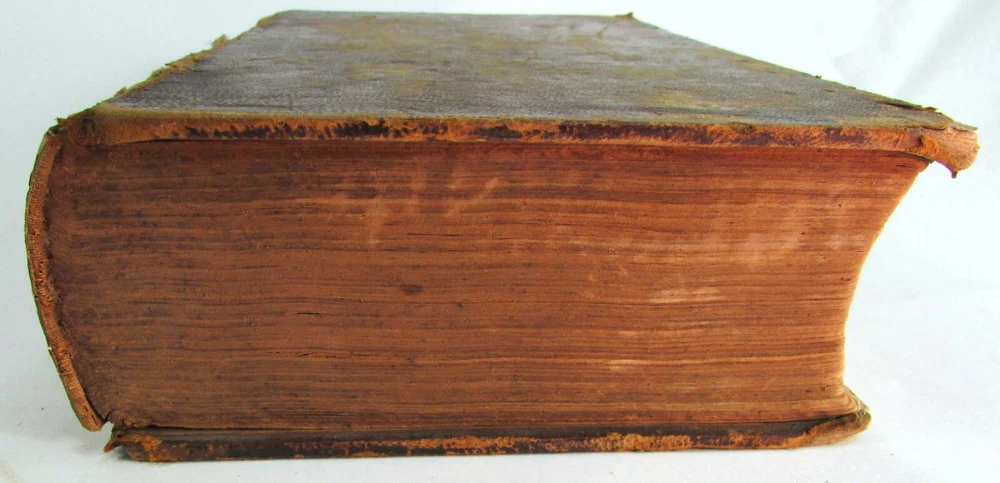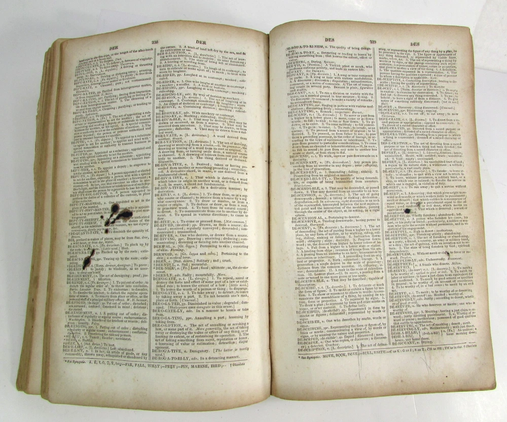 An American Dictionary of the English Language : Exhibiting the Origin, Orthography, Pronunciation, and Definitions of Words / by NOAH WEBSTER ; abridged from the quarto edition of the author, to which are added, a synopsis of words differently pronounced by different orthoëpists ; and WALKER'S KEY to the classical pronunciation of Greek, Latin, and Scripture proper names. 1839 Abridged from the quarto edition Stereotype Edition 1011 Pages Condition: A hardcover book bound in full brown leather. Acceptable condition, considering its age. Covers are heavily scuffed all over; the spine is missing. Front cover is detached and back cover held on by single string . Front end paper/s missing. Rear end paper has several early owners' pencil notations. Pages have varying degrees of foxing and stains, many from pressed flowers. Major issues are shown in photos. "Spatter" stain begins small page 432, increases then decreases till about page 460. Tanned edges. All photos are of actual book and are part of the description, please use for purchase guidance. If any questions or concerns please ask before purchase. Depending on weather, may come signature to avoid floods, hurricanes etc.