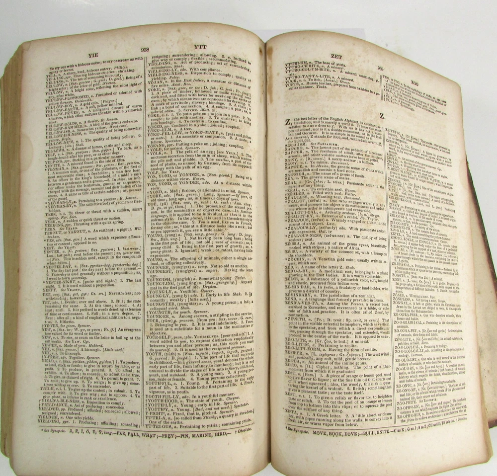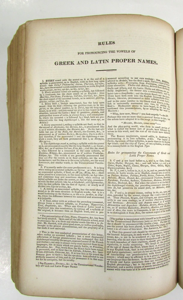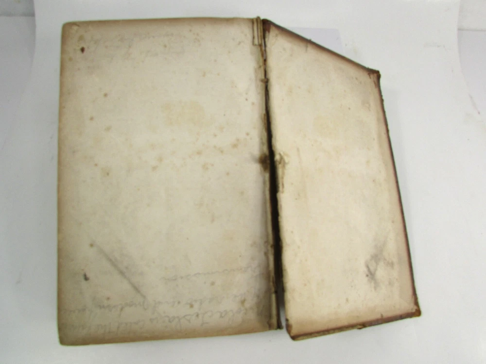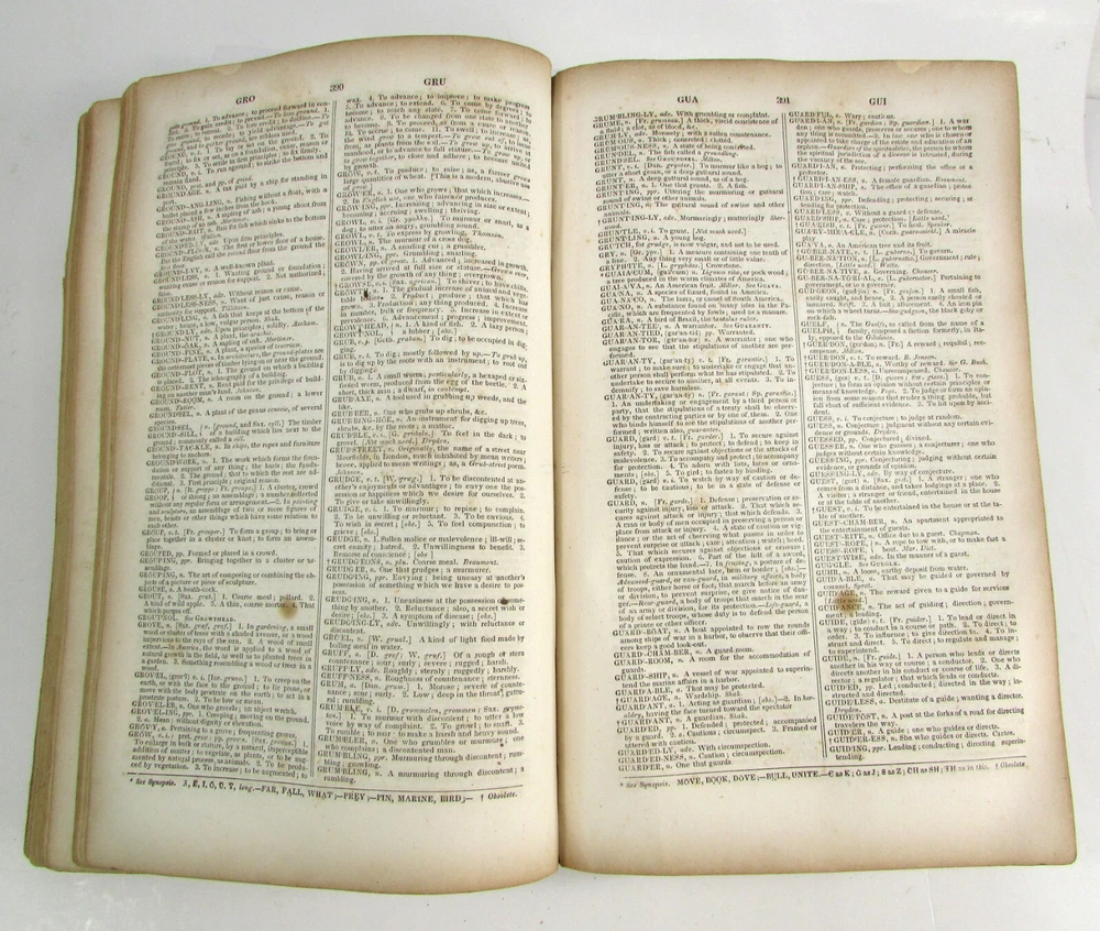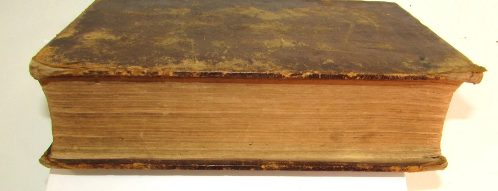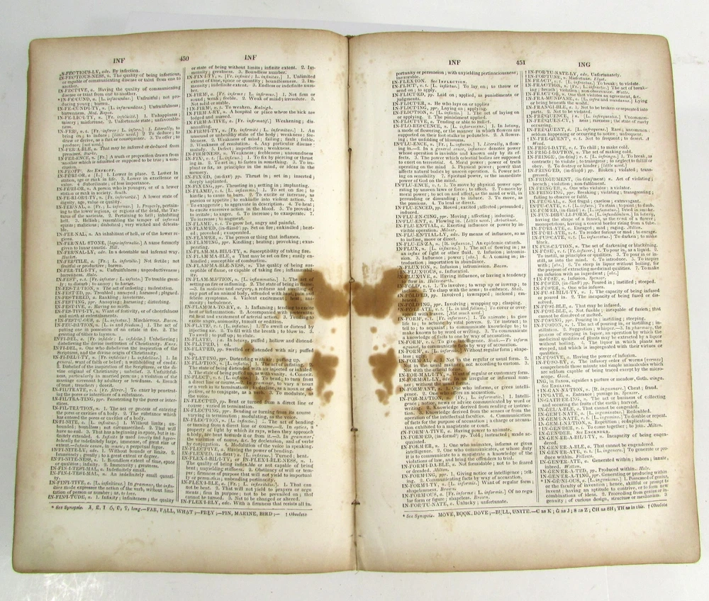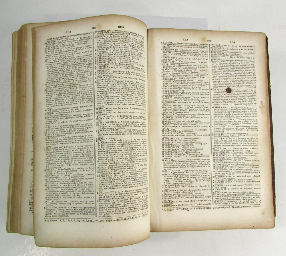 An American Dictionary of the English Language : Exhibiting the Origin, Orthography, Pronunciation, and Definitions of Words / by NOAH WEBSTER ; abridged from the quarto edition of the author, to which are added, a synopsis of words differently pronounced by different orthoëpists ; and WALKER'S KEY to the classical pronunciation of Greek, Latin, and Scripture proper names. 1839 Abridged from the quarto edition Stereotype Edition 1011 Pages Condition: A hardcover book bound in full brown leather. Acceptable condition, considering its age. Covers are heavily scuffed all over; the spine is missing. Front cover is detached and back cover held on by single string . Front end paper/s missing. Rear end paper has several early owners' pencil notations. Pages have varying degrees of foxing and stains, many from pressed flowers. Major issues are shown in photos. "Spatter" stain begins small page 432, increases then decreases till about page 460. Tanned edges. All photos are of actual book and are part of the description, please use for purchase guidance. If any questions or concerns please ask before purchase. Depending on weather, may come signature to avoid floods, hurricanes etc.