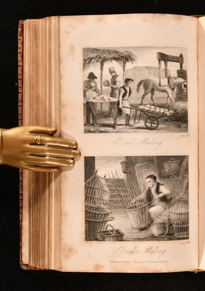 Click here to see our other books! Scenes of Commerce, by Land and Sea; or, "Where Does it Come From?" Rev. Isaac Taylor 1839 John Harris : London 7" by4.5" viii, 396pp. SUMMARY A decorative full calf copy of this fascinating work by Rev. Isaac Taylor, featuring 66 beautiful engraved plates. Illustrated,Leather Binding Overall Condition: Good This book weighs 0.75 KG when packed UK Postage: £ 3.99 US Postage: £ 19.99 EU Postage : £ 15.99 European Postage: £ 16.99 Asia Postage: £ 21.99 Worldwide Postage: £ 25.99 DESCRIPTION Third edition. In a smart full calf binding with gilt detail and a gilt fore edge. Features 23 plates, with sixty-six monochrome engravings. Collated complete. A fascinating educational book about the manufacture of different materials, including accounts of agriculture, shipbuilding and mining. Includes a publishers advertisement and preface. With the previous owners inscription from Free Grammar School, Exeter, dated 1839. CONDITION In a full calf binding with gilt detail. Externally generally smart with rubbing to extremities and marks to spine. Hinges slightly strained but firm. Contemporary ink inscription on front blank. Internally, firmly bound. Pages generally bright and clean with just the odd spot. Heavier spotting on the plates. Overall Condition: Good GLOSSARY OF TERMS Overall Condition (Dustwrapper condition rating is shown after that for the book itself, where a dustwrapper is present) Fine - Very well preserved copy showing very little wear Very Good Indeed - Only one or two minor faults, really a very attractive copy Very Good - Quite a wide term meaning no major faults but probably several smaller ones often expected given the age of the book, but still a respectable copy Good - Meaning not very good. Some more serious faults as will be described in the condition report under 'condition' Good Only - Meaning one or more faults that could really do with repair Fair - As with good only above but with other faults leaving a compromised copy even after repair Poor - Really bad and possibly seriously incomplete. We only sell books in this condition where their rarity or value makes them attractive none the less. Major defects will be described. GUARANTEE We offer a full money back guarantee on our descriptions. Please ask for details and conditions. We prefer PAYPAL. If you pay via PAYPAL we will post the item off the same or the next working day with the postage you have selected. Please note we cannot accept USD cheques