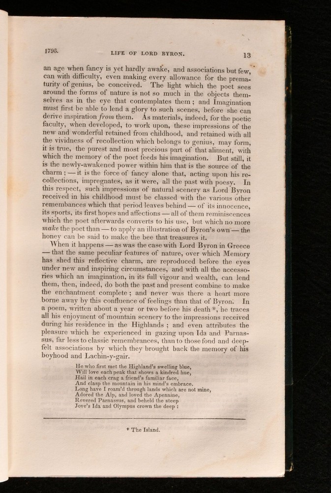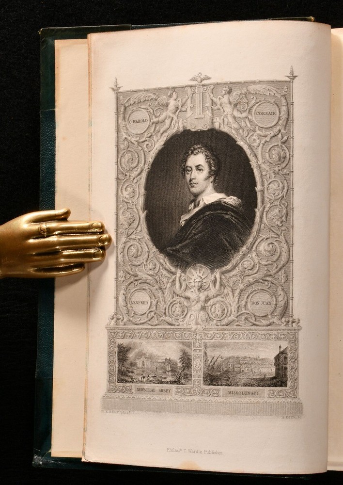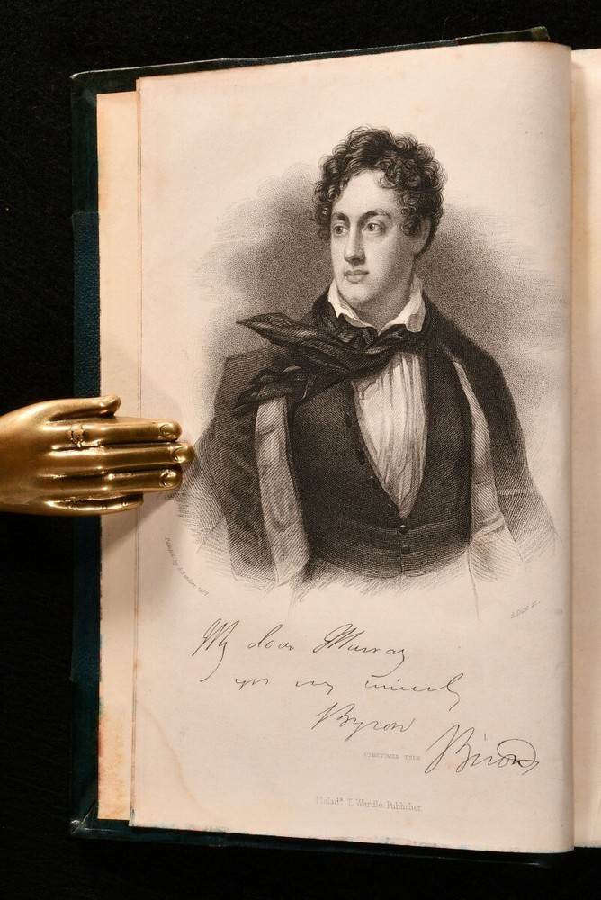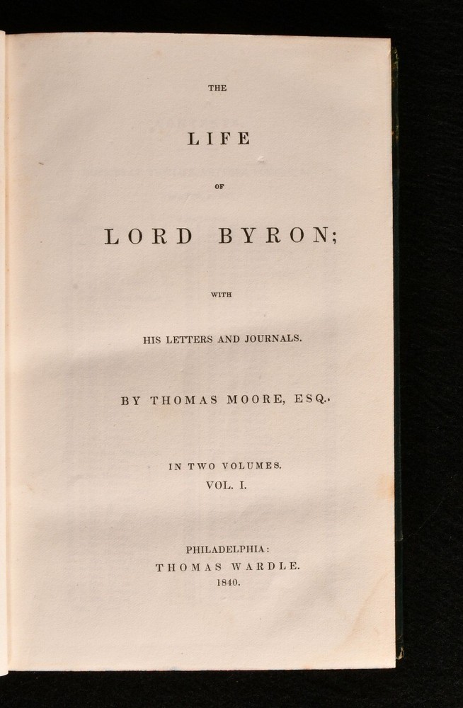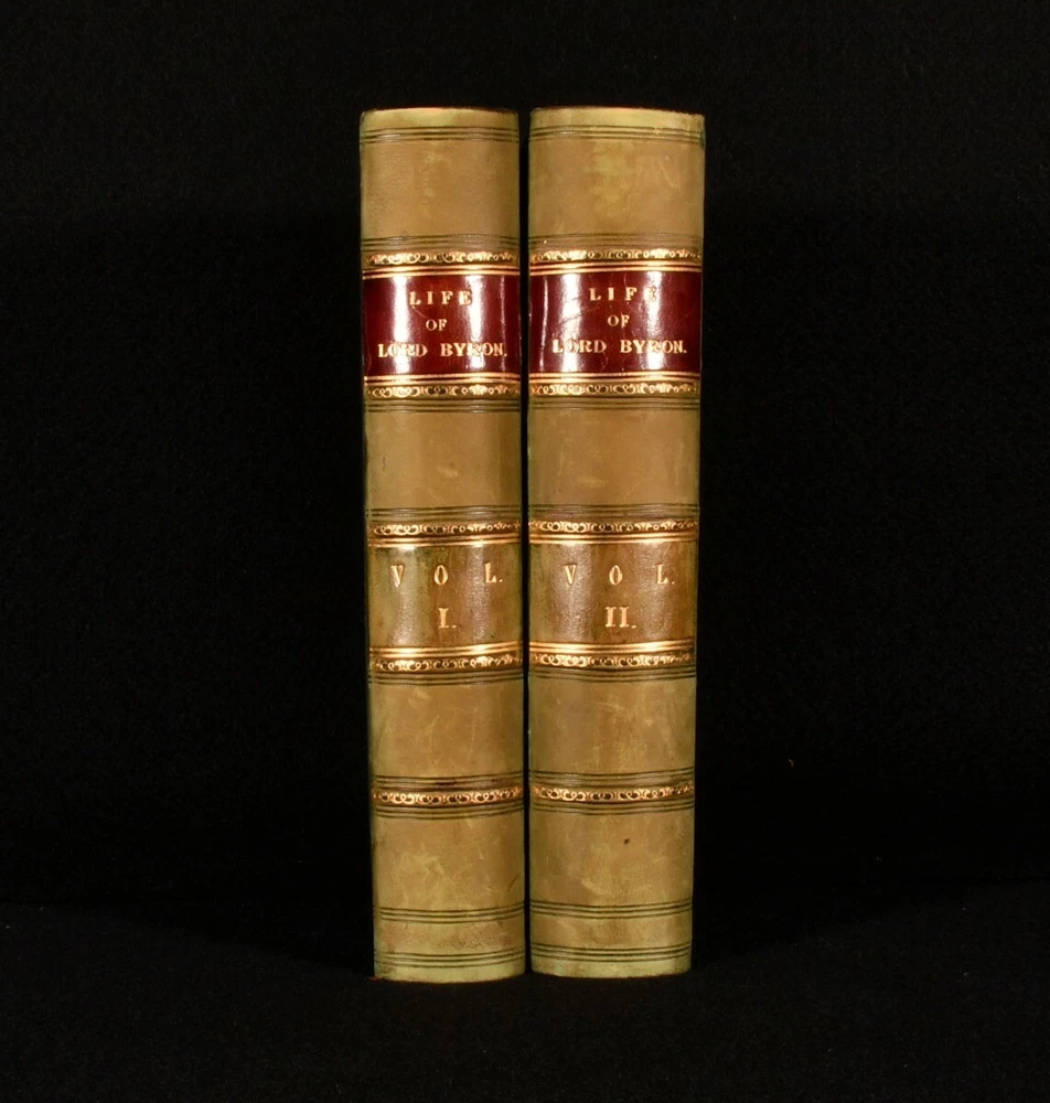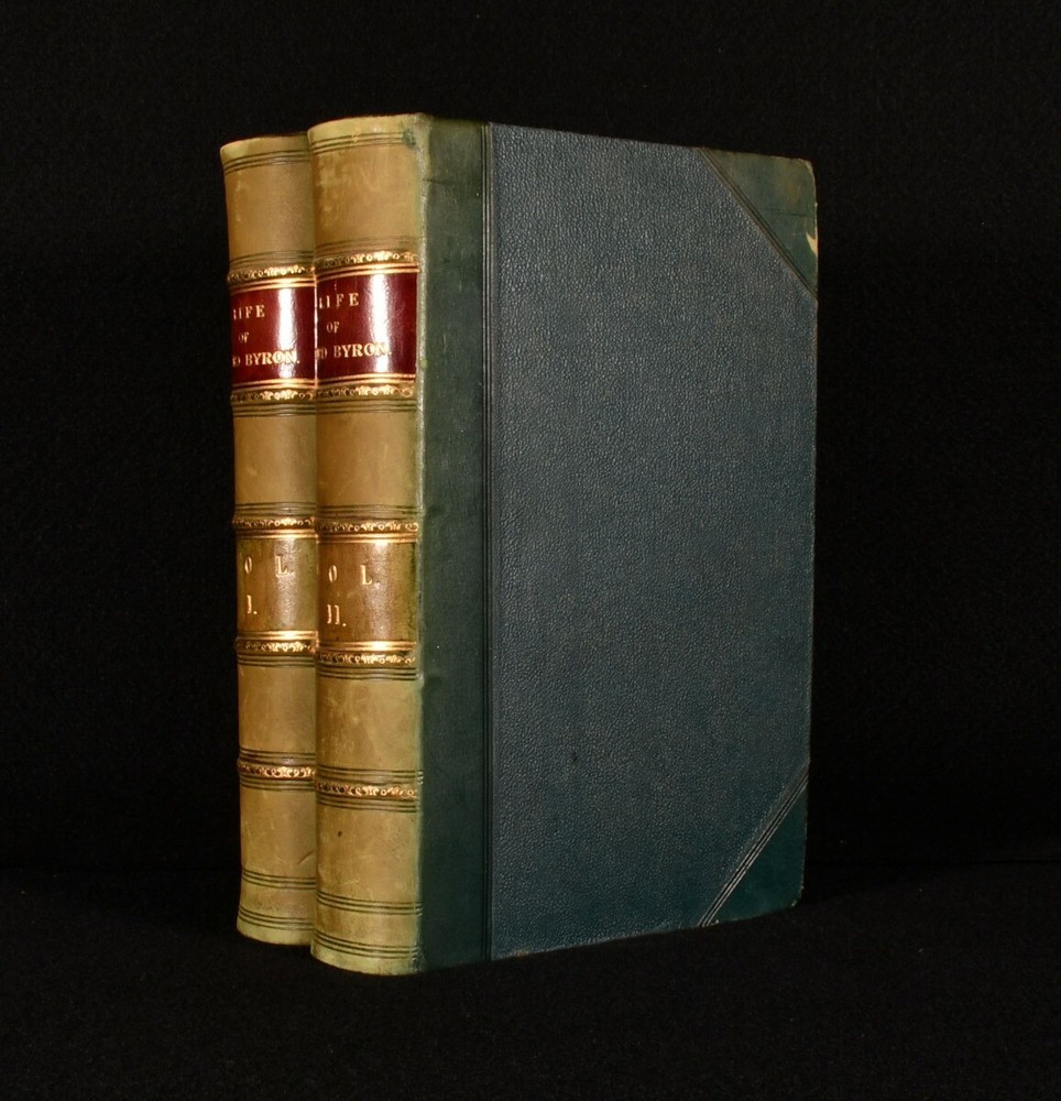 Click here to see our other books! The Life of Lord Byron; With His Letters and Journals Thomas Moore 1840 Thomas Wardle : Philadelphia 8" by 5" [5], x-xiii, 606, [3]; [5], vi-viii, 702pp SUMMARY The US first edition of Thomas Moore's insightful biography on the life and work of his friend, Lord Byron. First Edition,Illustrated,Leather Binding Overall Condition: Very Good This book weighs 2 KG when packed UK Postage: £ 3.99 US Postage: £ 29.99 EU Postage : £ 21.99 European Postage: £ 23.99 Asia Postage: £ 37.99 Worldwide Postage: £ 38.99 DESCRIPTION Complete in two volumes. The first edition thus, being the first US edition. A detailed and favourable biography on the life of Lord Byron, the noted and infamous Romantic poet. Illustrated with a frontispiece to each volume. Written by Thomas Moore, a close friend of Byron. Moore was trusted with the memoirs of Byron, and was advised to burn them upon Byron's death. CONDITION In a half calf binding with cloth to the boards. Externally, generally smart. Some fading to the spine. Some marks and rubbing to the boards and spines. A little bumping to the extremities. Spots to the endpapers. Internally, firmly bound. Pages are bright and clean with just a few spots. Tidemark to the first few and last few pages of Volume I. Tear to the last two leaves of Volume I, pages 607/608 and 609, with loss only to the pagination of pages 607/608, and some loss to four lines to the head of page 609. Overall Condition: Very Good GLOSSARY OF TERMS Overall Condition (Dustwrapper condition rating is shown after that for the book itself, where a dustwrapper is present) Fine - Very well preserved copy showing very little wear Very Good Indeed - Only one or two minor faults, really a very attractive copy Very Good - Quite a wide term meaning no major faults but probably several smaller ones often expected given the age of the book, but still a respectable copy Good - Meaning not very good. Some more serious faults as will be described in the condition report under 'condition' Good Only - Meaning one or more faults that could really do with repair Fair - As with good only above but with other faults leaving a compromised copy even after repair Poor - Really bad and possibly seriously incomplete. We only sell books in this condition where their rarity or value makes them attractive none the less. Major defects will be described. GUARANTEE We offer a full money back guarantee on our descriptions. Please ask for details and conditions. We prefer PAYPAL. If you pay via PAYPAL we will post the item off the same or the next working day with the postage you have selected. Please note we cannot accept USD cheques