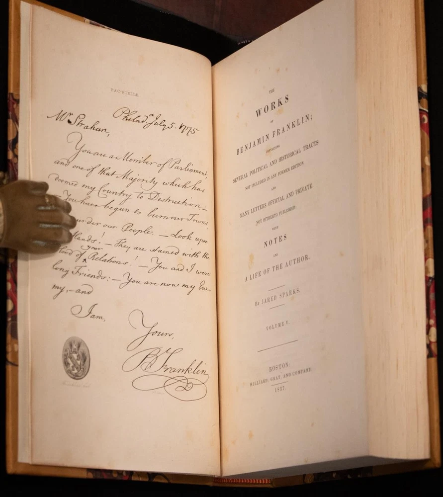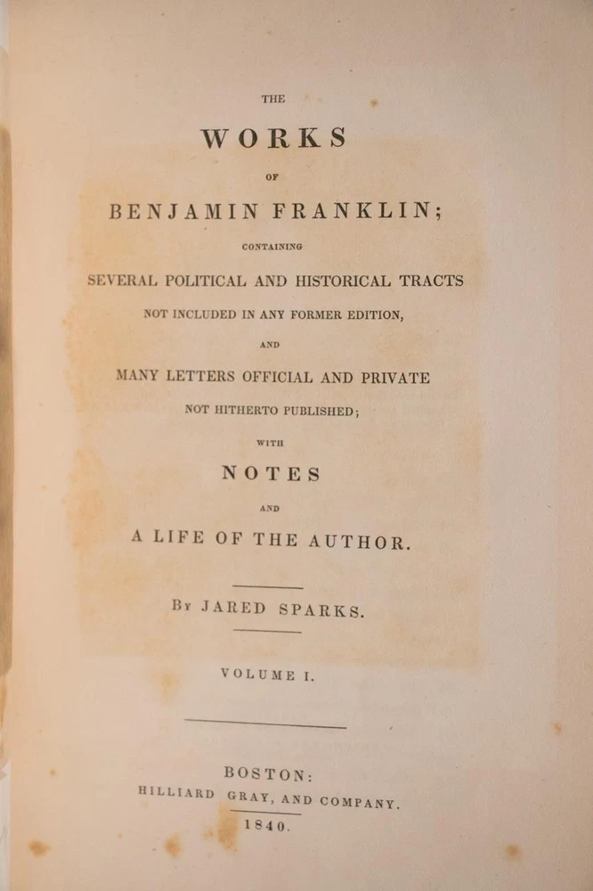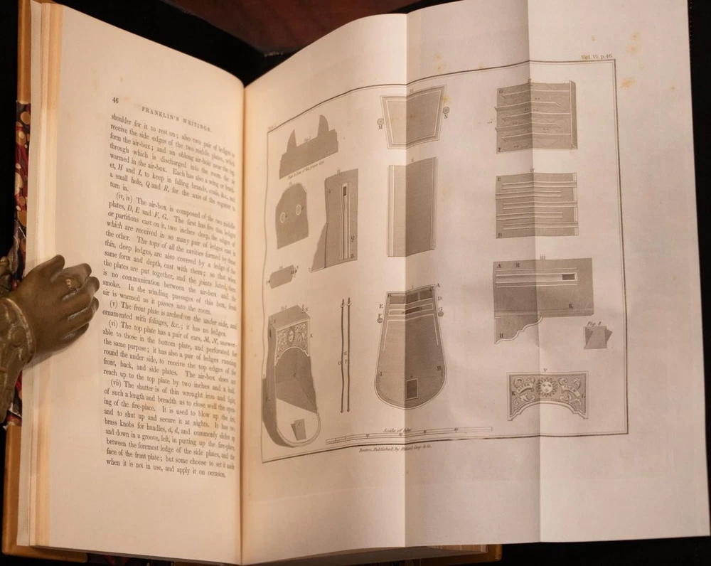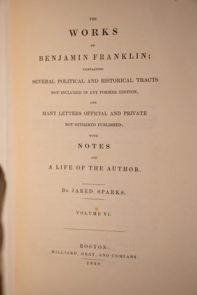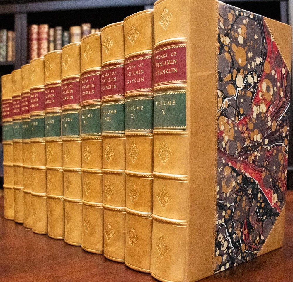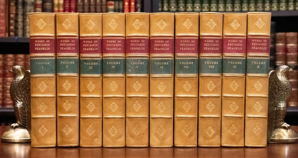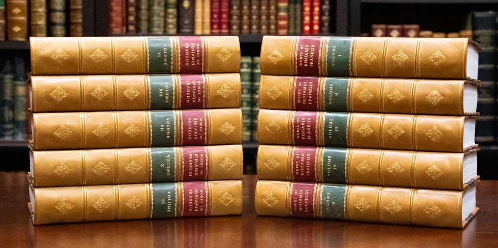 THIS COMPLETE TEN VOLUME SET IS IN NEAR FINE CONDITION BEAUTIFULLY REBOUND IN 3/4 LEATHER WITH MARBLED BOARDS, SIX COMPARTMENTS AND FIVE RAISED BANDS TO SPINE WITH BRIGHT GILT DETAILS AND TITLE. BINDING AND HINGES ARE EXCELLENT, NEW END PAPERS AND PASTE DOWNS, NO LOOSE OR MISSING PAGES, PAGES ARE REMARKABLY BRIGHT AND CLEAN, WITHOUT MARKS, SOME LIGHT SPORADIC FOXING, SOME FRONTISEPIECES WITH TANNING. ILLUSTRATED WITH STEEL ENGRAVINGS AND FOLD OUT PLATES, BOOKS MEASURE 10.25"x7". FIRST EDITION PUBLISHED 1836-1840, 185 YEARS OLD. A SCARCE TITLE IN FINE LEATHER, YOU WILL LOVE THIS SET! 1840 Works of Benjamin Franklin First Edition Illustrated Fine Leather 10" Tall 1840 Works of Benjamin Franklin First Edition Illustrated Fine Leather 10" Tall Description THIS COMPLETE TEN VOLUME SET IS IN NEAR FINE CONDITION BEAUTIFULLY REBOUND IN 3/4 LEATHER WITH MARBLED BOARDS, SIX COMPARTMENTS AND FIVE RAISED BANDS TO SPINE WITH BRIGHT GILT DETAILS AND TITLE. BINDING AND HINGES ARE EXCELLENT, NEW END PAPERS AND PASTE DOWNS, NO LOOSE OR MISSING PAGES, PAGES ARE REMARKABLY BRIGHT AND CLEAN, WITHOUT MARKS, SOME LIGHT SPORADIC FOXING, SOME FRONTISEPIECES WITH TANNING. ILLUSTRATED WITH STEEL ENGRAVINGS AND FOLD OUT PLATES, BOOKS MEASURE 10.25"x7". FIRST EDITION PUBLISHED 1836-1840, 185 YEARS OLD. A SCARCE TITLE IN FINE LEATHER, YOU WILL LOVE THIS SET! !!!CLICK HERE!!! Visit My eBay Store TO SEE ALL THE BOOKS WE HAVE FOR SALE!!! IF YOU LIKE WHAT YOU SEE THAN SAVE US TO YOUR FAVORITES BY CLICKING HERE. Add me to your Favorite Sellers RARE ANTIQUARIAN BOOKS CAN BE FRAGILE AND NEED TO BE HANDLED WITH CARE. About us: Reagan's Rare Books is a purveyor of Antiquarian books primarily from the 18th and 19th centuries. We love antique books! We search all over the country for the finest rare books, looking for those with beautiful bindings and in great condition so that we can offer you, the customer, a truly rare one of a kind collectible. Paypal Preferred. Please make payment arrangements within 48 hours of winning your auction. We reserve the right to re-list items not paid within 5 days. Shipping *To Insure That Your Package arrives without any Problems , Please Double Check to Make Sure That The Address You Have Selected in eBay Is Correct. All books are carefully bubble wrapped and packed in a box with adequate packing peanuts to prevent any damage during shipment. All books are shipped with delivery confirmation and tracking. Books over $75.00 are automatically insured. RETURNS 100% Satisfaction Guaranteed. Returns accepted for any reason within 30 days of receipt. PLEASE CHECK MY OTHER LISTINGS. POSTING NEW RARE BOOKS DAILY/WEEKLY. Get images that make Supersized seem small. Showcase your items with Auctiva's Listing Templates! THE simple solution for eBay sellers. Track Page Views With Auctiva's Counter