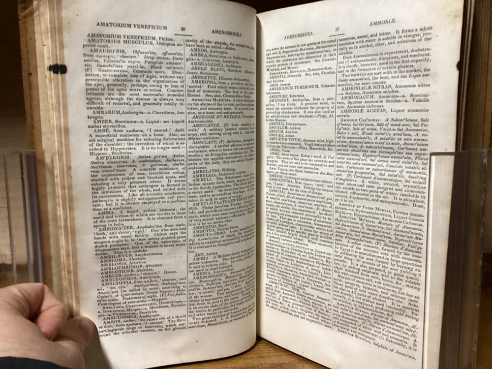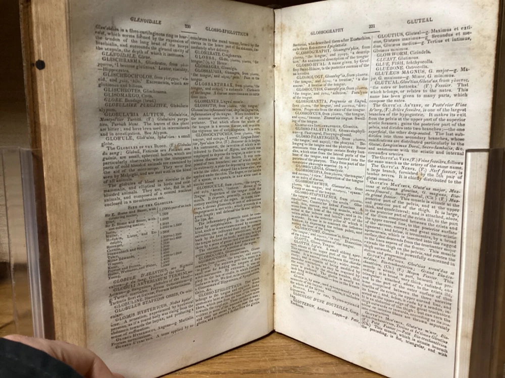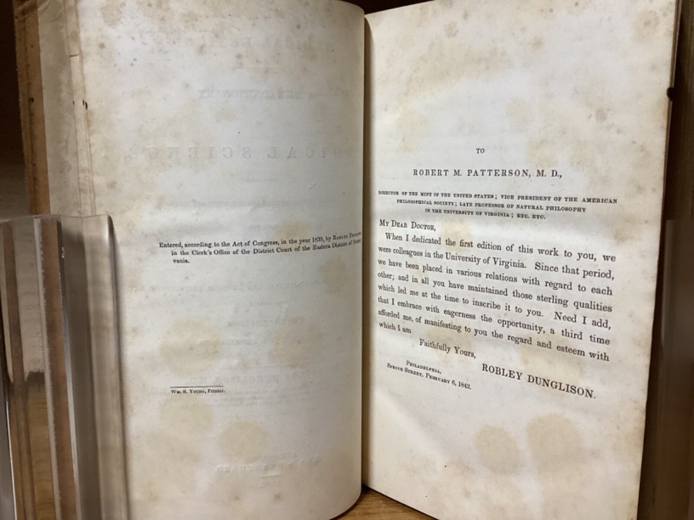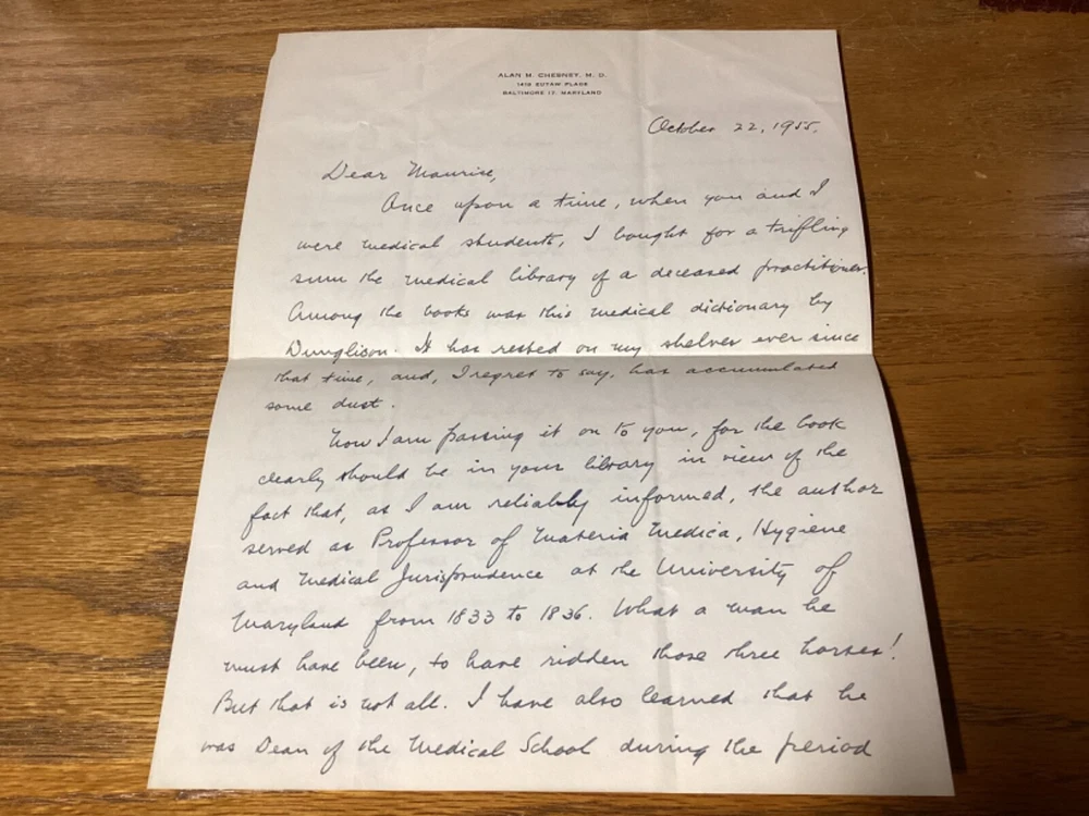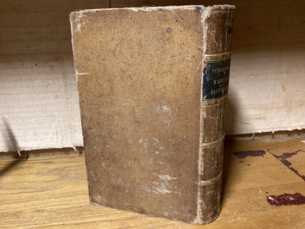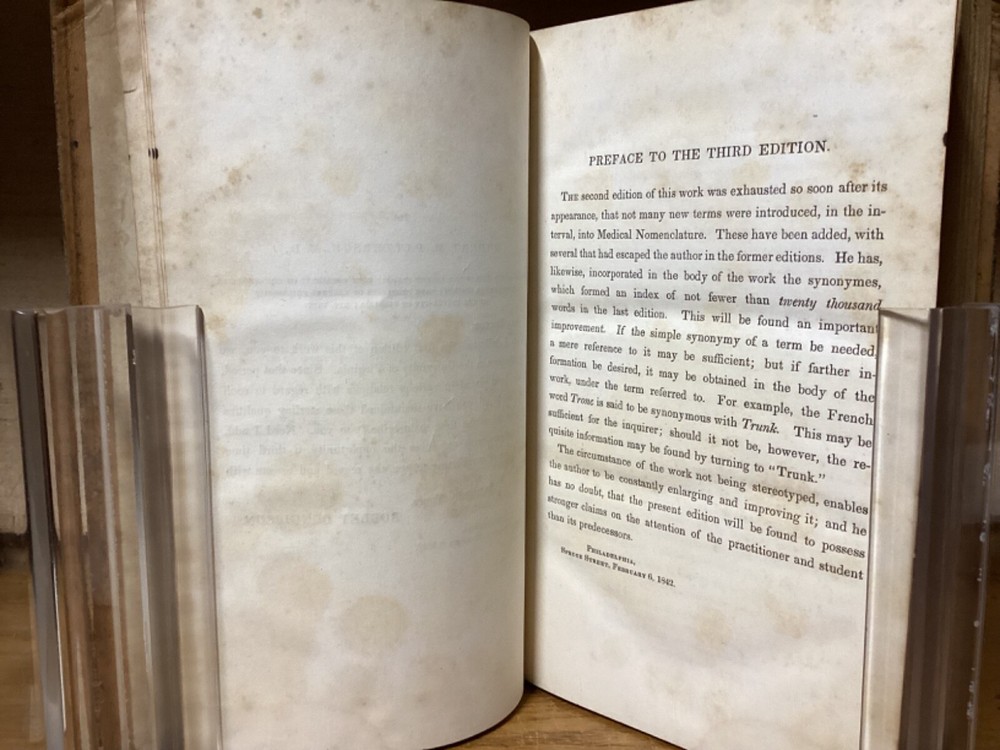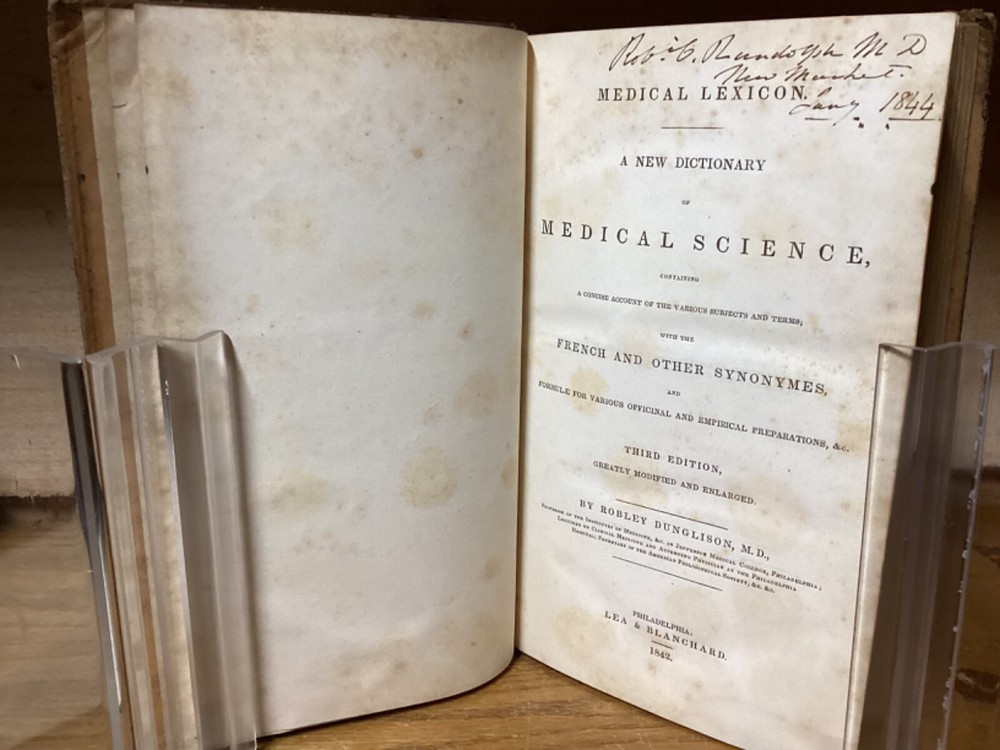 Medical Lexicon. A New Dictionary of Medical Science, Containing a Concise Account of the Various Subjects and Terms; with the French and Other Synonymes, and Formulae for Various Officinal and Empirical Preparations, &c. Third Edition. By Robley Dunglinson and printed in Philadelphia by Lea and Blanchard. 1842. 749 pp. 9.75” x 6”. 8vo. Hardcover full leather. In good condition, with superficial scuffing to boards, including staining remnants at top. Some cracking and loss to parts of leather on spine. Hinges remain in good condition and text block remains bound well. Light wear to middle of text block. Ex-libris bookplate to front pastedown, along with light markings and inscriptions. Includes folded letter. General age-related toning to pages, along with periodic foxing and wear. Please see photographs and ask any questions prior to purchasing. A scarce medical dictionary, accompanied by a two-page folded letter from 1955 by Alan Mason Chesney (1888-1964), an American doctor and dean of the Johns Hopkins School of Medicine for over two decades. His work mainly focused on infectious diseases, with a primary emphasis on syphilis. COLN1842ABCS
