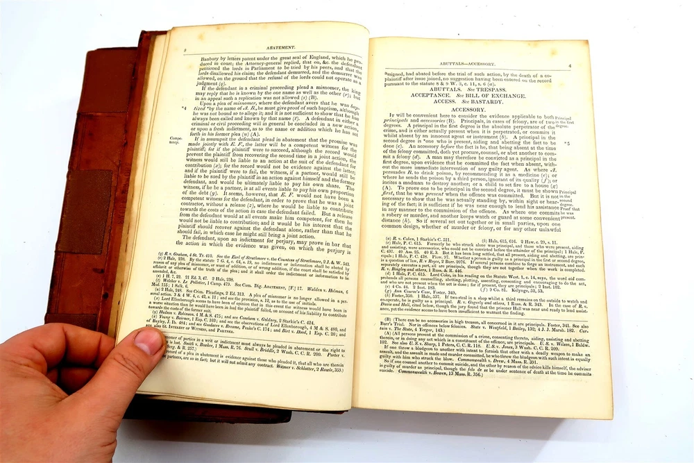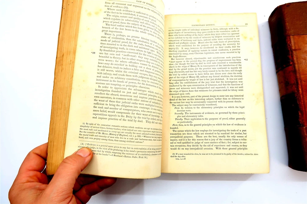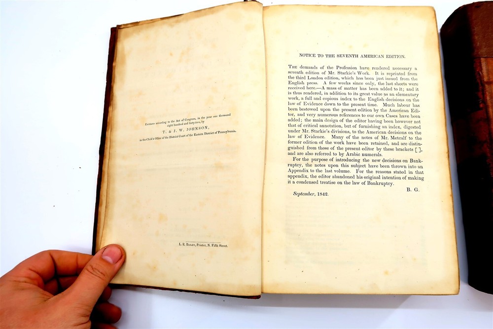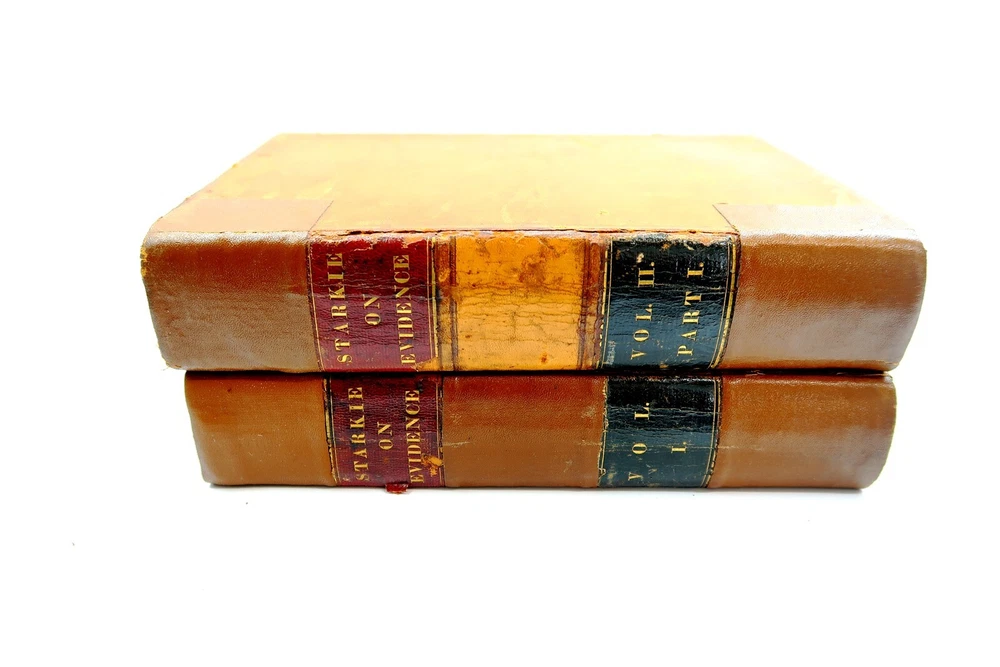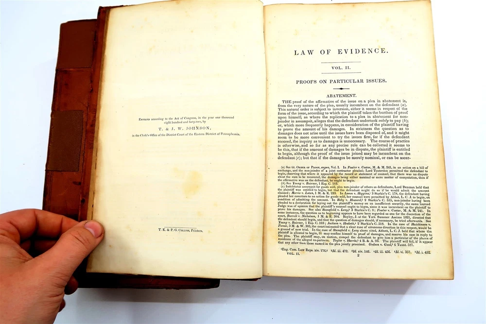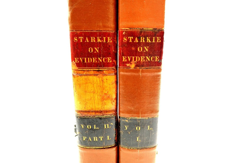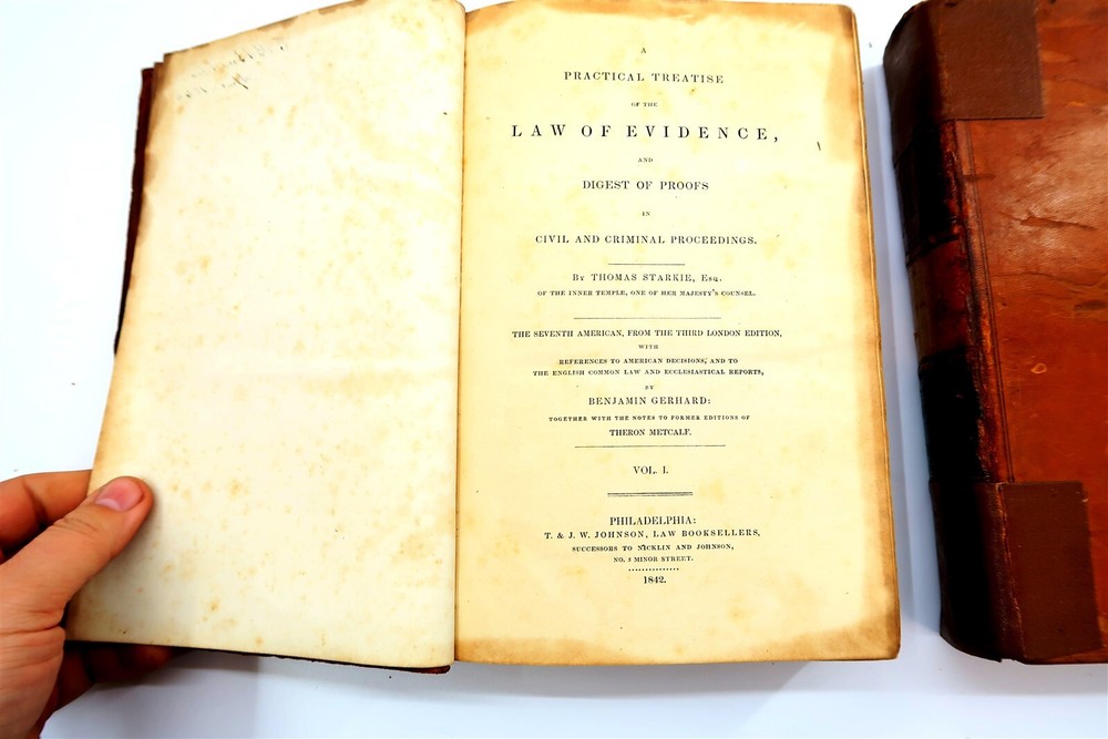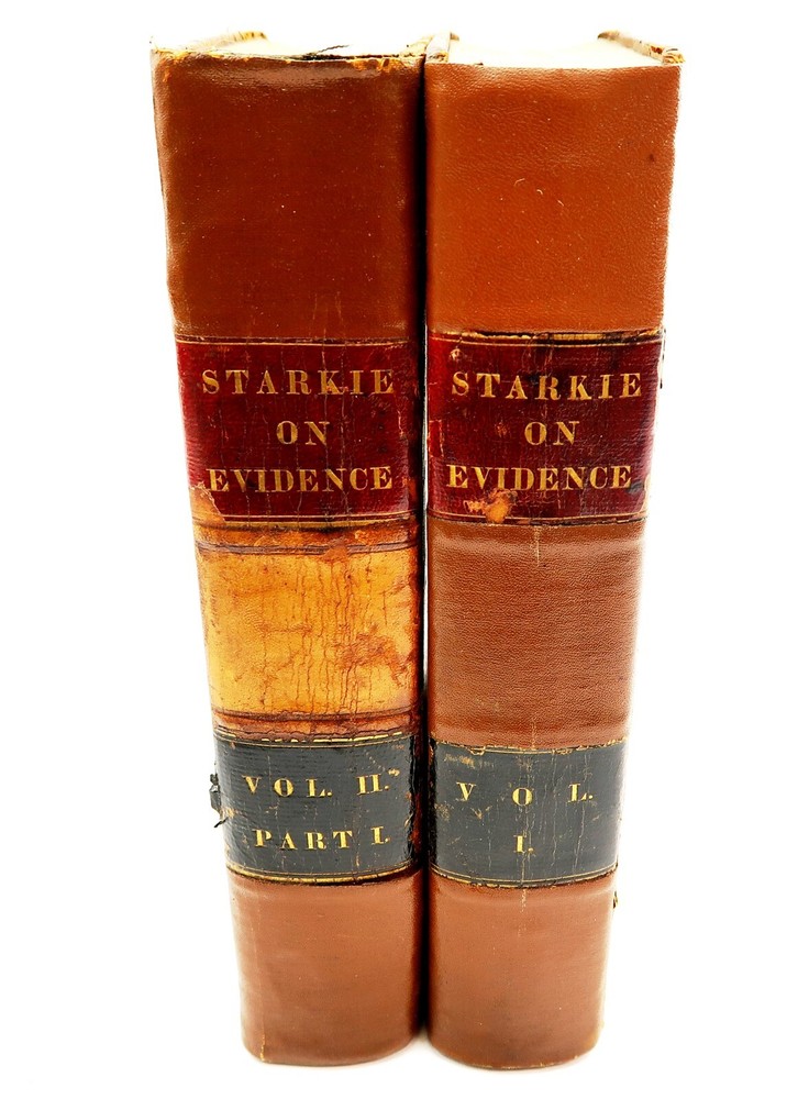 1842 STARKIE ON EVIDENCE 2 Volumes Leather Bound Books by Benjamin Gerhard This eBay listing is for a wonderful lot of 2 antique leather bound hardback books titled: Starkie on Evidence by Benjamin Gerhard. The books look to be in good condition for their age! They have on the outside of the book what looks like applied special tape on the binding. The overall size of the books are 9.25" tall each. Inside front page have old stamps and from a previous owner. No other writing or marks found inside the books. There are also no foul odors as well. Both books have foxing first few and last few pages. If you collect antique legal books, then be sure to check out my other listings. I just picked up about 30 antique books and will have all the others listed in my ebay store at this time. Seller Location Reference - Smalls / Long Box 8 BID IN CONFIDENCE – CHECK MY FEEDBACK! My goal is your satisfaction. I leave positive feedback right after the payment is received for all orders!! If you plan to leave anything less than positive feedback and 5 stars - please let me know so that I can work out any problems that you may have. I aim to please!! SHIPPING & HANDLING FOR US BIDDERS We ship ASAP upon payment as noted above within 1 business day 99% of the time!! We normally pack up your new treasures 2 - 3 times a day and ship using USPS and Fedex Ground so that you get your items in a timely fashion. As always - there is no charge for local pickup on any of my items!! SHIPPING AND HANDLING FOR INTERNATIONAL BIDDERS Import duties, taxes and charges are not included in the item price or shipping charges. These charges are the buyer’s responsibility. Please check with your country’s customs office to determine what these additional costs will be prior to bidding/buying.” THANK YOU AND HAVE A WONDERFUL DAY!! Powered by SixBit's eCommerce Solution