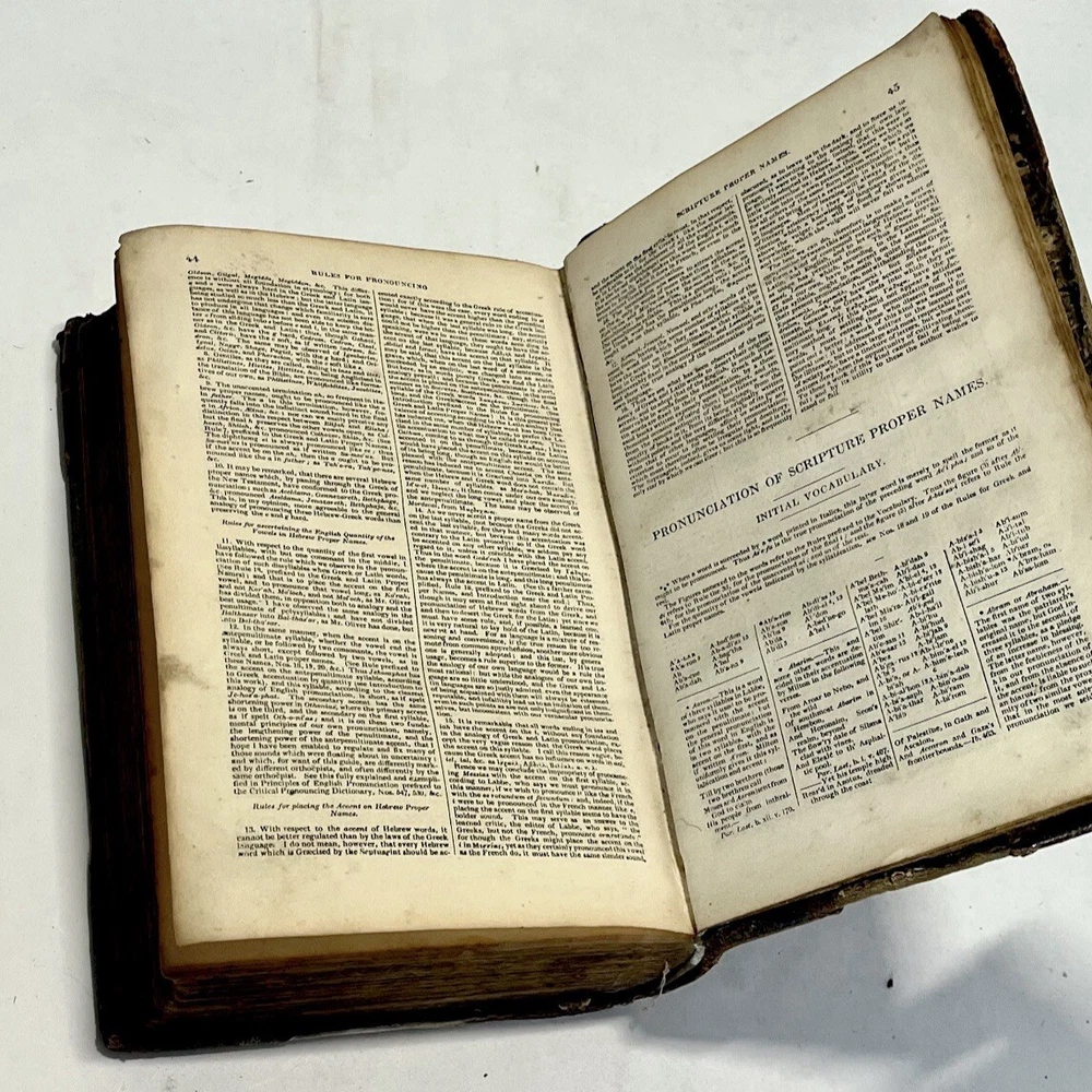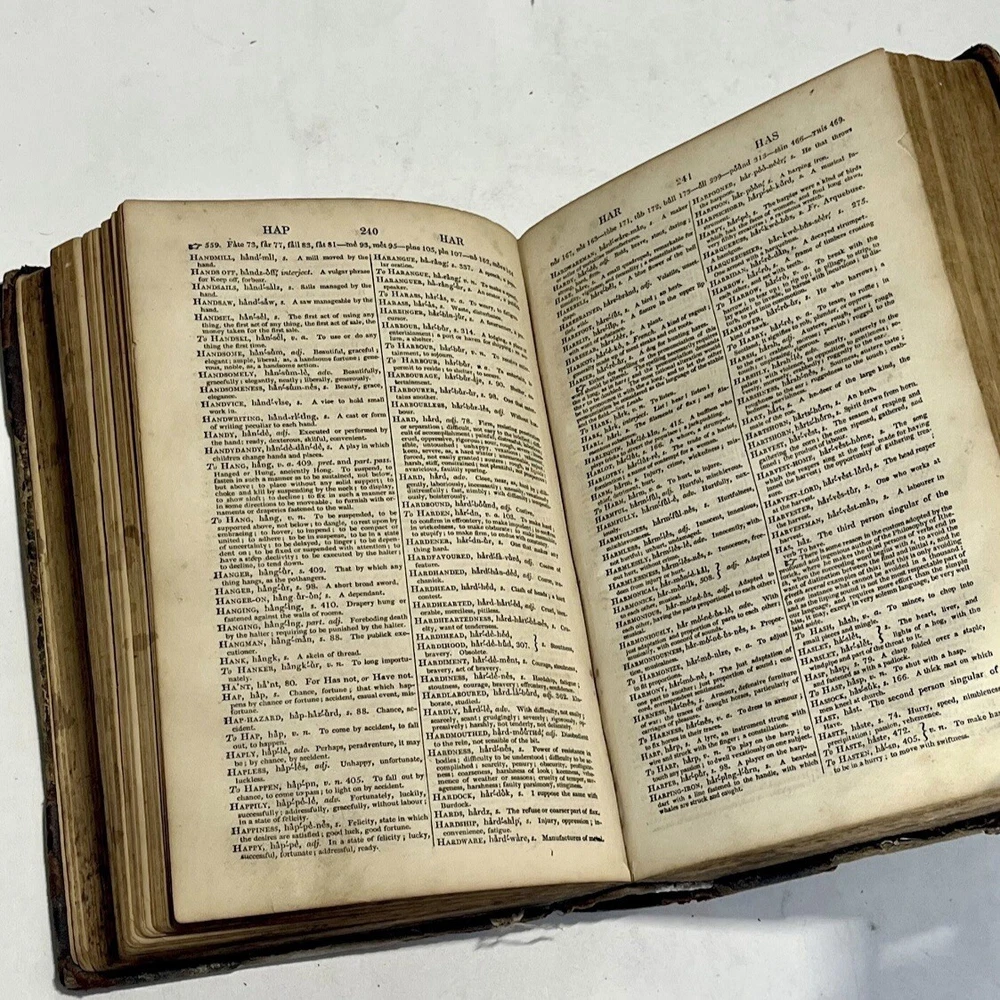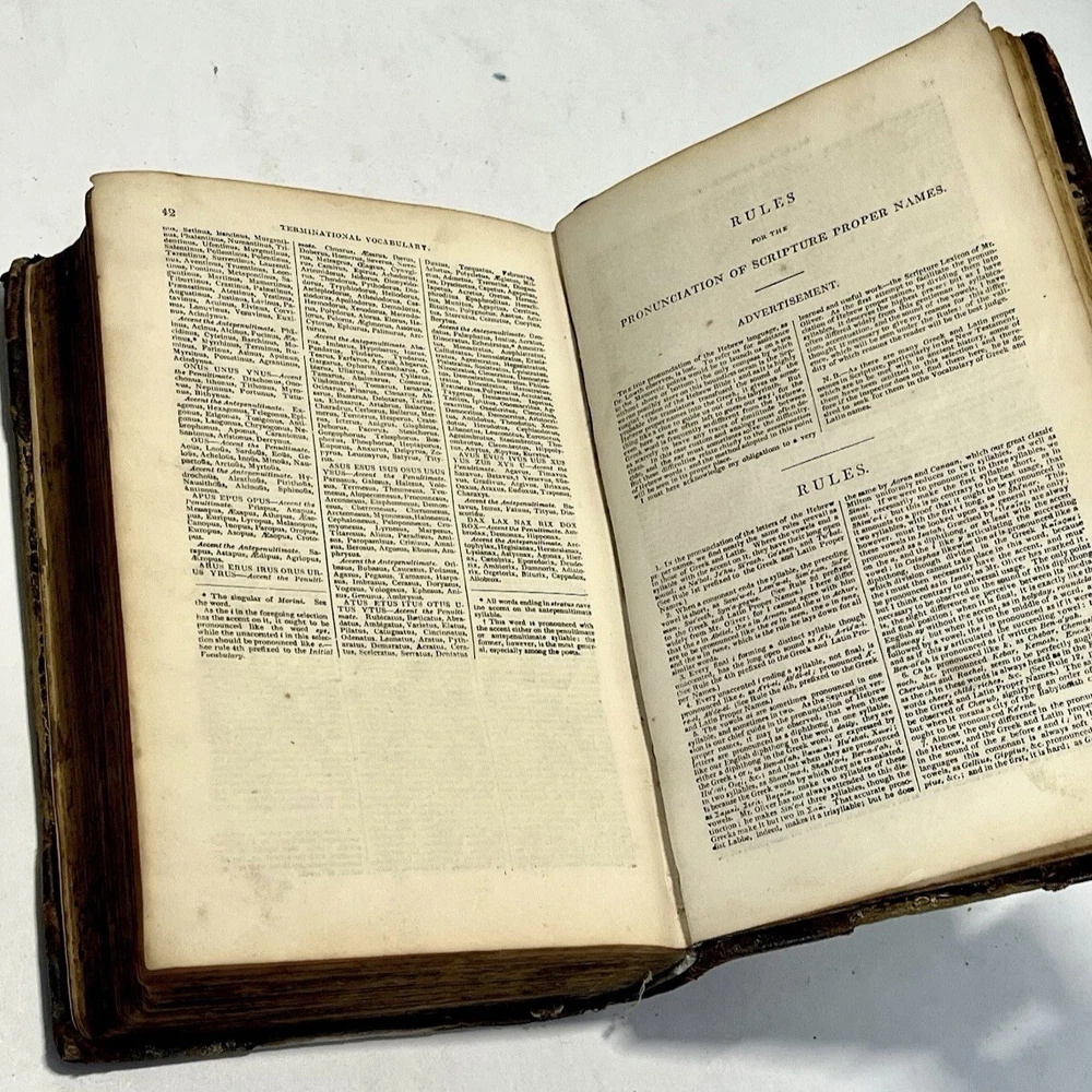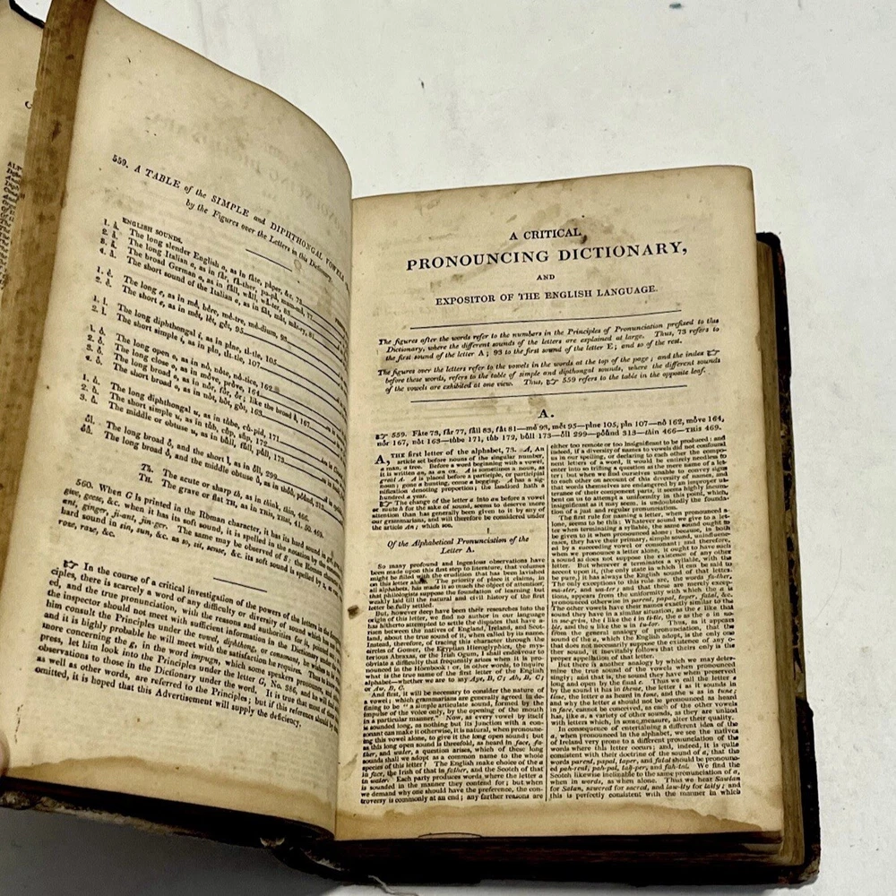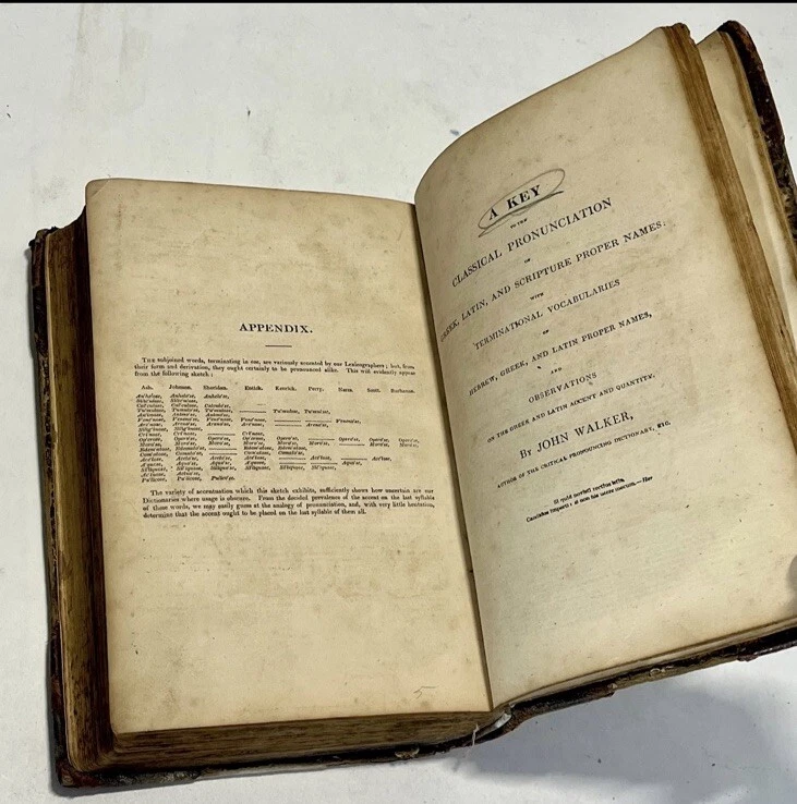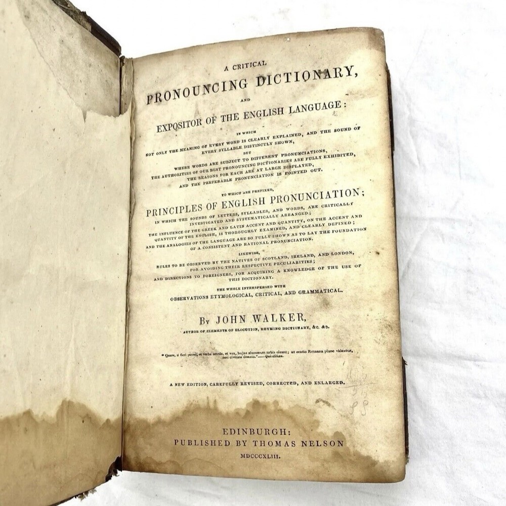 “A Critical Pronouncing Dictionary, and Expositor of the English Language” by John Walker. Published in Edinburgh by Thomas Nelson; 1843 (MDCCCXLIII). This is a beautiful antique dictionary and a book that is over 180 years old! It is a collector's item that remains in wonderful condition! Complete in one single volume, this is an early edition of this collectible and historic book that has been such an important contribution to the English language. Bound in a stunning old 3/4 leather-binding from the early 19th century, this book will earn an honored spot on any bibliophile’s bookshelf! A lovely Victorian-era collectible! From the Title Page: It includes “Not Only the Meaning of Every Word is Explained, and the Sound of Every Syllable Distinctly Shown, but Where Words are Subject to Different Pronunciations, the Authorities of our Best Pronouncing Dictionaries are Fully Exhibited, the Reasons for Each are at Large Displayed, and the Preferable Pronunciation is Pointed Out. To Which are Prefixed, Principles of English Pronunciation, in Which, the Sounds of Letters. syllables, and Words are Critically Investigated and Systematically Arranged; the Influence of the Greek and Latin Accent and Quantity, or the Accent and Quality of the English is Thoroughly Examined and Clearly Defined; and the Analogies of the Language are so Fully Shown as to Lay the Foundation of a Consistent and Rational Pronunciation. Likewise, Rules to be Observed by the Natives of Scotland, Ireland, and London to Avoiding Their Respective Peculiarities; and Directions to Foreigners, for Acquiring a Knowledge of the Use of this Dictionary. The Whole Interpreted with Observations, Etymological, Critical, and Grammatical”. It includes a Key to the Classical Pronunciation of Greek and Latin Languages and for Scripture Proper Names, as well as other educationally valuable sections of content. The author, John Walker, is the author of books such as “Elements of Elocution,” “Rhyming Dictionary,” & etc., etc. It measures approximately 9” tall by 6.5” wide, and 2.5 inches thick. It contains over 650 printed pages. This is a beautiful copy of this rare antique book. The bright leather covers are stunning. The spine features a black blocked title with gold gilt lettering, which has faded with age. The binding itself is solid and secure, holding all of the pages in their proper places. This copy shows some typical wear for a book of this age, although it has been extremely well preserved and remains in great condition overall. The text block is sturdy, complete, and tight. The pages are still shockingly easy to flip through. The pages have some minor tanning from age, with few markings. There is a previous owner’s name written in ink on one of the first blank pages of the book. This is a stunning leather English Reference Book that is worthy of a spot on any English Lover’s or Book Lover’s bookshelf!