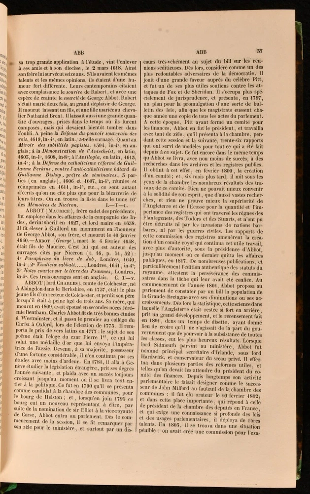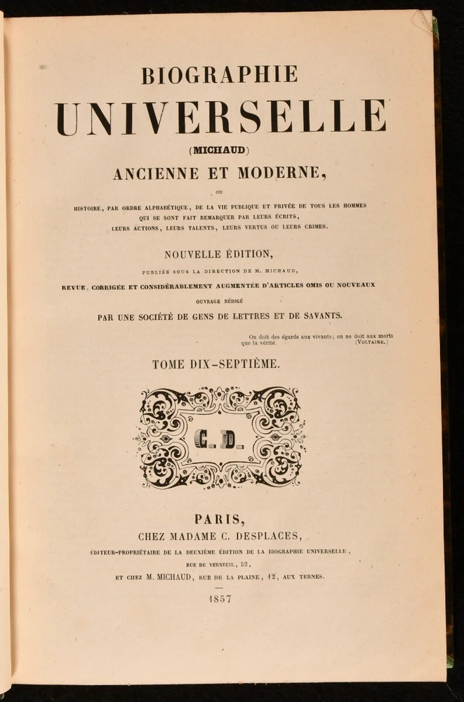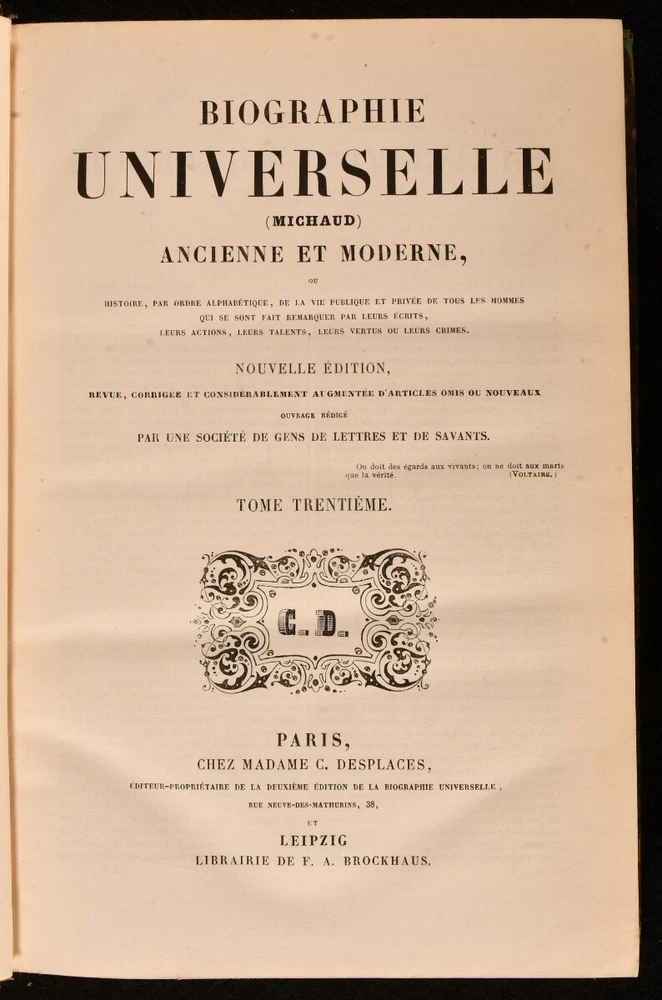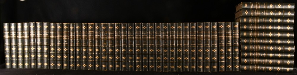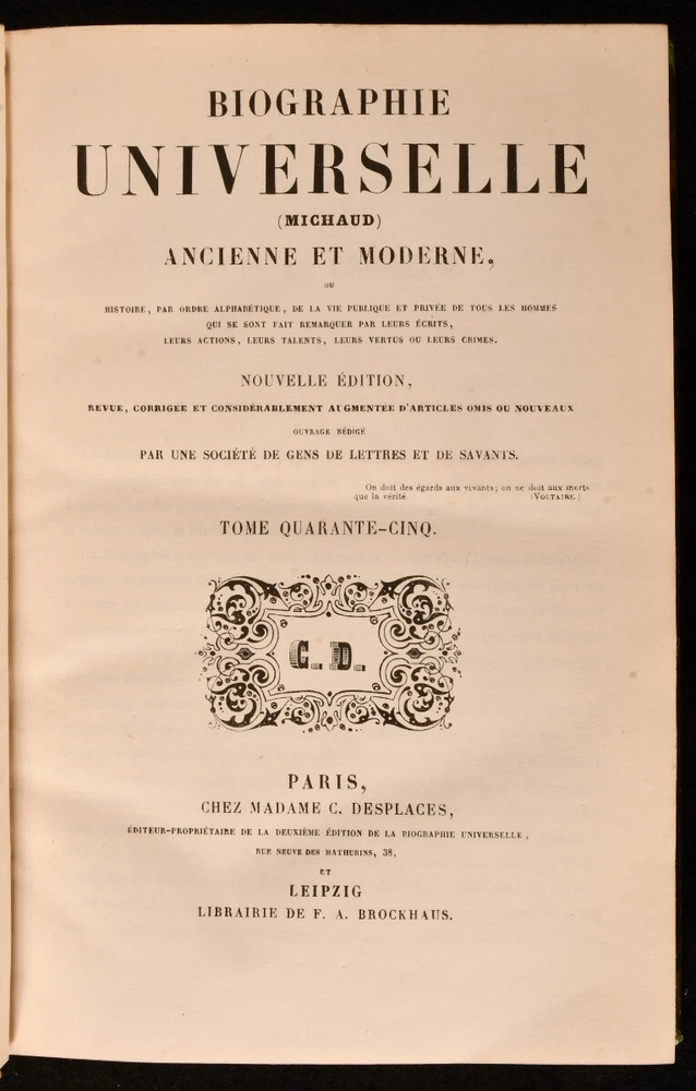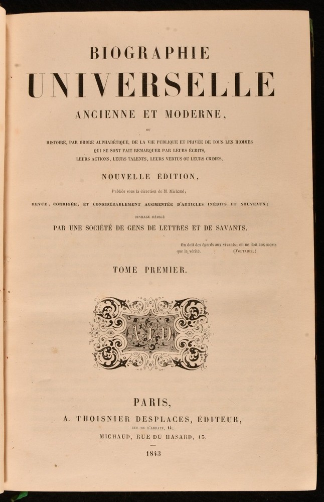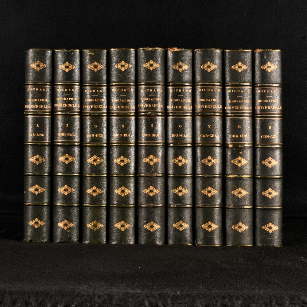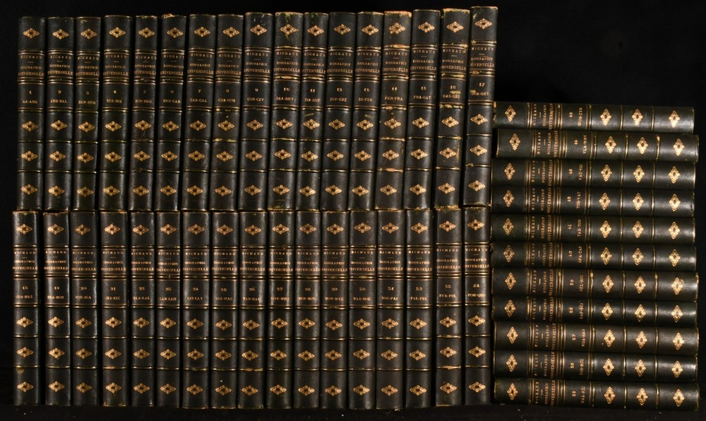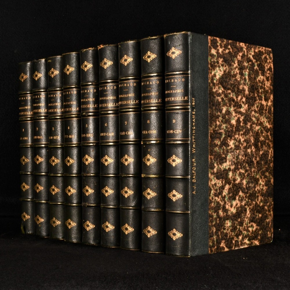 Click here to see our other books! Biographie Universelle Ancienne et Moderne in Forty Five Volumes M. Michaud 1843-1860 A. Thoisnier Desplaces; Chez Madame C. Desplaces; Lirairie de F. A. Brockhaus : Paris and Leipzig 11" by 7" n/a SUMMARY This vast collection of biographies of writers and scholars throughout history complete in forty five volumes. Leather Binding,Rebound Overall Condition: Very Good This book weighs 30 KG when packed UK Postage: £ 4.49 US Postage: £ 99.99 EU Postage : £ 49.99 European Postage: £ 99.99 Asia Postage: £ 187.99 Worldwide Postage: £ 276.99 DESCRIPTION The complete set of Biographie Universelle Ancienne et Moderne by M. Michaud in quarter morocco binding and marbled boards. Full title includes: 'Histoire, Par Ordre Alphabetique, de la Vie Publique et Privee de Tour Les Hommes Qui Se Sont Fait Remarquer Par Leurs Ecrits, Leurs Actions, Leurs Talents, Leurs Vertus ou Leurs Crimes', which translates to: 'History, In Alphabetical Order, Of The Public And Private Life Of The Men Who Have Made Themselves Noticeable By Their Writings, Their Actions, Their Talents, Their Virtues Or Their Crimes.' From the library of Lord Arthur James Balfour, with his name printed to the bindings including the date in which they were rebound (1882). New editions published by three different publishers across the period 1843-1860. The works published by Librairie de F. A. Brockhaus are undated, and dated c1854-1860. Rebound in signed morocco binding by A. J. Balfour (1848-1930), also known as Lord Balfour, Prime Minister of the United Kingdom 1902-1905. Includes the following works: Volume I AA-ANG, 1843 Volume II ANH-BAL, 1854 Volume III BAM-BER, 1843 Volume IV BER-BOI, 1854 Volume V BON-BRU, undated Volume VI BRU-CAR, 1854 Volume VII CAR-CHA, 1854 Volume VIII CHA-COM, 1854 Volume IX CON-CZV, 1854 Volume X DAA-DHY, undated Volume XI DIA-DUP, 1855 Volume XII DUP-ERZ, 1855 Volume XIII ES-FER, 1855 Volume XIV FER-FRA, 1856 Volume XV FRA-GAT, 1856 Volume XVI GAU-GNI, undated Volume XVII GOA-GRY, 1857 Volume XVIII GUA-HAZ, 1857 Volume XIX HEA-HOR, 1857 Volume XX HOR-JEA, 1858 Volume XXI JEA-KIZ, undated Volume XXII KLA-LAL, undated Volume XXIII LAM-LEH, undated Volume XXIV LEI-LLY, undated Volume XXV LOA-MAC, undated Volume XXVI MAD-MAR, undated Volume XXVII MAR-MEO, undated Volume XXVIII MER-MON, undated Volume XXIX MON-MYS, undated Volume XXX NAA-NOE, undated Volume XXXI NOG-PAJ, undated Volume XXXII PAL-PEZ, undated Volume XXXIII PFA-POL, undated Volume XXXIV POM-QUO, undated Volume XXXV RAA-RIC, undated Volume XXXVI RID-ROZ, undated Volume XXXVII RUA-SAO, undated Volume XXXVIII SAP-SEJ, undated Volume XXXIX SEL-SOZ, undated Volume XL SPA-TAP, undated Volume XLI TAR-TOR, undated Volume XLII TOS-VAT, undated Volume XLIII VAU-VIZ, undated Volume XLIV VLA-WNY, undated Volume XLV WOB-ZYR, undated. CONDITION Rebound in signed quarter morocco binding and marbled boards. Externally, very smart. There is some minor bumping to the heads and tails of the spines and to the extremities. This has resulted in some slight wear to the boards. Internally, firmly bound. The pages are bright and clean with some occasional spotting, particularly to the endpapers and title pages. Overall Condition: Very Good GLOSSARY OF TERMS Overall Condition (Dustwrapper condition rating is shown after that for the book itself, where a dustwrapper is present) Fine - Very well preserved copy showing very little wear Very Good Indeed - Only one or two minor faults, really a very attractive copy Very Good - Quite a wide term meaning no major faults but probably several smaller ones often expected given the age of the book, but still a respectable copy Good - Meaning not very good. Some more serious faults as will be described in the condition report under 'condition' Good Only - Meaning one or more faults that could really do with repair Fair - As with good only above but with other faults leaving a compromised copy even after repair Poor - Really bad and possibly seriously incomplete. We only sell books in this condition where their rarity or value makes them attractive none the less. Major defects will be described. GUARANTEE We offer a full money back guarantee on our descriptions. Please ask for details and conditions. We prefer PAYPAL. If you pay via PAYPAL we will post the item off the same or the next working day with the postage you have selected. Please note we cannot accept USD cheques