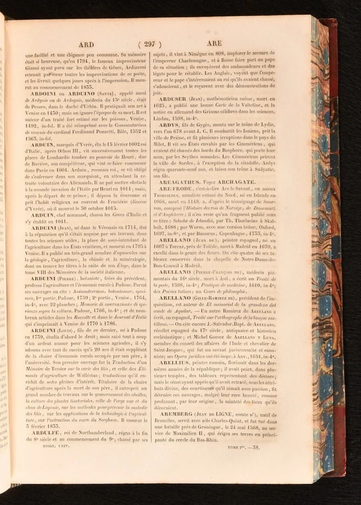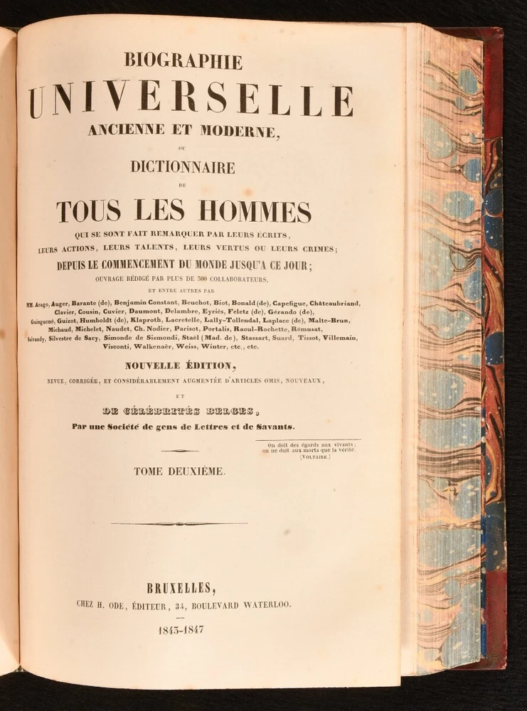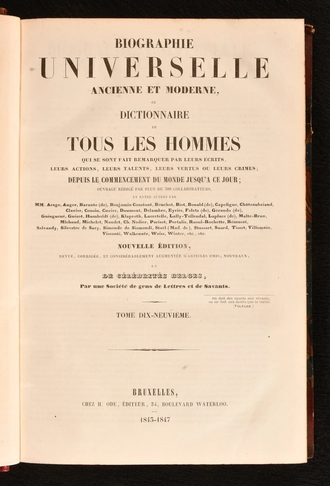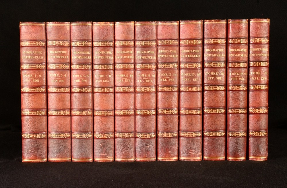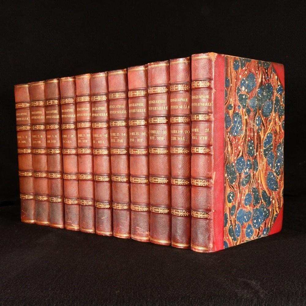 Click here to see our other books! Biographie Universelle, Ancienne et Moderne, ou Dictionnaire de Tous les Hommes qui se sont fair remarquer par leurs ecrits, leurs actions, leurs talents, leurs vertus ou leurs crimes, depuis le commencement du monde jusqu'a ce jour; ouvrage redige par plus de 300 collaborateurs, et entre autres par MM Arago, Auger, Barante (de), Bejamin Constant, Beuchot, et al. Various 1843-7 Chez H Ode : Bruxelles 10.5" by 7" SUMMARY A new edition of this French universal biography of remarkable men in history, twenty-one volumes in eleven. Illustrated,Leather Binding,Rebound Overall Condition: Very Good This book weighs 30 KG when packed UK Postage: £ 4.49 US Postage: £ 99.99 EU Postage : £ 49.99 European Postage: £ 99.99 Asia Postage: £ 187.99 Worldwide Postage: £ 276.99 DESCRIPTION Twenty-one volumes in eleven. Each with separate title page and unique pagination. New edition edited and corrected as well as expanded with new articles and biographies of Belgian celebrities. Each volume features frontispiece. Collated, complete with twenty-one engraved frontispieces. In the original French. Containing a series of numerous biographies of men, remarkable for their work, actions, talents, virtues, or crimes. Compiled by a series of over three hundred contributors, including MM Arago, Auger, Cousin, Cuvier, Delambre, Malte-Brun, Weiss, Winter, &c, &c. Vols I&II (AA-BON); Vols III&IV (BON-CHR); Vol V&VI (CHR-DZO); Vol VII&VIII (EAC-GRA); Vol IX&X (GRA-KYR); Vol XI&XII (LL-MEL); Vol XIII&XIV (MEL-PAR); Vol XV&XVI (PAR-RIT); Vol XVII&XVIII (RIT-SUR); Vol XIX&XX (SUR-WAL); Vol XXI (WAL-ZYR). With armorial bookplate to front pastedown, from the library of SE Widdrington. CONDITION In uniform half straight up grain morocco bindings with marbled boards, edges, and endpapers, gilt lettering to spine. Externally very smart with minor shelf wear, rubbed lightly to extremities of head and tail of spine, boards lightly rubbed. Internally, firmly bound. Light minor spotting to odd leaf, particularly affecting first and last few; pages otherwise generally bright and clean. Overall Condition: Very Good GLOSSARY OF TERMS Overall Condition (Dustwrapper condition rating is shown after that for the book itself, where a dustwrapper is present) Fine - Very well preserved copy showing very little wear Very Good Indeed - Only one or two minor faults, really a very attractive copy Very Good - Quite a wide term meaning no major faults but probably several smaller ones often expected given the age of the book, but still a respectable copy Good - Meaning not very good. Some more serious faults as will be described in the condition report under 'condition' Good Only - Meaning one or more faults that could really do with repair Fair - As with good only above but with other faults leaving a compromised copy even after repair Poor - Really bad and possibly seriously incomplete. We only sell books in this condition where their rarity or value makes them attractive none the less. Major defects will be described. GUARANTEE We offer a full money back guarantee on our descriptions. Please ask for details and conditions. We prefer PAYPAL. If you pay via PAYPAL we will post the item off the same or the next working day with the postage you have selected. Please note we cannot accept USD cheques
