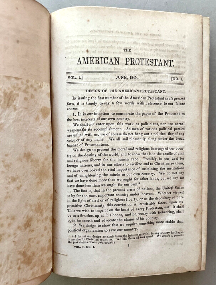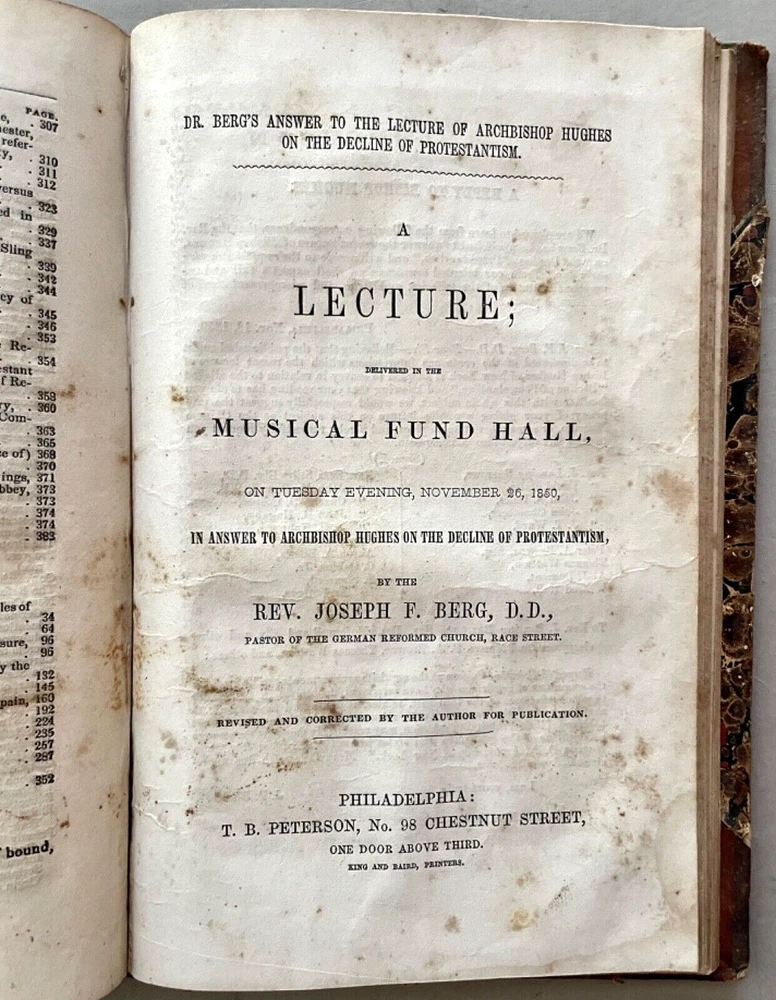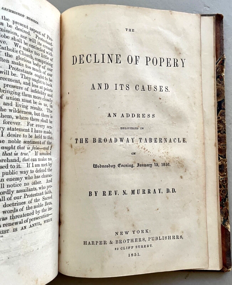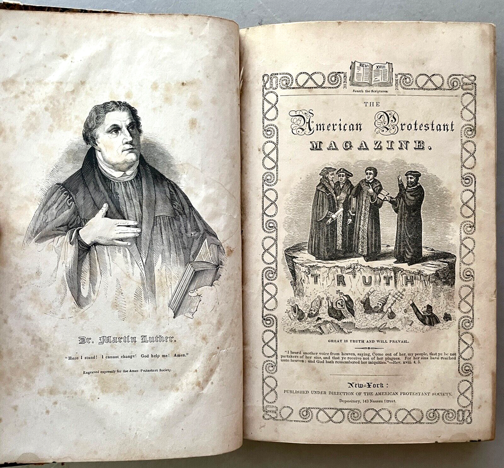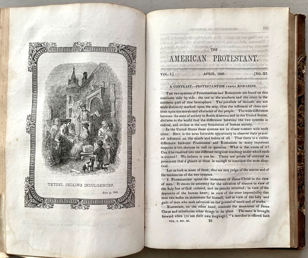 The American Protestant Magazine Vol. 1, nos. 1-12, b ound with two additional titles [FIRST EDITION] New York: American Protestant Society, (1845). Hardcover in 3/4 leather and marbled boards. Measures 9 x 6 inches; 384, 30, 32 pages illustrated with wood-block engravings throughout. Listed in Billington's 'Tentative Bibliography of Anti-Catholic Propaganda' (and given the engraved title page image of the Pope and other religious leaders drowning in the 'Sea of Truth,' it probably deserves the inclusion.) Bound together with: Rev. Joseph F. Berg, D.D., "A Lecture; Delivered in the Musical Fund Hall, On Tuesday Evening, November 26, 1850, In Answer to Archbishop Hughes on the Decline of Protestantism; Rev. N. Murry, D.D., The Decline of Popery and Its Causes, An Address Delivered to The Broadway Tabernacle on Wednesday Evening, January 15, 1851. Some wear and scuffing of leather and boards but a sound copy of this rarely found title. Leather title label with center chip; light to moderate foxing, age-toning, staining, etc. Uncollated and potentially missing an unpaginated engraving or two (?) but otherwise complete.