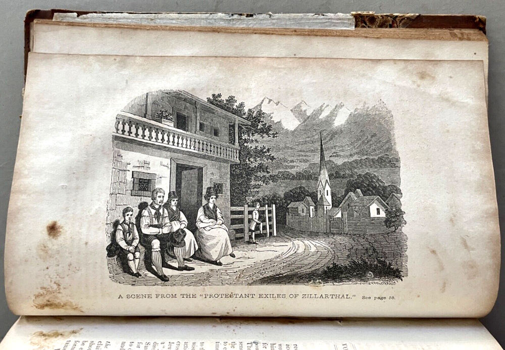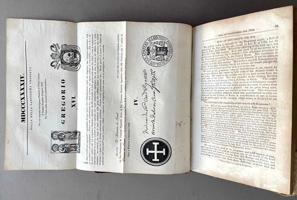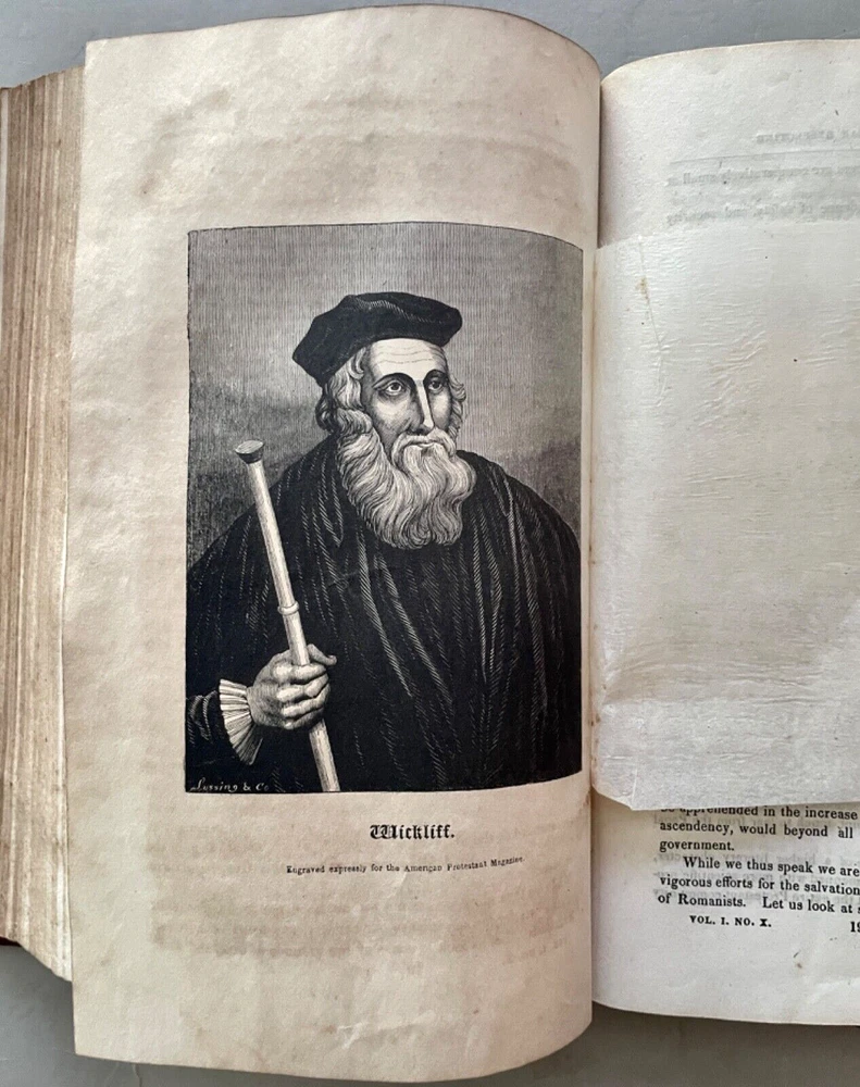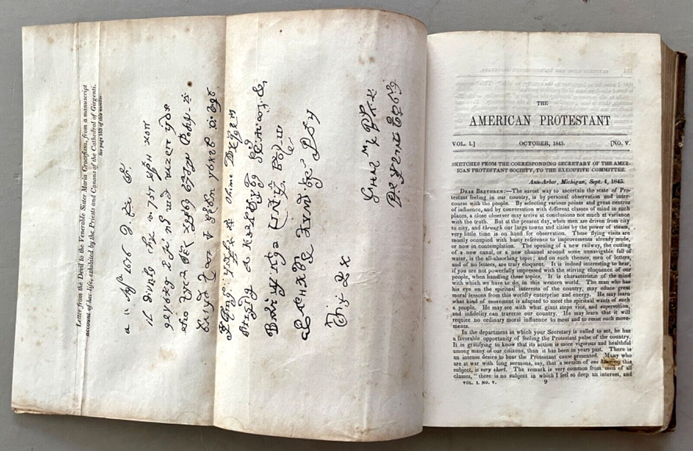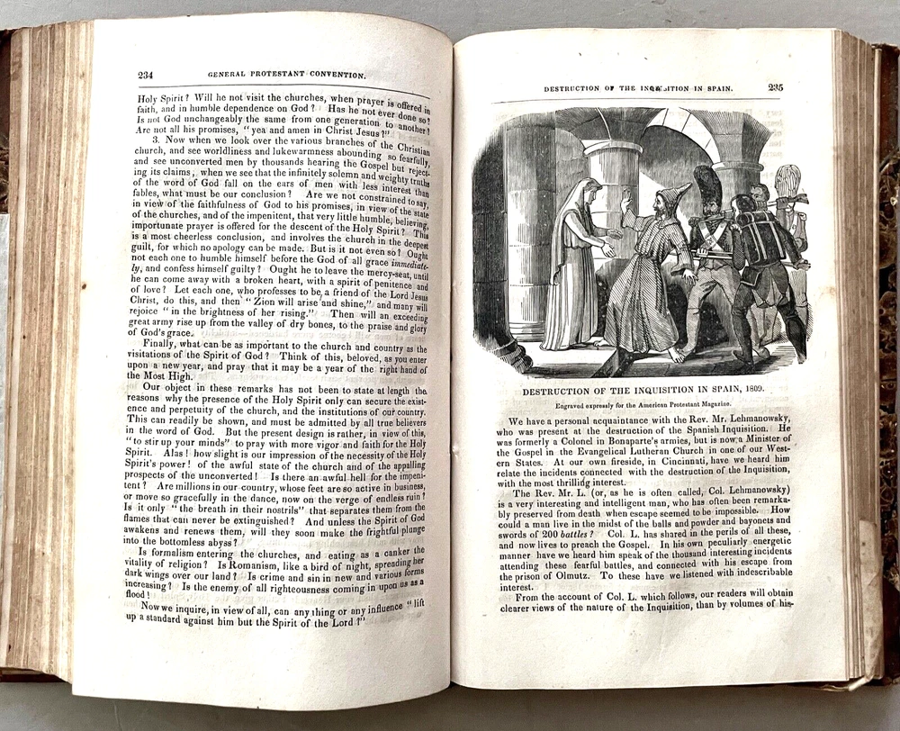 The American Protestant Magazine Vol. 1, nos. 1-12, b ound with two additional titles [FIRST EDITION] New York: American Protestant Society, (1845). Hardcover in 3/4 leather and marbled boards. Measures 9 x 6 inches; 384, 30, 32 pages illustrated with wood-block engravings throughout. Listed in Billington's 'Tentative Bibliography of Anti-Catholic Propaganda' (and given the engraved title page image of the Pope and other religious leaders drowning in the 'Sea of Truth,' it probably deserves the inclusion.) Bound together with: Rev. Joseph F. Berg, D.D., "A Lecture; Delivered in the Musical Fund Hall, On Tuesday Evening, November 26, 1850, In Answer to Archbishop Hughes on the Decline of Protestantism; Rev. N. Murry, D.D., The Decline of Popery and Its Causes, An Address Delivered to The Broadway Tabernacle on Wednesday Evening, January 15, 1851. Some wear and scuffing of leather and boards but a sound copy of this rarely found title. Leather title label with center chip; light to moderate foxing, age-toning, staining, etc. Uncollated and potentially missing an unpaginated engraving or two (?) but otherwise complete.