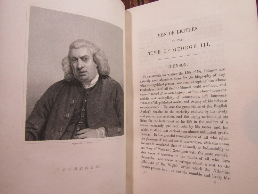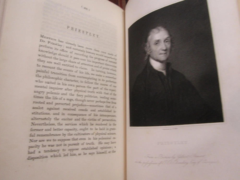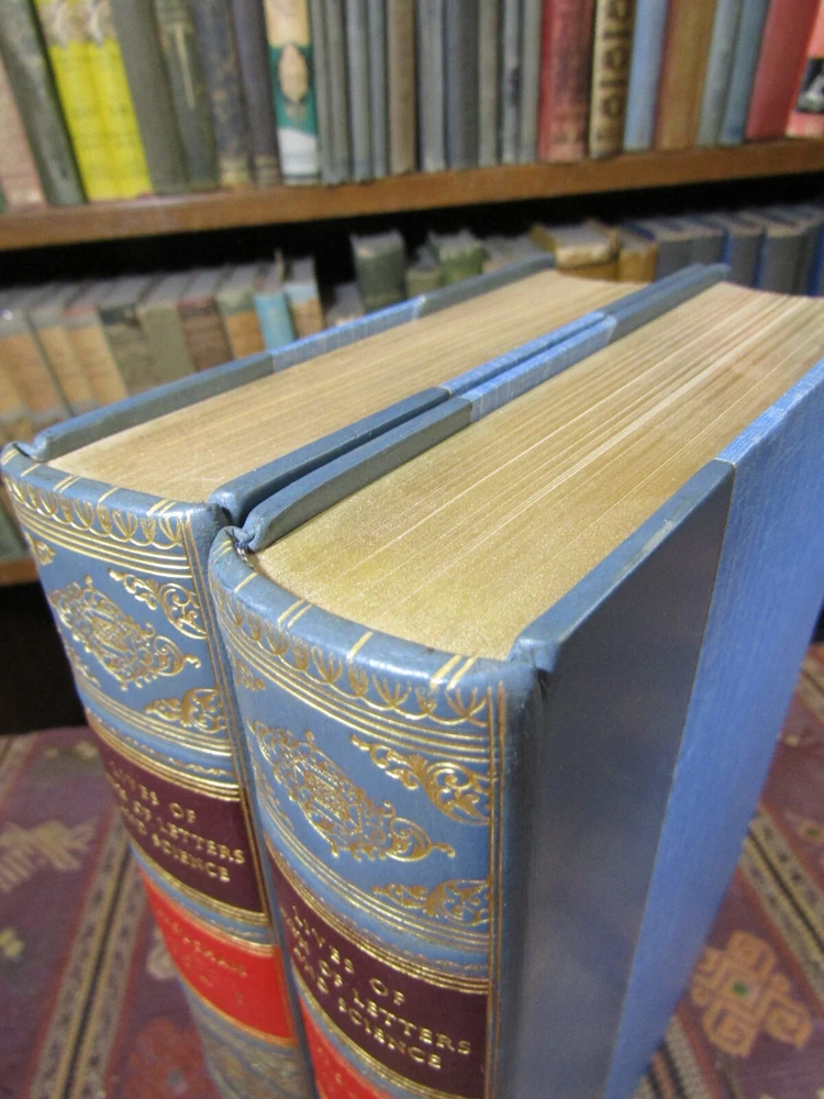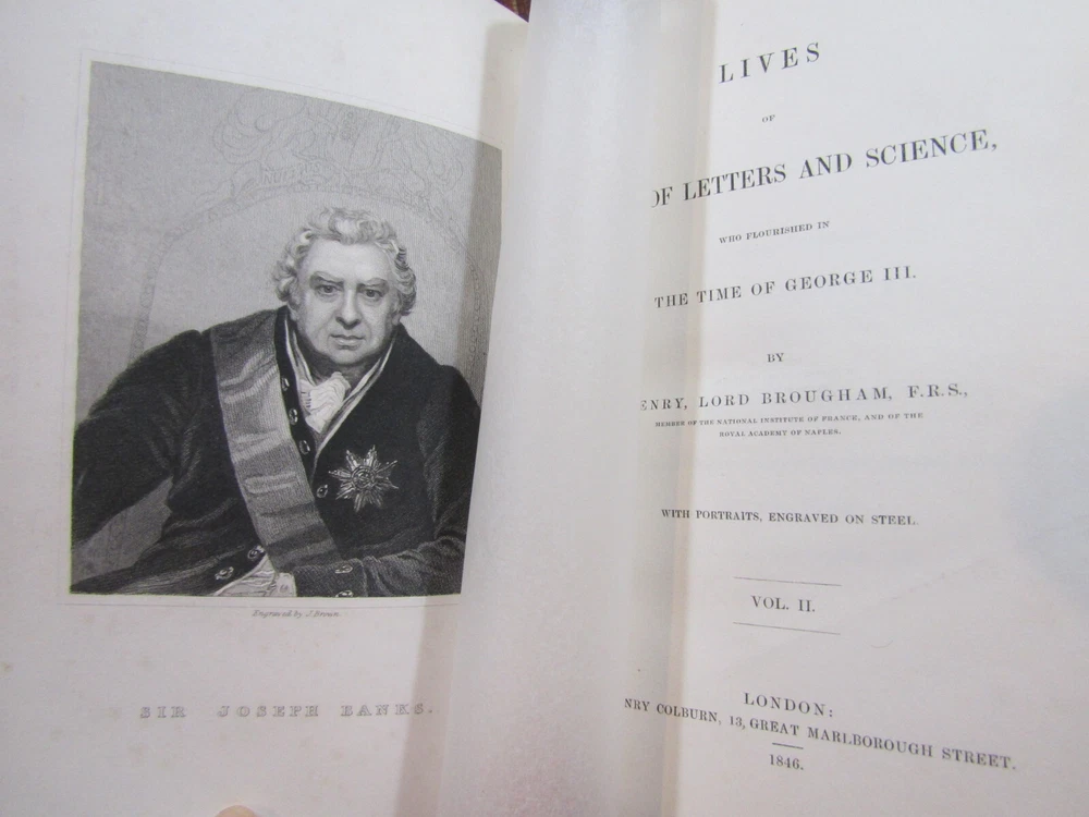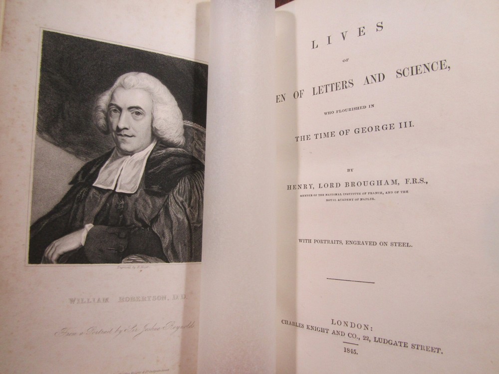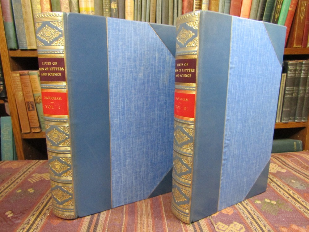 ~~Beautiful Leather Bindings~~ ~ Contains 15 Engravings ~ Lives of Men of Letters and Science Who Flourished in the Time of George III By Lord Henry Brougham London: Charles Knight and Co., ~ 1845 - 1846 ~ ************************************************* Quartos. [xvii], 516; [xii], 516 pages. Hardcovers bound in 20th century blue 3/4 calf leather with blue cloth-covered boards Elaborate gilt designs on the spines, which each have 2 lettering pieces (burgundy and red). Top edges gilt. The bindings show light rubbing and wear. Some wrinkling to the top corner of the front flyleaf of Volume I. There is a little foxing to the front and rear of each volume, but overall a sound clean set. Attractive shelf appearance. Illustrated with 15 full-page steel plate engravings (portraits). Volume I has 9 engraved portraits for 10 subjects (no portrait for Simson on page 467). Volume II has 6 portraits for 6 subjects. Volume I is dated 1845; Volume II is dated 1846. ***************************************** We Always Accept Returns if the Item Does Not Match the Description. If You Have any Questions, Please Do Not Hesitate to Ask! *************************************************** Come visit our OPEN SHOP in Greensboro, North Carolina. Shop Hours: 10-6 Mondays ~~ Saturdays ~~Closed on Sundays~~ Pages Past -- Used & Rare Books / 1837 Spring Garden St. / Greensboro, N.C. 27403 We are proud to have serviced the Greensboro area with an open bookshop since 1996 !