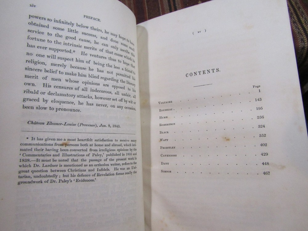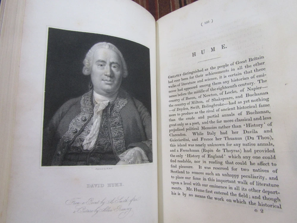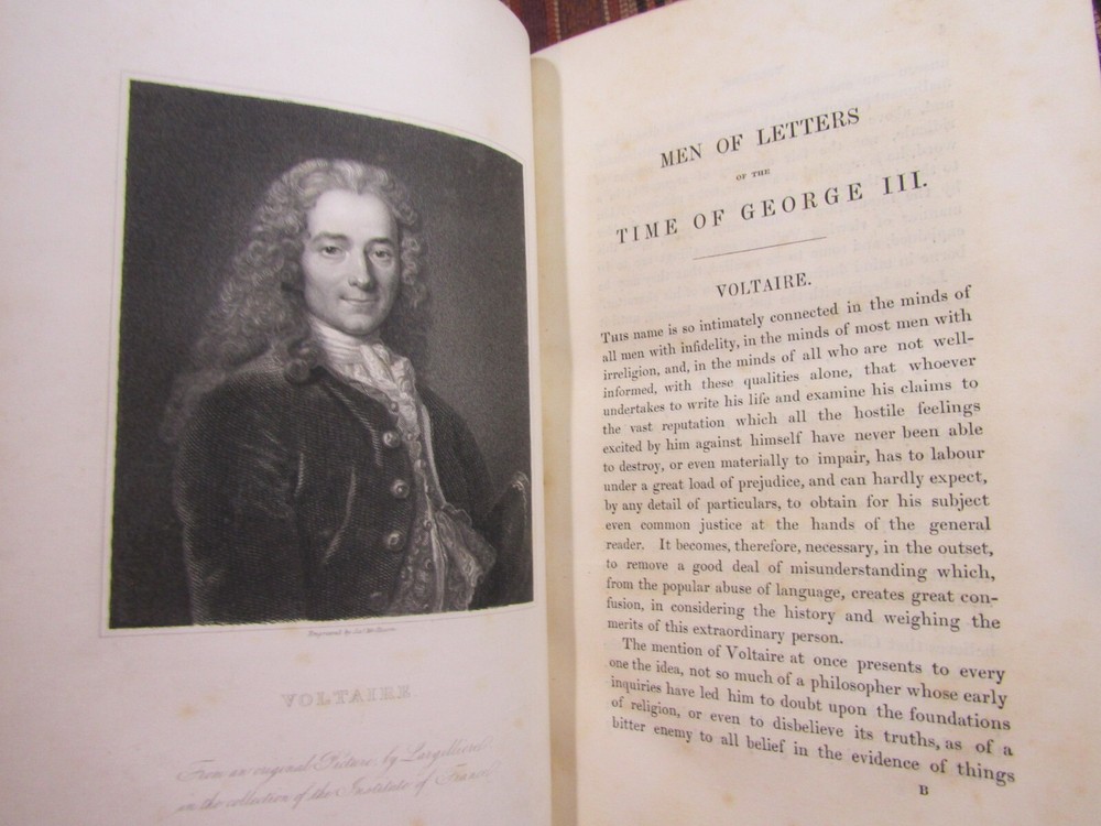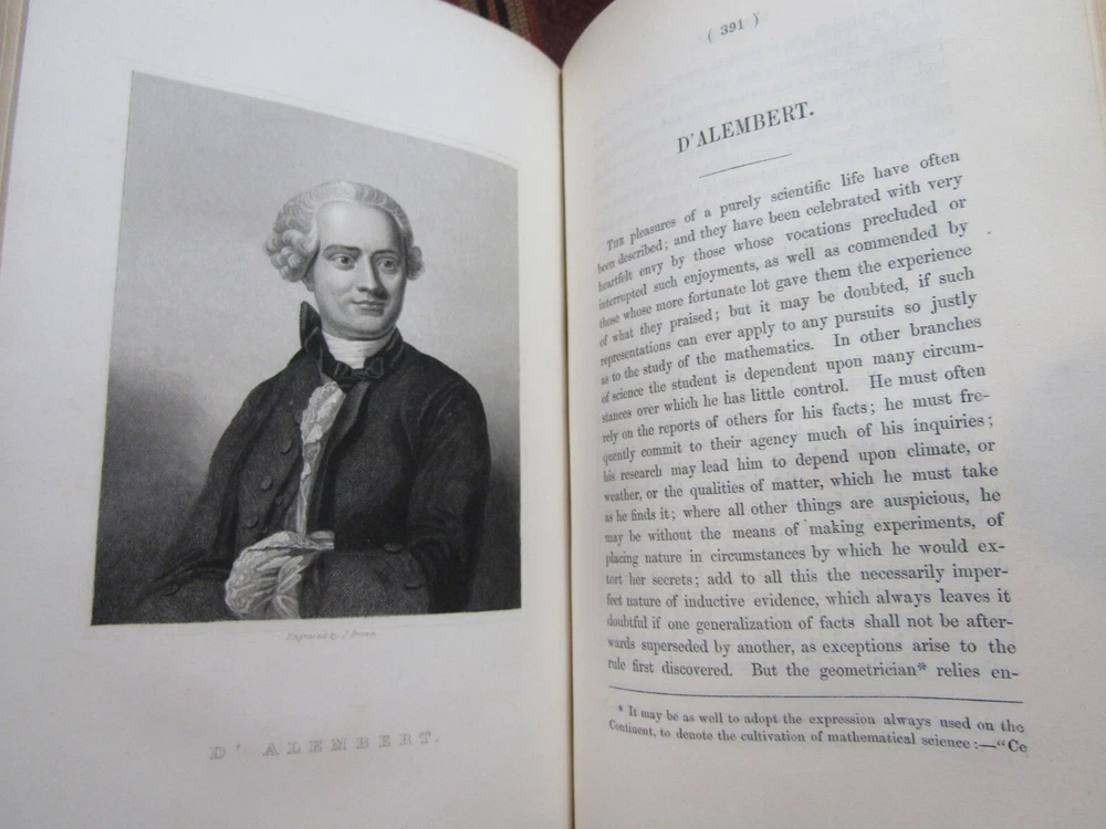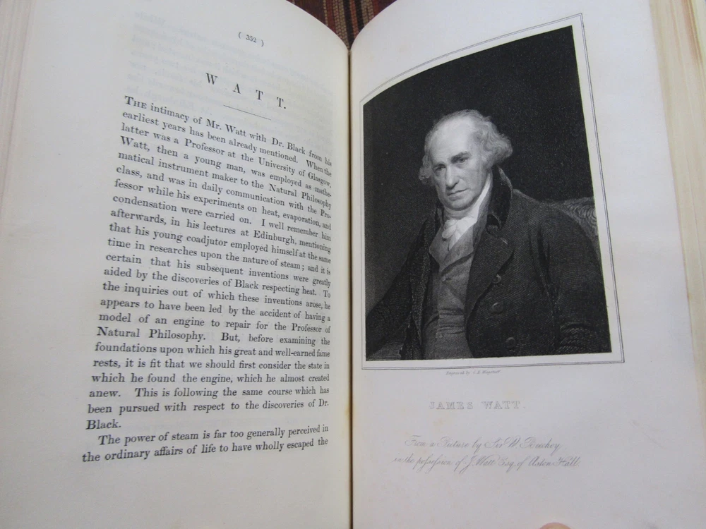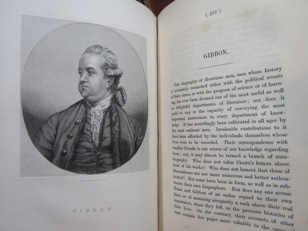 ~~Beautiful Leather Bindings~~ ~ Contains 15 Engravings ~ Lives of Men of Letters and Science Who Flourished in the Time of George III By Lord Henry Brougham London: Charles Knight and Co., ~ 1845 - 1846 ~ ************************************************* Quartos. [xvii], 516; [xii], 516 pages. Hardcovers bound in 20th century blue 3/4 calf leather with blue cloth-covered boards Elaborate gilt designs on the spines, which each have 2 lettering pieces (burgundy and red). Top edges gilt. The bindings show light rubbing and wear. Some wrinkling to the top corner of the front flyleaf of Volume I. There is a little foxing to the front and rear of each volume, but overall a sound clean set. Attractive shelf appearance. Illustrated with 15 full-page steel plate engravings (portraits). Volume I has 9 engraved portraits for 10 subjects (no portrait for Simson on page 467). Volume II has 6 portraits for 6 subjects. Volume I is dated 1845; Volume II is dated 1846. ***************************************** We Always Accept Returns if the Item Does Not Match the Description. If You Have any Questions, Please Do Not Hesitate to Ask! *************************************************** Come visit our OPEN SHOP in Greensboro, North Carolina. Shop Hours: 10-6 Mondays ~~ Saturdays ~~Closed on Sundays~~ Pages Past -- Used & Rare Books / 1837 Spring Garden St. / Greensboro, N.C. 27403 We are proud to have serviced the Greensboro area with an open bookshop since 1996 !