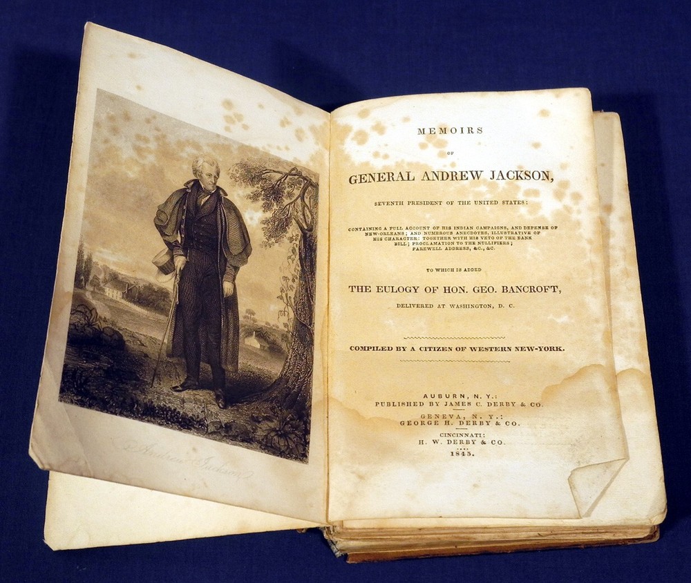 This is for a Antique Book: Memoirs of General Andrew Jackson - Seventh President of the United States by a Citizen of Western New York . Leather Bound Hardcover Book, published by James C. Derby, dated 1845 on title page; approximately 7 in. by 4-7/8 in ., 270 pages. Book has wear, stains, front cover and most of spine are missing, binding is coming apart, a blank page in back is missing, etc., see also pictures. Sold AS IS! Buyer to pay $5.00 for shipping and handling for U.S. address. We ship worldwide. International costs to be determined. Please click on 'See Details' for quote. We combine shipping if possible. Please take the time to read the following: Payment should be received within 3 days of purchase. We only ship to the address shown on the paypal payment. Because we are selling fresh items from estates, barns, etc., expect signs of wear and usage appropriate with the age of such items. We usually take multiple photographs of an item. Please check for a second row of photos, they often are there but can be overlooked. Photographs are part of the description and show all that is included. We photograph and accurately describe every item as to its condition and authenticity to the best of our ability. If you have any questions, please let us know. We often have similar items available, so please see our Other Items , or go to our 'ewkauctions' ebay store .