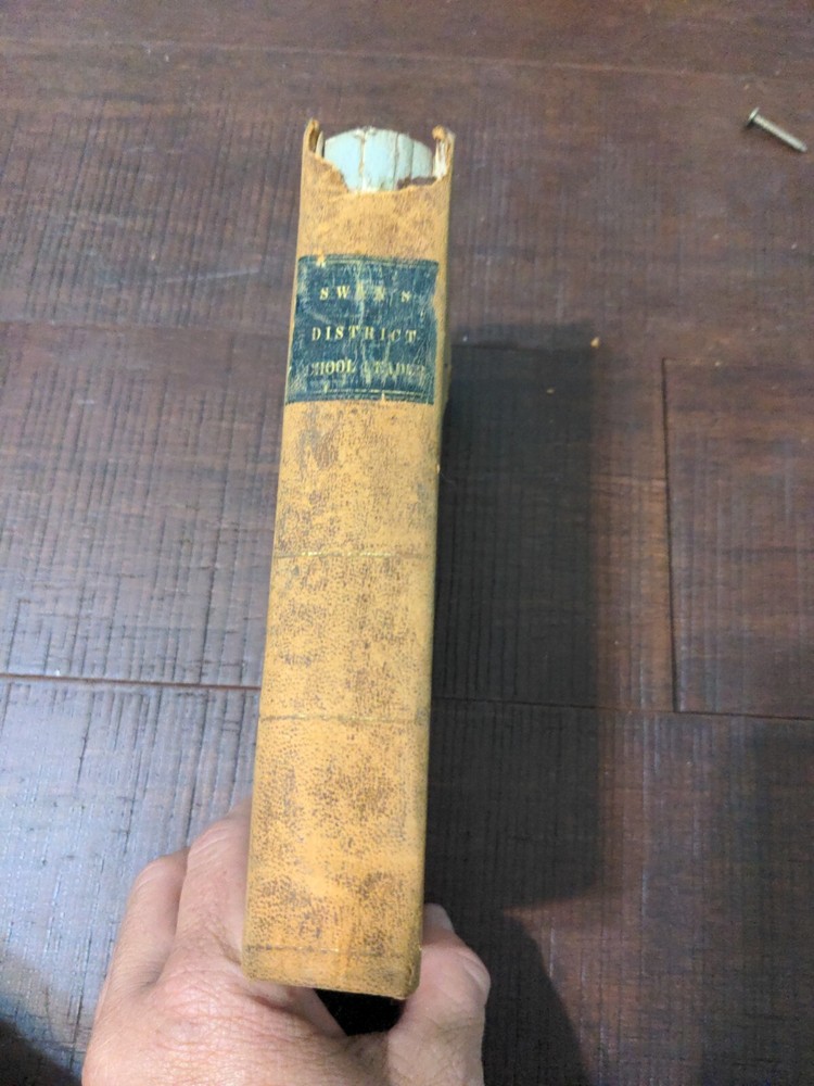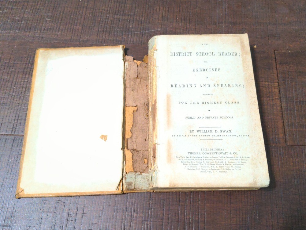 1845 The District School Reader by Swan - Leather. Cover needs to be glued or restored. Binding ok. See pics.