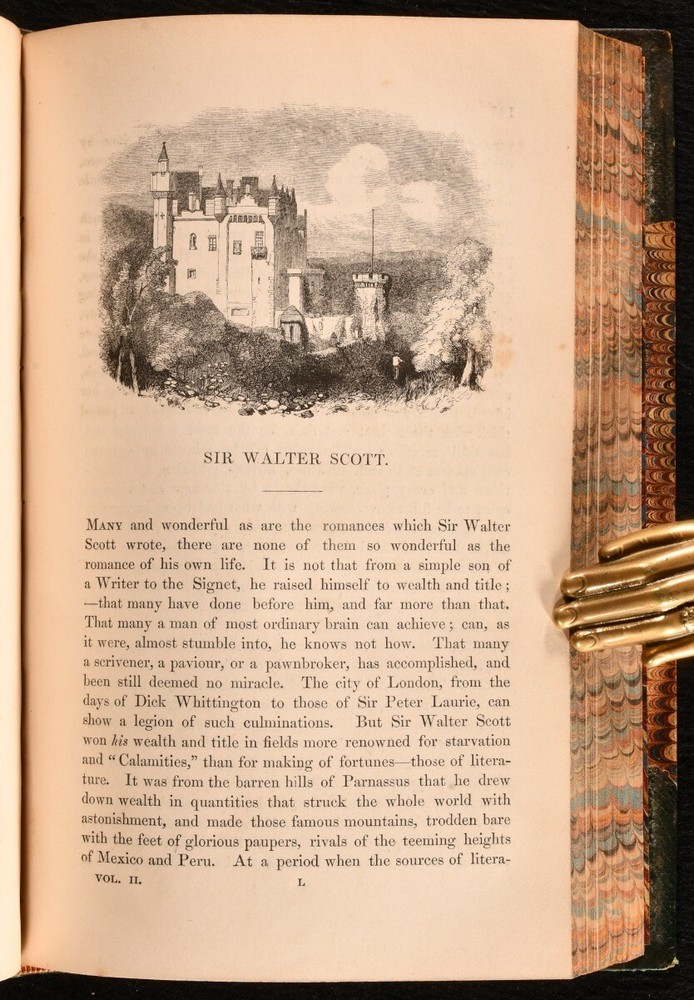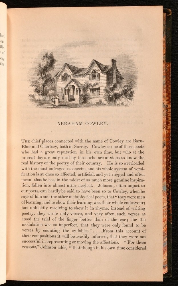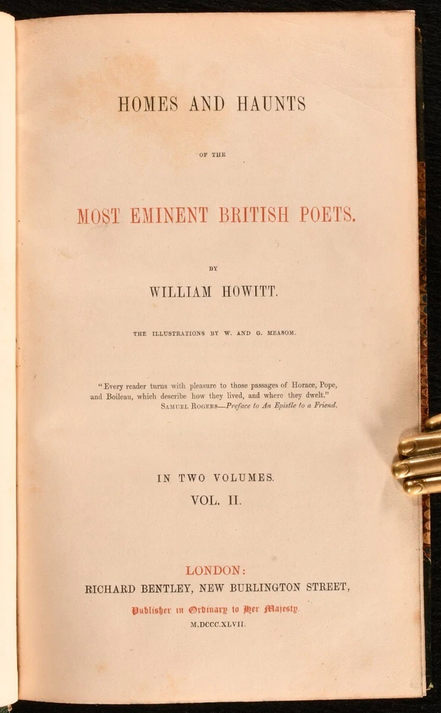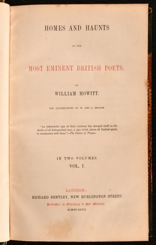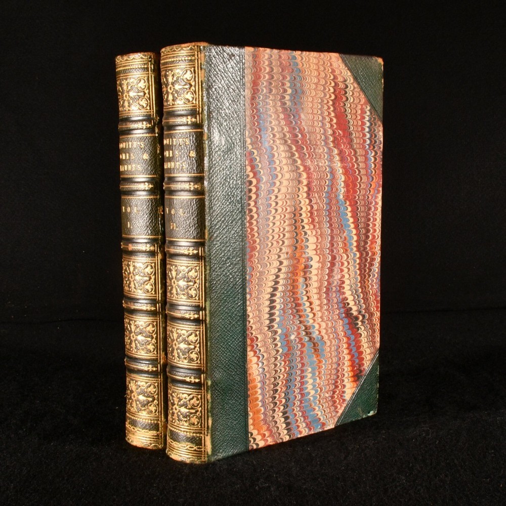 Click here to see our other books! Homes and Haunts of the Most Eminent British Poets William Howitt 1847 Richard Bentley : London 9" by 6" 2-504; 473pp SUMMARY Two smartly bound first edition volumes discussing the favoured locations of the most famous poets in the English language. Illustrated throughout. First Edition,Illustrated,Leather Binding Overall Condition: Very Good This book weighs 2 KG when packed UK Postage: £ 3.99 US Postage: £ 19.99 EU Postage : £ 21.99 European Postage: £ 23.99 Asia Postage: £ 37.99 Worldwide Postage: £ 38.99 DESCRIPTION The complete two volume first edition set of prolific English writer and historian William Howitt's study of the lives of 'Eminent British Poets', in half morocco bindings, and illustrated throughout. Within these works, Howitt details the residences and regularly visited locations of the most recognisable poets of the English language, with the publisher's advertisement explaining that it was necessary to excluded 'the Dramatic Poets for separate treatment' for the sake of length. With such figures as Chaucer, Shelley, Spencer Byron and Keats explored in volume I, and Felicia Hemans, Baillie, Wordsworth and Tennyson in volume II. Illustrated throughout with vignette illustrations of the locations mentioned by British engravers George Samuel Measom and W. Measom. CONDITION In half morocco bindings, with gilt detailing to back strips, and paper covered boards. Rubbing to spine tails and joints, most prominent to rear joint of volume I, where there is loss to leather, not affecting binding. Rubbing to extremities, with loss to leather to head of front board of volume I. Bookseller's labels to front pastedowns. Internally, firmly bound. The odd spot throughout, most concentrated to the first few leaves of each volume. Overall Condition: Very Good GLOSSARY OF TERMS Overall Condition (Dustwrapper condition rating is shown after that for the book itself, where a dustwrapper is present) Fine - Very well preserved copy showing very little wear Very Good Indeed - Only one or two minor faults, really a very attractive copy Very Good - Quite a wide term meaning no major faults but probably several smaller ones often expected given the age of the book, but still a respectable copy Good - Meaning not very good. Some more serious faults as will be described in the condition report under 'condition' Good Only - Meaning one or more faults that could really do with repair Fair - As with good only above but with other faults leaving a compromised copy even after repair Poor - Really bad and possibly seriously incomplete. We only sell books in this condition where their rarity or value makes them attractive none the less. Major defects will be described. GUARANTEE We offer a full money back guarantee on our descriptions. Please ask for details and conditions. We prefer PAYPAL. If you pay via PAYPAL we will post the item off the same or the next working day with the postage you have selected. Please note we cannot accept USD cheques