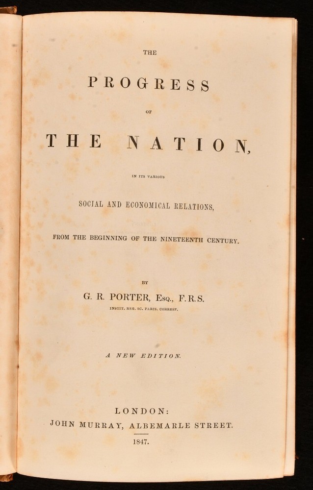 Click here to see our other books! The Progress of the Nation in its Various Social and Economical Relations, From the Beginning of the Nineteenth Century G. R. Porter 1847 John Murray : London 9" by 5.5" xxiii, 846pp. SUMMARY A very smart new edition of this socio-economic study of Britain at the start of the nineteenth century. Leather Binding,Original Binding,Publishers' Original Binding Overall Condition: Very Good Indeed This book weighs 2 KG when packed UK Postage: £ 3.99 US Postage: £ 29.99 EU Postage : £ 21.99 European Postage: £ 23.99 Asia Postage: £ 37.99 Worldwide Postage: £ 38.99 DESCRIPTION New edition in one volume. Original published in three volumes. A comprehensive socio-economic study of Britain, with reference to population, occupations, emigration, agriculture, manufacturers, trade, currency, communication, consumption, and much more. Also includes chapters on education, colonisation, and crime. Written by George Richard Porter, an English statistician who became head of the statistical department of the Board of Trade. CONDITION In the original full cloth binding. Externally, very smart with light shelf wear and the odd mark to the board. Fading to the spine. Internally, firmly bound. Pages are very bright and clean with light spotting to the first and last few pages. Overall Condition: Very Good Indeed GLOSSARY OF TERMS Overall Condition (Dustwrapper condition rating is shown after that for the book itself, where a dustwrapper is present) Fine - Very well preserved copy showing very little wear Very Good Indeed - Only one or two minor faults, really a very attractive copy Very Good - Quite a wide term meaning no major faults but probably several smaller ones often expected given the age of the book, but still a respectable copy Good - Meaning not very good. Some more serious faults as will be described in the condition report under 'condition' Good Only - Meaning one or more faults that could really do with repair Fair - As with good only above but with other faults leaving a compromised copy even after repair Poor - Really bad and possibly seriously incomplete. We only sell books in this condition where their rarity or value makes them attractive none the less. Major defects will be described. GUARANTEE We offer a full money back guarantee on our descriptions. Please ask for details and conditions. We prefer PAYPAL. If you pay via PAYPAL we will post the item off the same or the next working day with the postage you have selected. Please note we cannot accept USD cheques