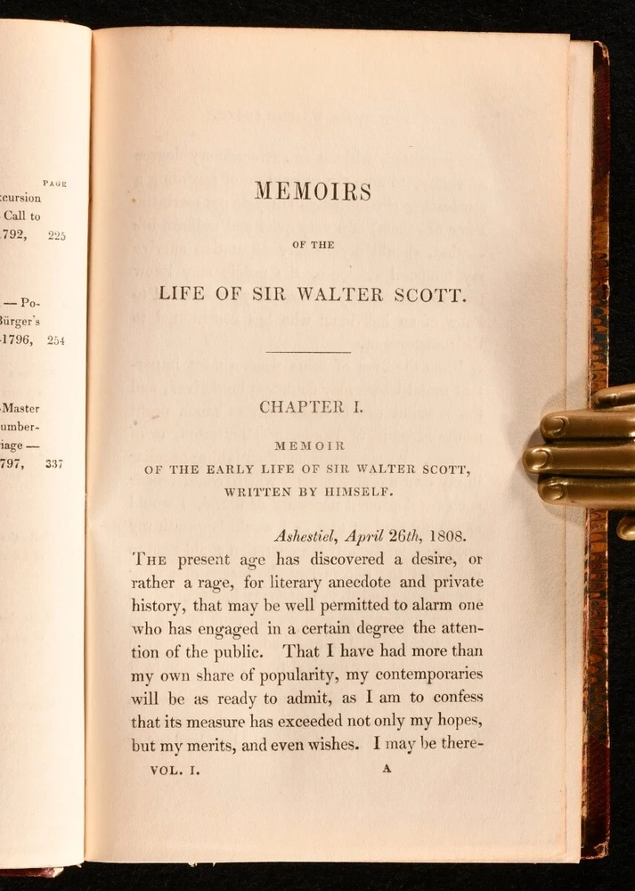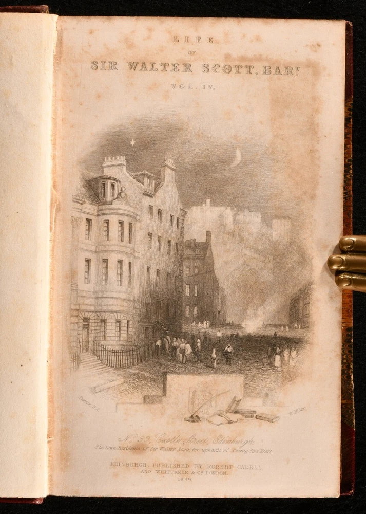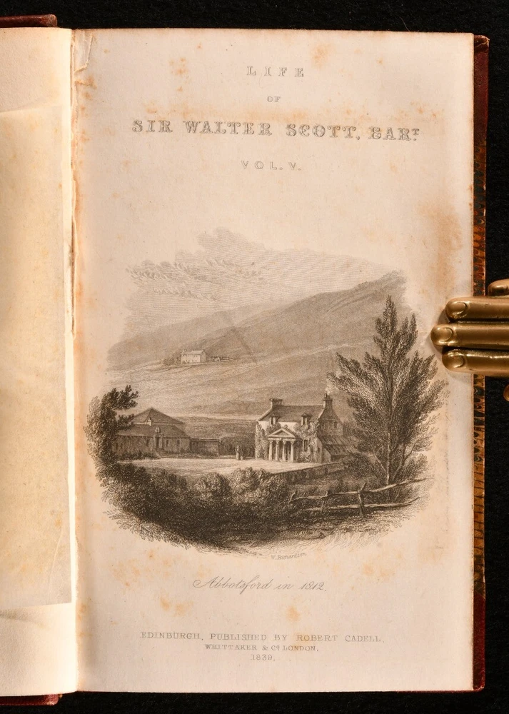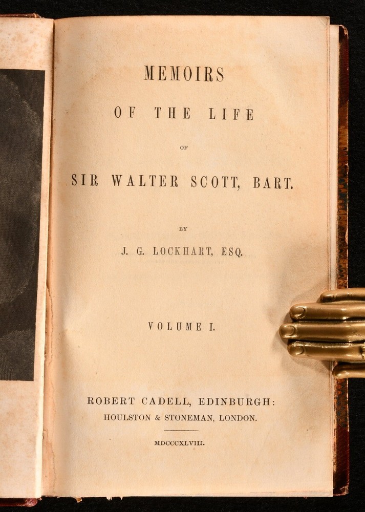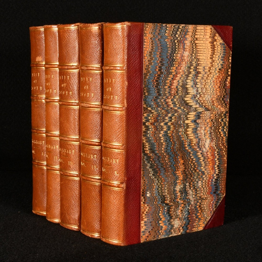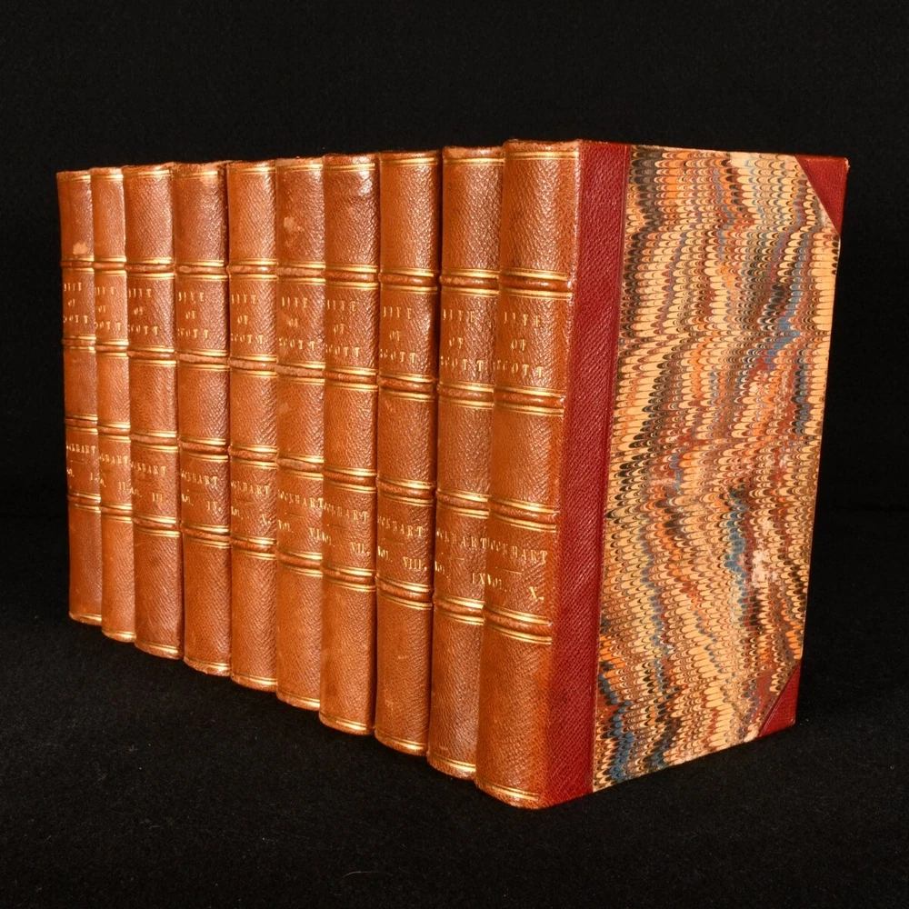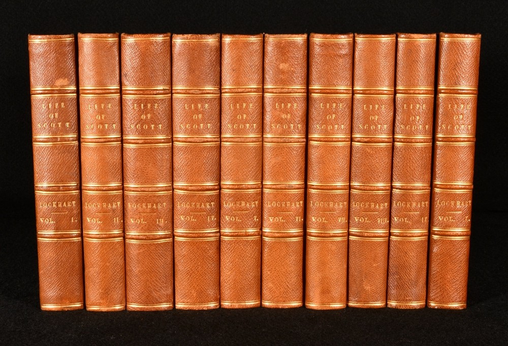 Click here to see our other books! Memoirs of the Life of Sir Walter Scott, Bart. J. G. Lockhart 1848 Robert Cadell; Houlston & Stoneman : Edinburgh & London 7" by 4.5" SUMMARY A beautiful ten volume biography of Sir Walter Scott, written by J. G. Lockhart and bound in contemporary leather. Leather Binding Overall Condition: Near Fine This book weighs 5 KG when packed UK Postage: £ 4.49 US Postage: £ 42.99 EU Postage : £ 27.99 European Postage: £ 45.99 Asia Postage: £ 74.99 Worldwide Postage: £ 129.99 DESCRIPTION This was an acclaimed biography, written by the author's son-in-law and first published in seven volumes between 1837 and 1838. It included the publication of many of the author's letters. It has been described as 'the most admirable biography in the English language' after Boswell's 'Life of Johnson'. Sir Walter Scott (1771-1832) was a Scottish novelist and poet. Scott remains a celebrated figure in Scottish literary history, and the landscape of Scotland features heavily in his works. He was also a political figure, prominent within the Tory establishment, and served as President of the Royal Society of Edinburgh for twelve years, between 1820 and 1832. He was a member of Clan Scott, a prominent Scottish clan. Containing the ownership inscription of Wilfred De Winton (1856-1929), a major benefactor of the National Museum of Wales, who donated over two thousands pieces of eighteenth and nineteenth century porcelain. All ten volumes of this work are present. Each volume is complete with an engraved title page and frontispiece illustration, bar volume I, which is lacking the engraved title page but has a frontispiece illustration. Volume IV and V are lacking a frontispiece. Volume VI also has a folding facsimile plate. In a charming leather binding, with marbled boards, edges and endpapers. A splendid copy of this insightful work. CONDITION In a half crushed morocco binding. Externally very smart, with just occasional rubbing to the spines and extremities. Ownership inscription to the verso of the front endpaper. Volume IV and V are lacking a frontispiece, and volume I is lacking the engraved title page. Pages are bright and clean. Overall Condition: Near Fine GLOSSARY OF TERMS Overall Condition (Dustwrapper condition rating is shown after that for the book itself, where a dustwrapper is present) Fine - Very well preserved copy showing very little wear Very Good Indeed - Only one or two minor faults, really a very attractive copy Very Good - Quite a wide term meaning no major faults but probably several smaller ones often expected given the age of the book, but still a respectable copy Good - Meaning not very good. Some more serious faults as will be described in the condition report under 'condition' Good Only - Meaning one or more faults that could really do with repair Fair - As with good only above but with other faults leaving a compromised copy even after repair Poor - Really bad and possibly seriously incomplete. We only sell books in this condition where their rarity or value makes them attractive none the less. Major defects will be described. GUARANTEE We offer a full money back guarantee on our descriptions. Please ask for details and conditions. We prefer PAYPAL. If you pay via PAYPAL we will post the item off the same or the next working day with the postage you have selected. Please note we cannot accept USD cheques