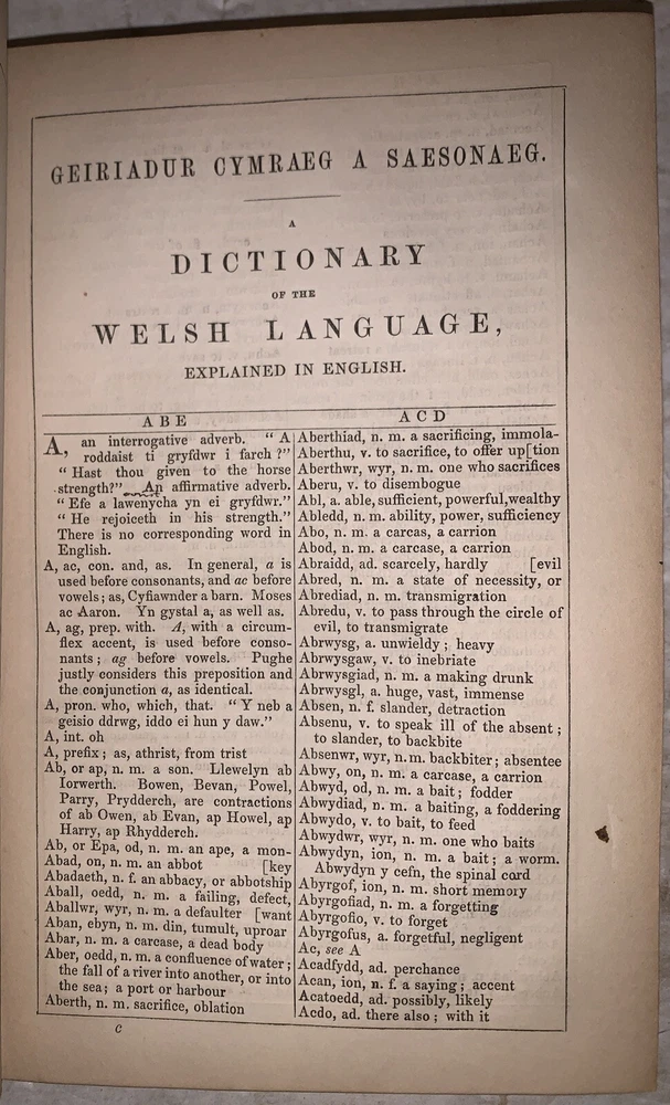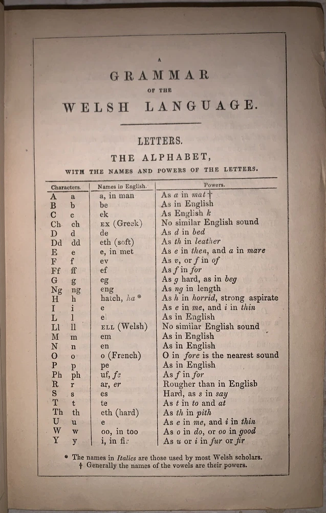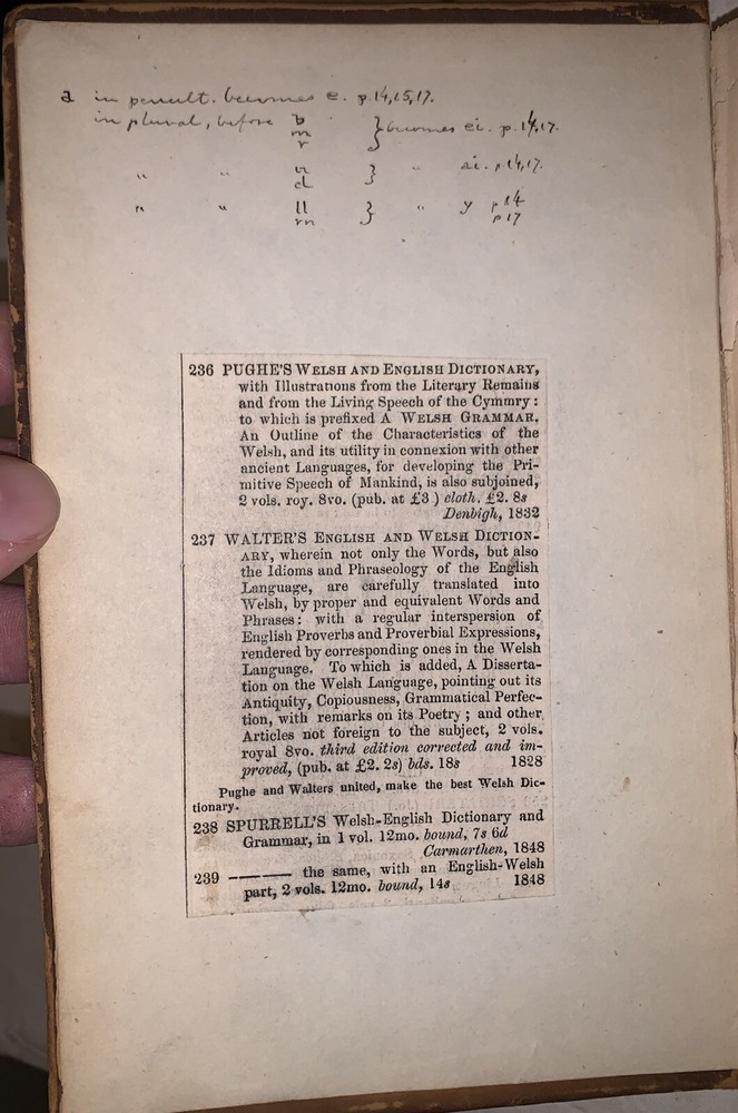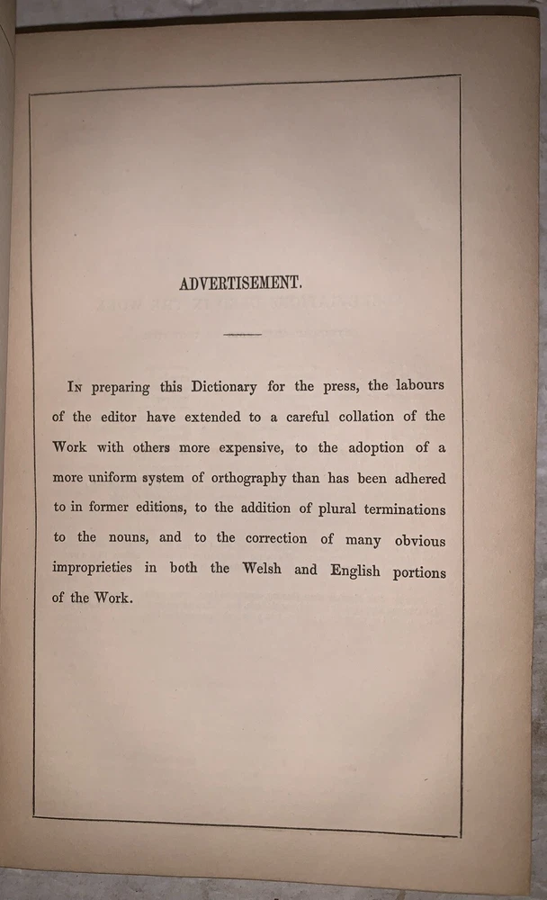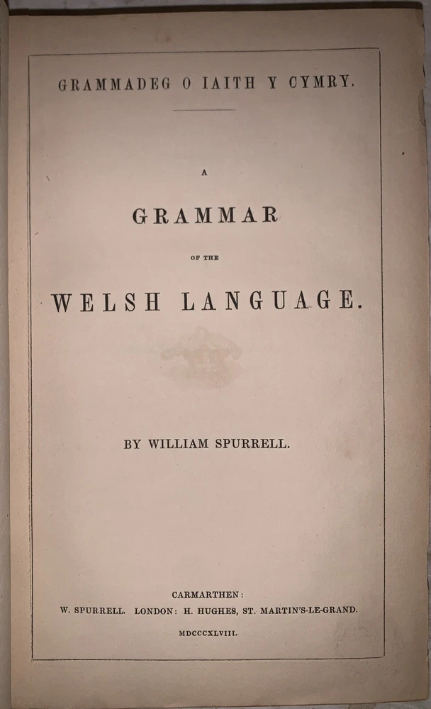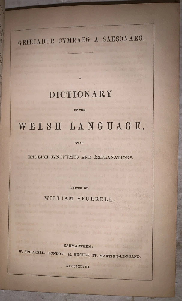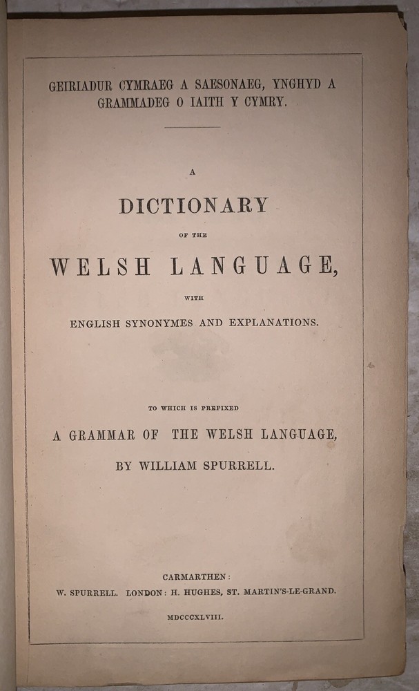 Geiriadur Cymraeg a Saesonaeg : ynghyd a grammadeg o iaith y Cymry A Dictionary of the Welsh language, with English Synonymes and Explanations To Which is Prefixed A Grammar of the Welsh Language by William Spurrell Carmarthen: W. Spurrell 1848 First Edition 12mo, vii, [1], 80, [4], 303, [1] pages, bound in period full leather with small raised and gilt bands to spine. Text in English and Welsh. Top board and title page detached. Old ink stamp and some other markings by the prior owner's. Some rubbing and wear, scuffs, foxing and discoloration, else in good condition. A Dictionary of the Welsh Language by William Spurrell, first published in 1848, is an essential work in Welsh lexicography and a cornerstone for preserving the Welsh language. Designed as a bilingual reference, the dictionary offers comprehensive definitions in Welsh alongside English explanations, making it a valuable resource for both native speakers and learners. Spurrell’s work emerged at a critical time when the Welsh language faced cultural and political pressures, and his dictionary played a significant role in safeguarding linguistic heritage. Later revised by J. Bodvan Anwyl in the early 20th century, the dictionary has remained relevant and respected over the years. Spurrell's dedication to Welsh language preservation shines through in this meticulous work, which continues to be a treasured resource for anyone studying or celebrating Welsh language and culture. If you have any questions, feel free to ask, and don't forget to check out my other listings.