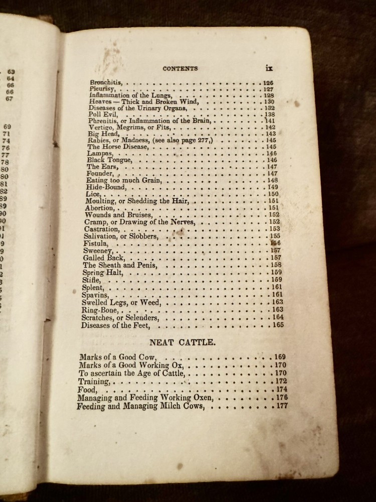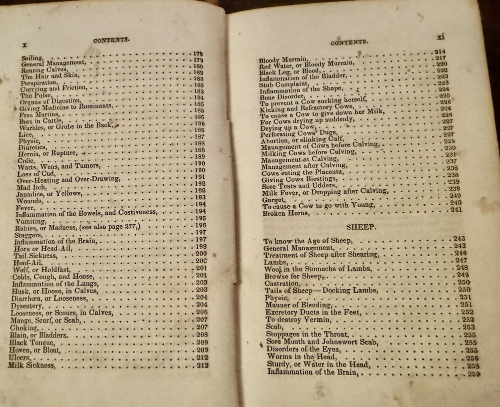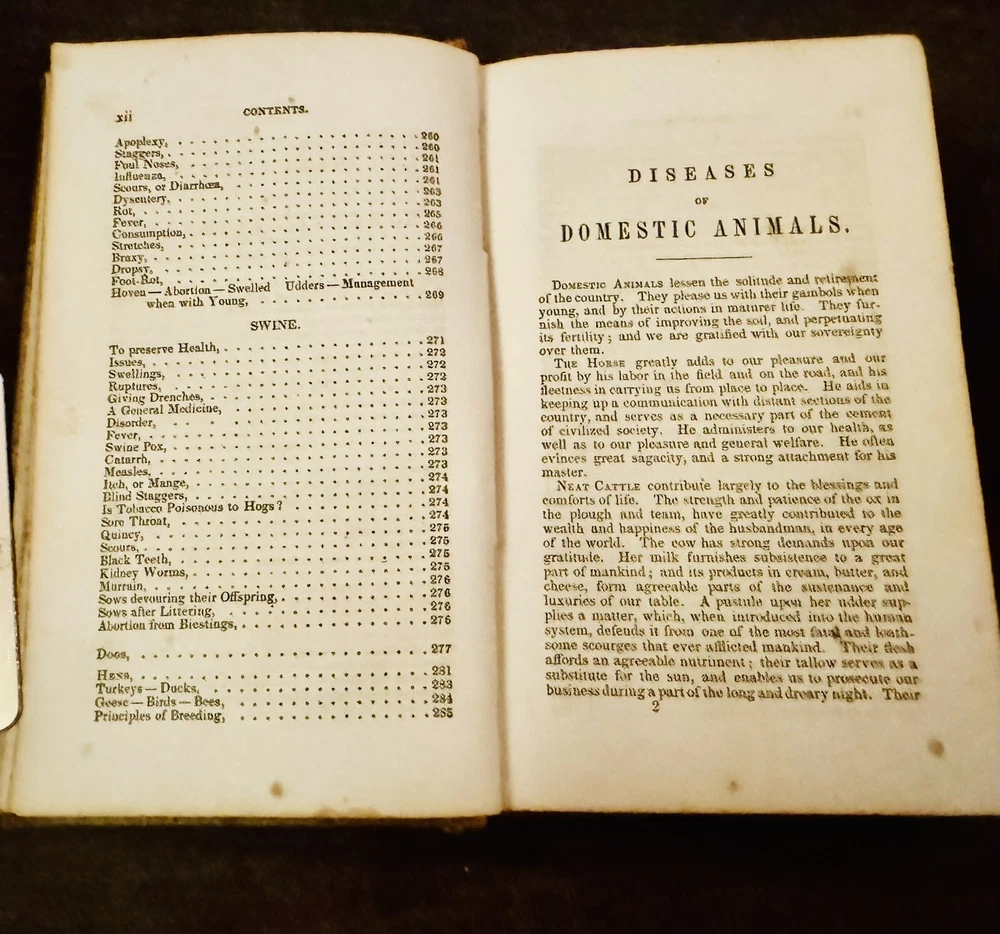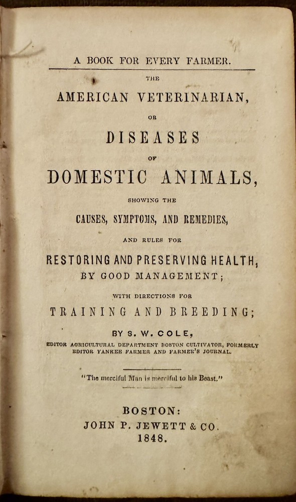 A Book for Every Farmer THE American Veterinarian Of DOMESTIC ANIMALS Showing The CAUSES, SYMPTOMS, AND REMEDIES And rules for Restoring and Preserving Health by Good Management With Directions for Training and Breeding. By S. W. COLE * Boston: JOHN P. JEWETT & CO. 1848 ~ Leather hard cover, measures 3 ½ x 6 inches 288 pages * Covers are worn, spine ends are chipped, scratches, staining to cover. Corners rubbed down. Foxing and staining on many pages.