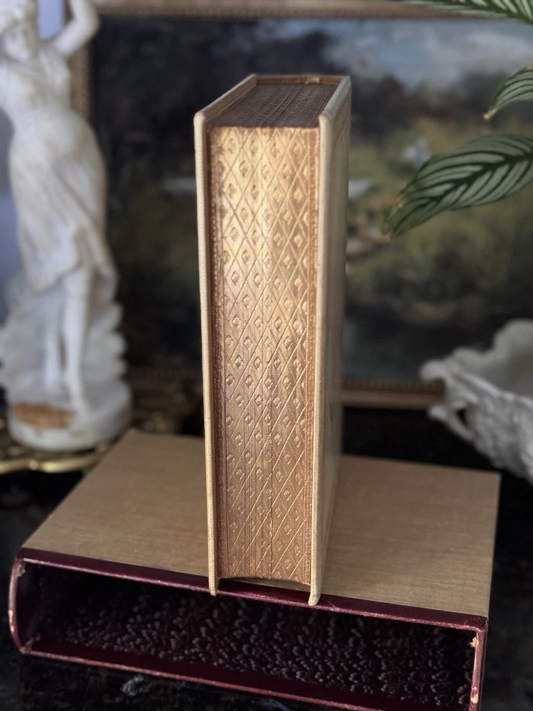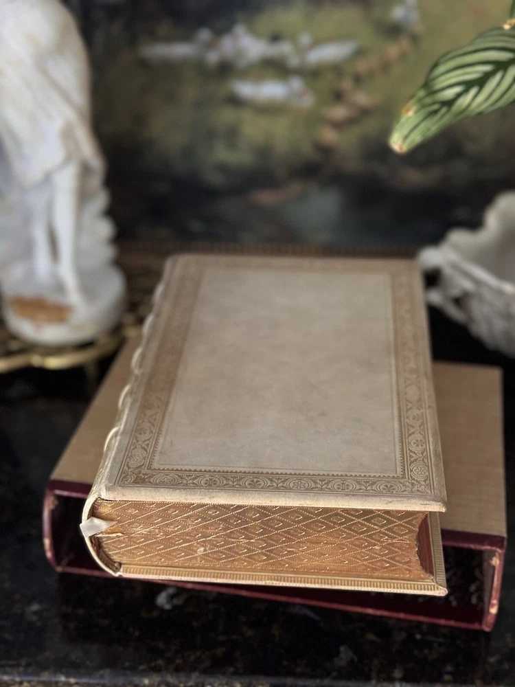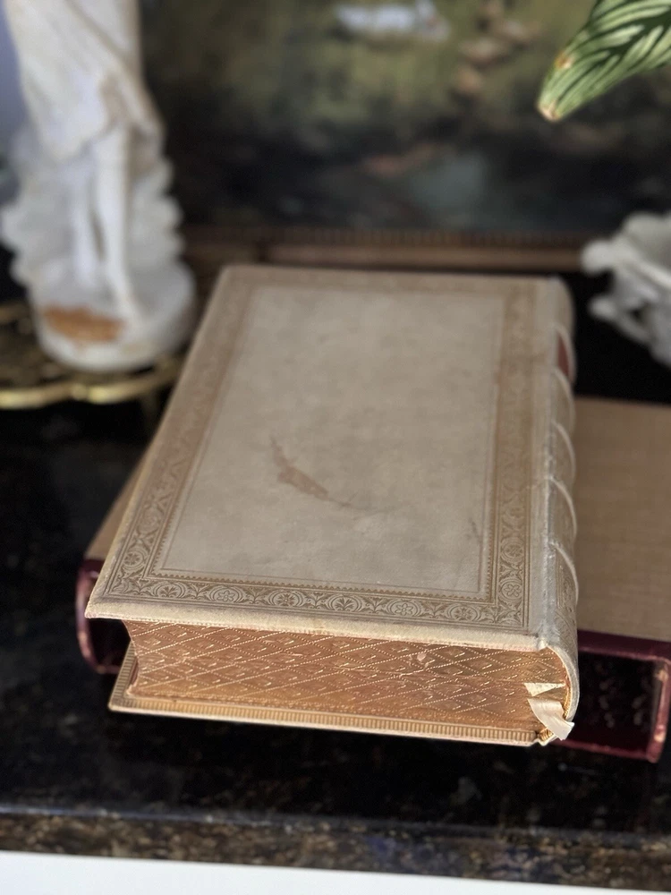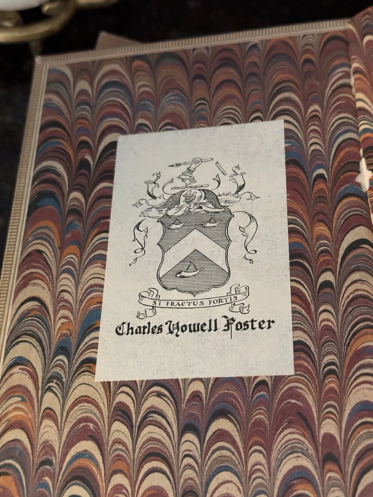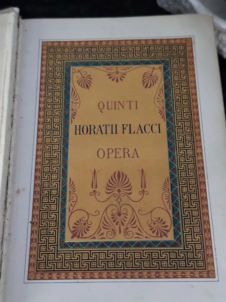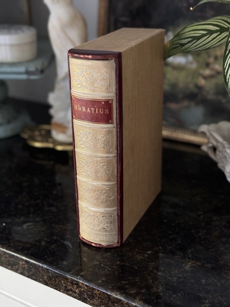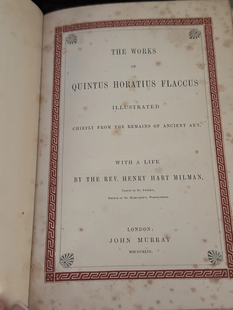 1849 The Works of Horatius Quintus Flacuss With A Life By The Rev. Henry Hart Milman Written by Owen Jones Chromolithographed pages, vellum binding, gauffered gilded edges, woodcuts, original book sleeve, prize bookplate & inscription, oh my! The pages are surrounded by decorative borders cut on wood and printed in color. There are monochromed drawings throughout and eight chromolithographed pages. Hundreds of woodcuts of statues, gems, coins, people, etc. Condition: VERY Good. There’s some foxing to pages but most are clean. The front cover has started to separate but it’s still tight and holding. The binding is strong and I can’t find any tears or marks to the interior pages. Some bookmarked pages with newspaper clippings that are still tucked into various pages. There is a prize inscription on the second page dated 1853 and a book plate (Charles Howell Foster) that seems unrelated to the inscription.