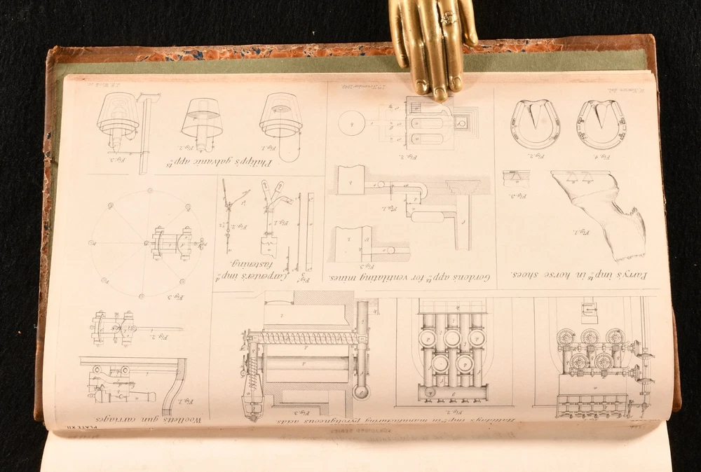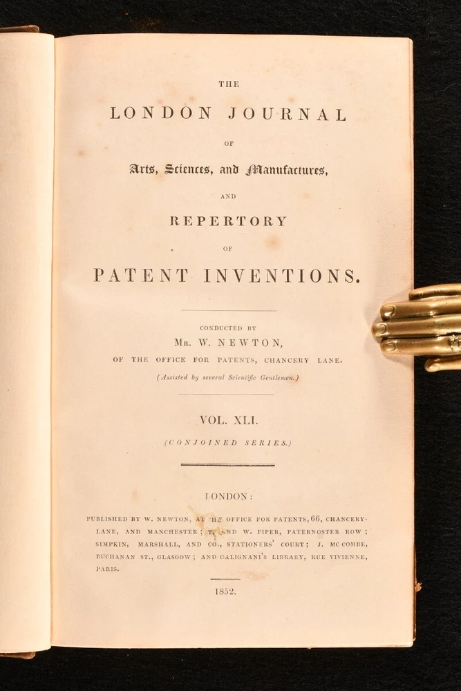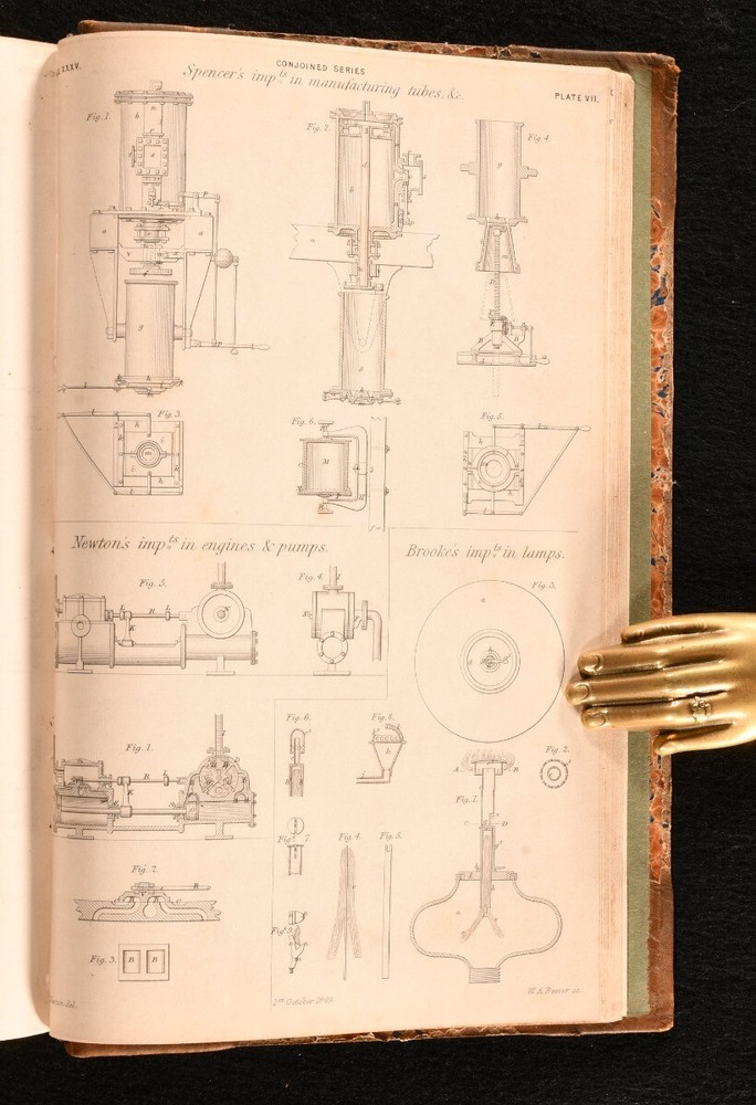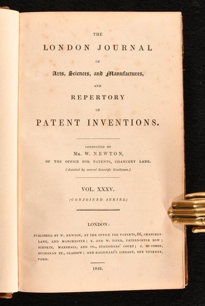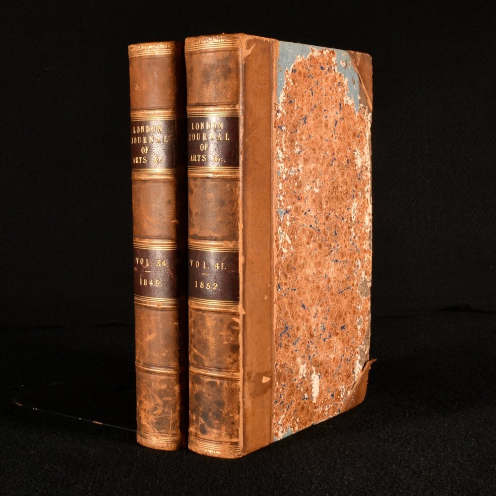 Click here to see our other books! The London Journal of Arts, Sciences, and Manufactures, and Repertory of Patent Inventions Vol. XXXV; Vol. XLI (Conjoined Series) W. Newton 1849-52 W. Newton; T. and W. Piper; Simpkin, Marshall, and Co.; et al. : London 9" by 5.5" xi, 448; x, 480pp. SUMMARY A very scarce collection of two volumes of the London Journal of arts, sciences, and manufactures conducted by W. Newton, with numerous plates. Folding Plates,Illustrated,Leather Binding,Rebound,Very Scarce Overall Condition: Very Good This book weighs 2 KG when packed UK Postage: £ 3.99 US Postage: £ 29.99 EU Postage : £ 21.99 European Postage: £ 23.99 Asia Postage: £ 37.99 Worldwide Postage: £ 38.99 DESCRIPTION Two very scarce volumes of The London Journal of Arts, Sciences, and Manufactures, and Repertory of Patent Inventions conducted by W. Newton, of the office for patents and other scientific men. The present collection comprising se conjoined series of Vol. XXXV of 1849, and Vol. XLI of 1852. This journal is comprised of early scientific developments and contemporary patents, these volumes including articles on Christian Schiele's invention of improvements in the construction of cocks of valves, also applicable to reducing the friction of axles, journals, and other rubbing surfaces; Edward Schunck, for improvements in the manufacture of malleable iron; Wiliam Edward Newton, for an improvement in the construction of wheels (being a communication); Andrew Shank's improved mode of giving form to certain metals when in a fluid or molten state; &c. Each volume is accompanied by full page plates with numerous figures to accompany the articles. Collated, complete with eighteen to volume I, and twelve folding to volume II. In uniform bindings. Lacking the half titles. CONDITION In a half calf binding over marbled boards with new endpapers. Externally sound with some shelf wear and rubbing to the boards and spine, as well as minor chipping to the extremities. Internally, firmly bound. With some minor spotting to the first and last few leaves, particularly to the leaves of plates, otherwise the pages are generally very clean with only a touch of age toning, as usual. Each volume is accompanied by full page plates with numerous figures to accompany the articles. Collated, complete with eighteen to volume I, and twelve folding to volume II. Overall Condition: Very Good GLOSSARY OF TERMS Overall Condition (Dustwrapper condition rating is shown after that for the book itself, where a dustwrapper is present) Fine - Very well preserved copy showing very little wear Very Good Indeed - Only one or two minor faults, really a very attractive copy Very Good - Quite a wide term meaning no major faults but probably several smaller ones often expected given the age of the book, but still a respectable copy Good - Meaning not very good. Some more serious faults as will be described in the condition report under 'condition' Good Only - Meaning one or more faults that could really do with repair Fair - As with good only above but with other faults leaving a compromised copy even after repair Poor - Really bad and possibly seriously incomplete. We only sell books in this condition where their rarity or value makes them attractive none the less. Major defects will be described. GUARANTEE We offer a full money back guarantee on our descriptions. Please ask for details and conditions. We prefer PAYPAL. If you pay via PAYPAL we will post the item off the same or the next working day with the postage you have selected. Please note we cannot accept USD cheques