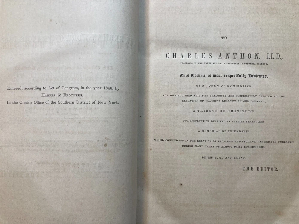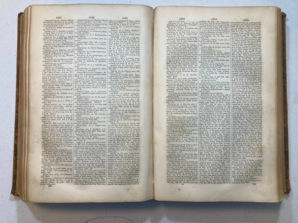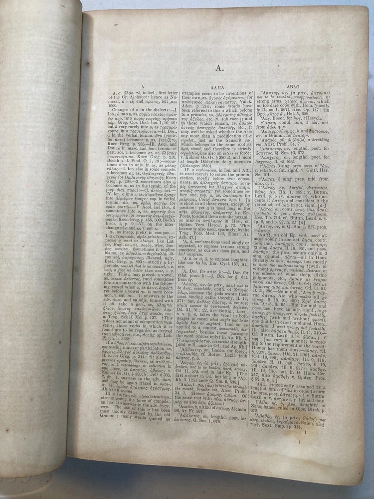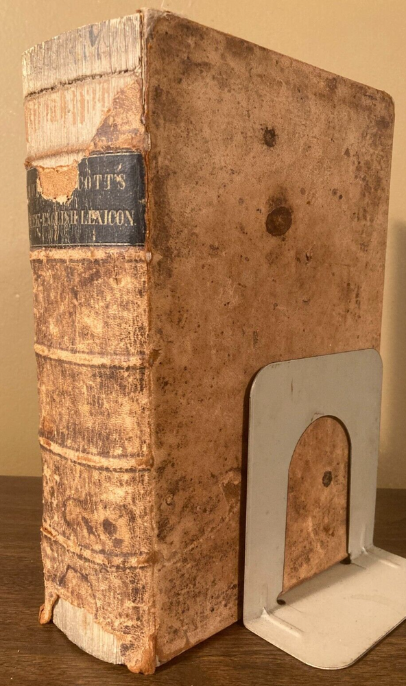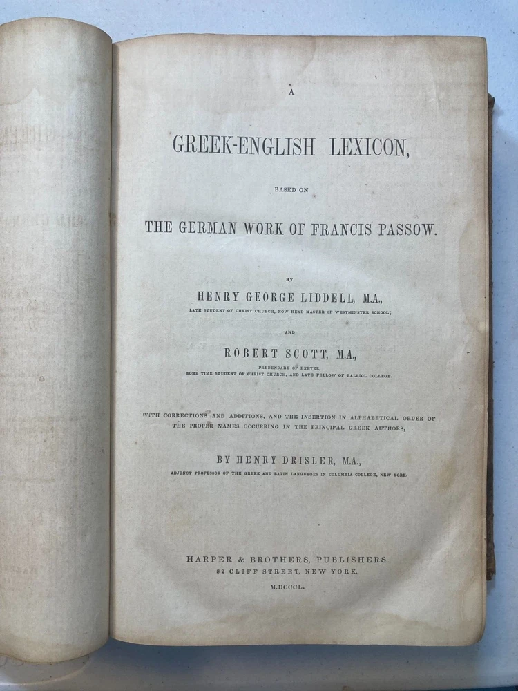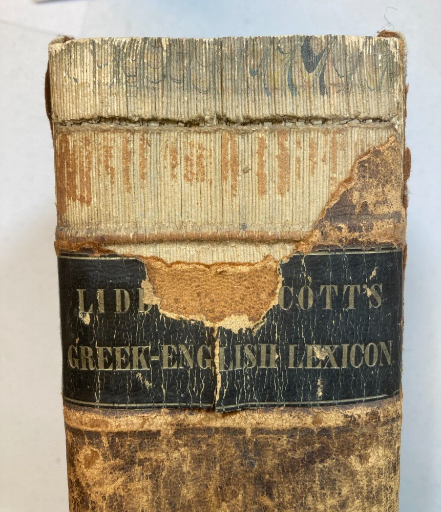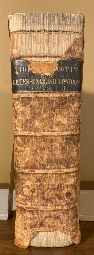 This is A Greek-English Lexicon based on the German work of Francis Passow by Henry George Liddell et al. with corrections and additions and insertion in alphabetical order of the proper names... by Henry Drisler. Published in 1850 by Harper & Brothers. Publishers. 1705 pages, leather calf binding with marbled endpapers. If you're a serious student of the Greek New Testament, the Septuagint (LXX), and the early church fathers, then Liddell-Scott's Greek-English Lexicon is a must have. This 174 year old resource is what started it all, and is still a useful reference and collectable to this day. Please see photos for more on contents and condition. Top and bottom parts of spine covering are missing. Corners are worn thru to the boards. Calf leather covers have tan markings. A name and design is stamped on one of the front blank endpapers. A few pages at start of book have edge stains, pages are clean overall, starting to tone, edges of some pages are worn or chipped. Binding is intact. Thanks for looking ! r160