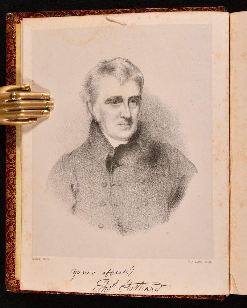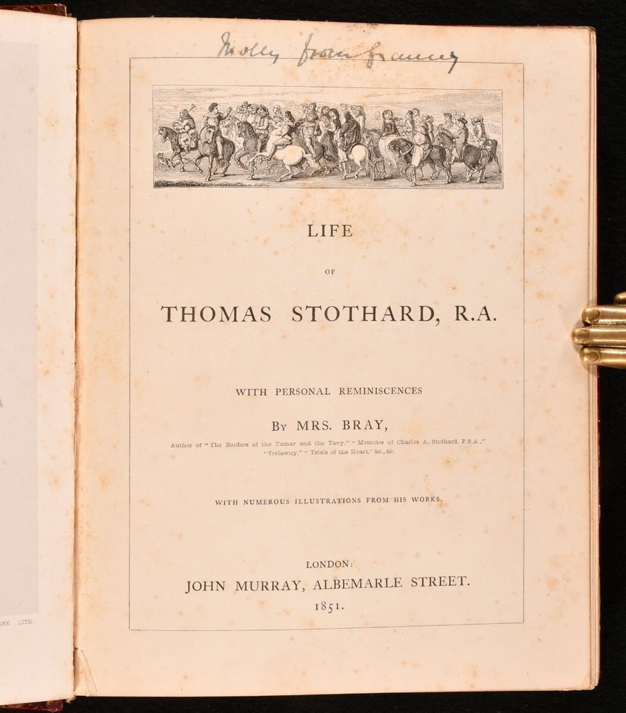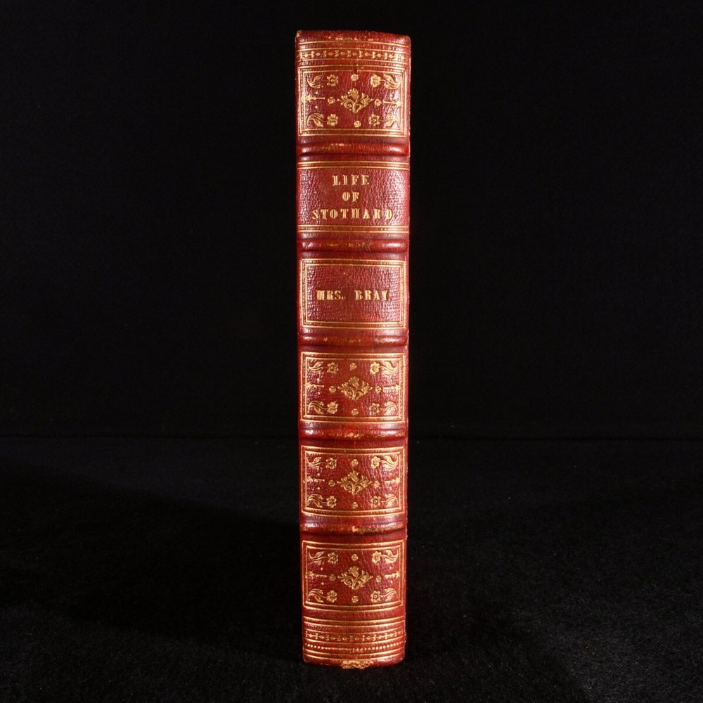 Click here to see our other books! Life of Thomas Stothard Mrs. Bray 1851 John Murray : London 8.5" by 7" xxiv, 246, 16pp SUMMARY A lovely and insightful first edition into the life of this British painter, richly illustrated throughout from his work. First Edition,Illustrated,Leather Binding Overall Condition: Very Good This book weighs 1 KG when packed UK Postage: £ 3.99 US Postage: £ 22.99 EU Postage : £ 16.99 European Postage: £ 17.99 Asia Postage: £ 22.99 Worldwide Postage: £ 28.99 DESCRIPTION Thomas Stothard was an English painter and illustrator; his illustrations included for 'Robinson Crusoe' and 'The Pilgrim's Progress'. A student of the Royal Academy, he contributed regularly to the Novelist's Magazine. He also designed the staircases of Burghley House, and the cupola of the upper hall of the Advocate's Library, Edinburgh, as well as a shield presented to the Duke of Wellington. Written by the author's daughter-in-law, Anna Aliza Bray, a historical novelist and writer of non-fiction. With wonderful illustrations throughout the text from Stothard's own designs. Bound with sixteen leaves of publisher's advertisements to the rear of the work. The first edition of this work. CONDITION In a full crushed morocco binding. Externally generally smart, with some slight bumping to the extremities and a little rubbing to the spine. Ownership inscription to the front pastedown in pencil and the rear pastedown in pen. Internally, binding is occasionally tender throughout. Pages are a little spotted. Overall Condition: Very Good GLOSSARY OF TERMS Overall Condition (Dustwrapper condition rating is shown after that for the book itself, where a dustwrapper is present) Fine - Very well preserved copy showing very little wear Very Good Indeed - Only one or two minor faults, really a very attractive copy Very Good - Quite a wide term meaning no major faults but probably several smaller ones often expected given the age of the book, but still a respectable copy Good - Meaning not very good. Some more serious faults as will be described in the condition report under 'condition' Good Only - Meaning one or more faults that could really do with repair Fair - As with good only above but with other faults leaving a compromised copy even after repair Poor - Really bad and possibly seriously incomplete. We only sell books in this condition where their rarity or value makes them attractive none the less. Major defects will be described. GUARANTEE We offer a full money back guarantee on our descriptions. Please ask for details and conditions. We prefer PAYPAL. If you pay via PAYPAL we will post the item off the same or the next working day with the postage you have selected. Please note we cannot accept USD cheques