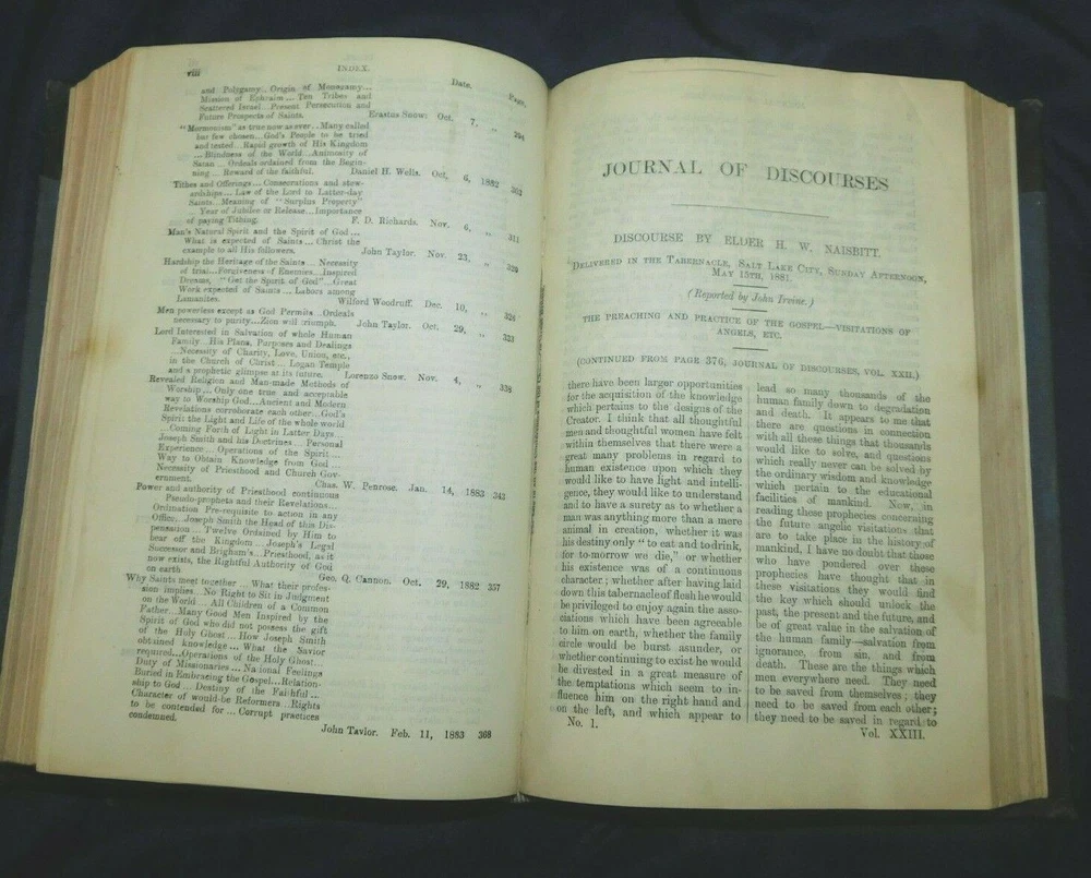 THE LATTER-DAY SAINTS MILLENNIAL STAR 1851 volume XIII (includes all 24 issues for the year) 380 pages It also includes JOURNAL OF DISCOURSES By President John Taylor Vol XXIII, 1883 Title page, index, and 376 pages It measures 5 1/2" x 8 3/4" Condition: Very Good The cloth covered boards as well as the leather corners and spine have some rubbing but have no cracks or tears. The boards are sturdy, no soft corners. The gold gilt bands and lettering on the spine are bright and bold. The binding is tight. It has a Cedar City Public Library sticker on the inside front cover and has a library marking on the spine. It also has a gift note written on the front fly page. The title page also has a library markings and pencil writing on the top edge. Most of the pages are in excellent condition. It has about 10 intermittent pages with light chipping to the edges that does not affect the print. Page 237 of the Journal of Discourses has a stain, please see picture.
