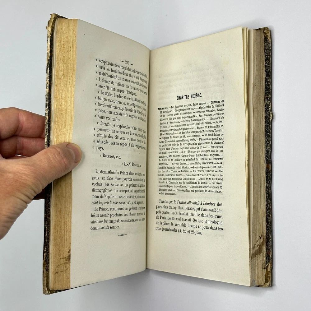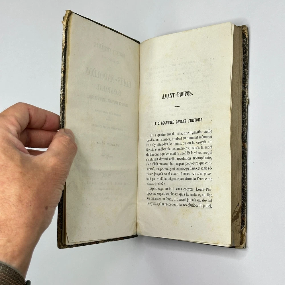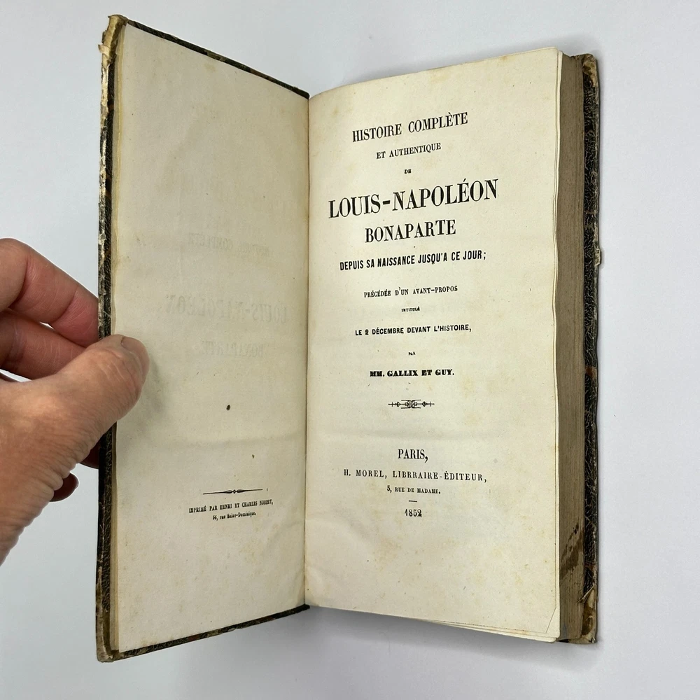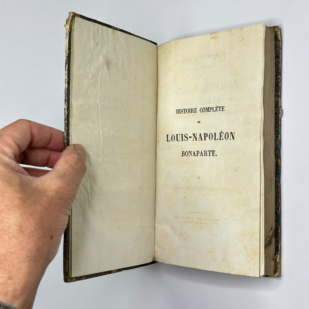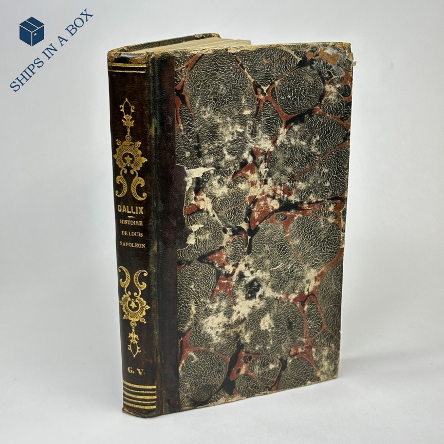 "Histoire Complete de Louis-Napoleon Bonaparte" Jean Claude Barthélemy Gallix & Guy de l'Herault 1852 H. Morel, Librraire-Editeur Quarter Leather Size: 5.5" x 9" This book provides an account of the life and political career of Louis-Napoleon Bonaparte, focusing on his political endeavors, including his presidency during the French Second Republic and his eventual proclamation as Emperor Napoleon III. Condition: Strong binding. Shelf wear and scuffing to boards; rubbed corners and edges. Chipping at spine bottom. Foxed and stained text block edges. Damp-stained bottom gutter on first/last few pages. Foxing and wrinkling to endpapers and adjacent few pages, then lighter foxing throughout. No markings. No scent. See pictures for condition references. Please ask any questions before purchasing. ----------- Orders are carefully packed and shipped in boxes using USPS Media Mail. Orders placed before 2pm ET are shipped the same business day, unless we are away sourcing additional inventory. We combine shipping on orders with multiple items.