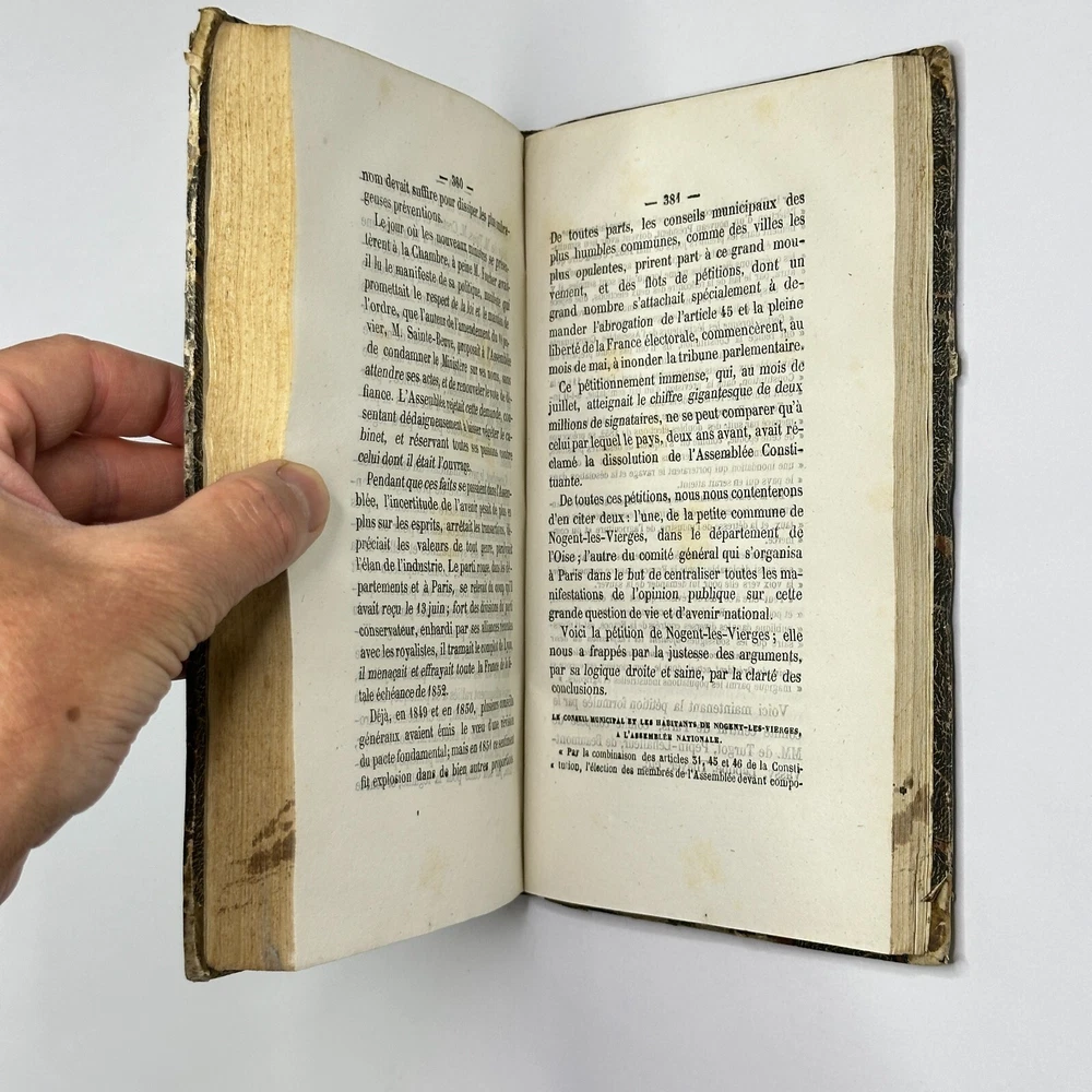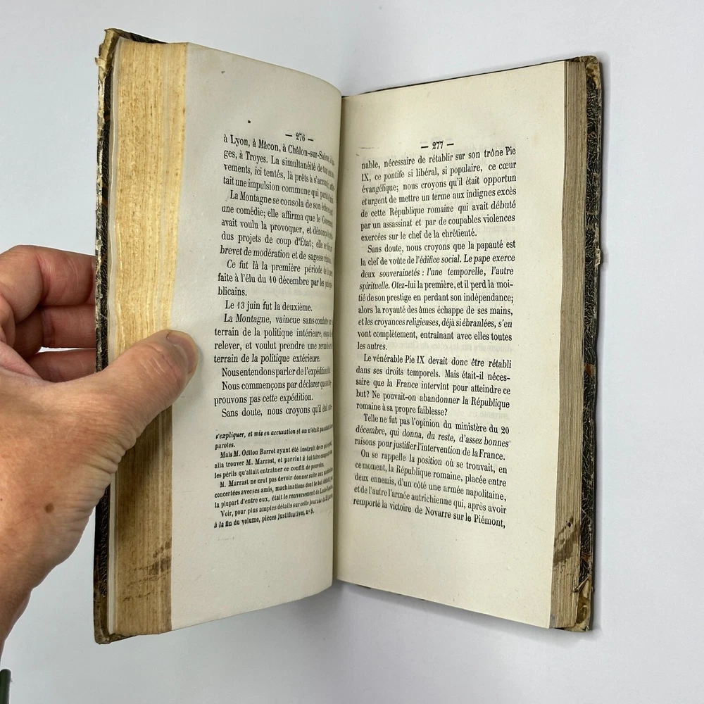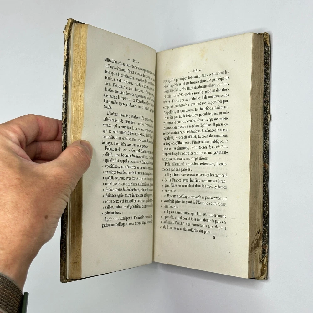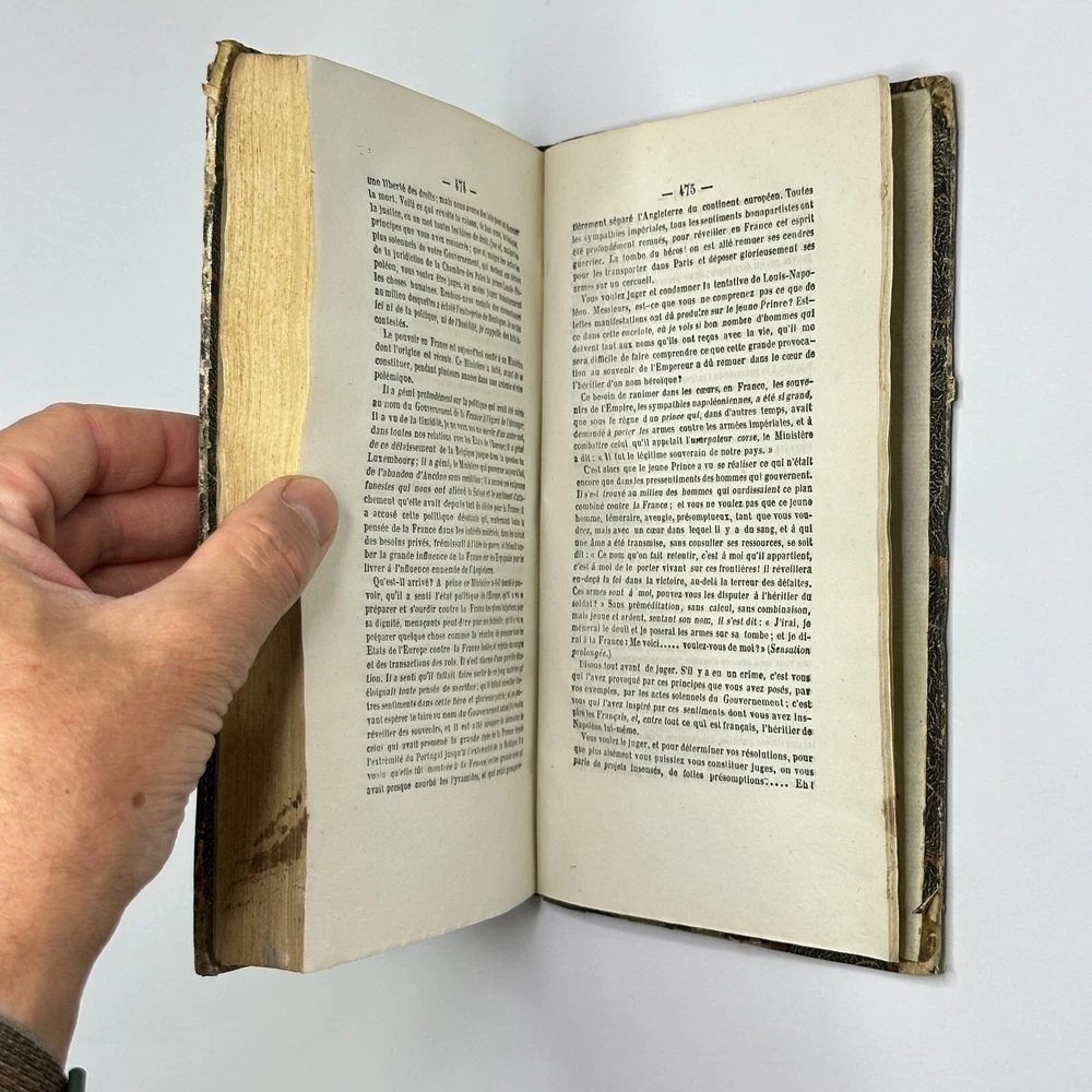 "Histoire Complete de Louis-Napoleon Bonaparte" Jean Claude Barthélemy Gallix & Guy de l'Herault 1852 H. Morel, Librraire-Editeur Quarter Leather Size: 5.5" x 9" This book provides an account of the life and political career of Louis-Napoleon Bonaparte, focusing on his political endeavors, including his presidency during the French Second Republic and his eventual proclamation as Emperor Napoleon III. Condition: Strong binding. Shelf wear and scuffing to boards; rubbed corners and edges. Chipping at spine bottom. Foxed and stained text block edges. Damp-stained bottom gutter on first/last few pages. Foxing and wrinkling to endpapers and adjacent few pages, then lighter foxing throughout. No markings. No scent. See pictures for condition references. Please ask any questions before purchasing. ----------- Orders are carefully packed and shipped in boxes using USPS Media Mail. Orders placed before 2pm ET are shipped the same business day, unless we are away sourcing additional inventory. We combine shipping on orders with multiple items.