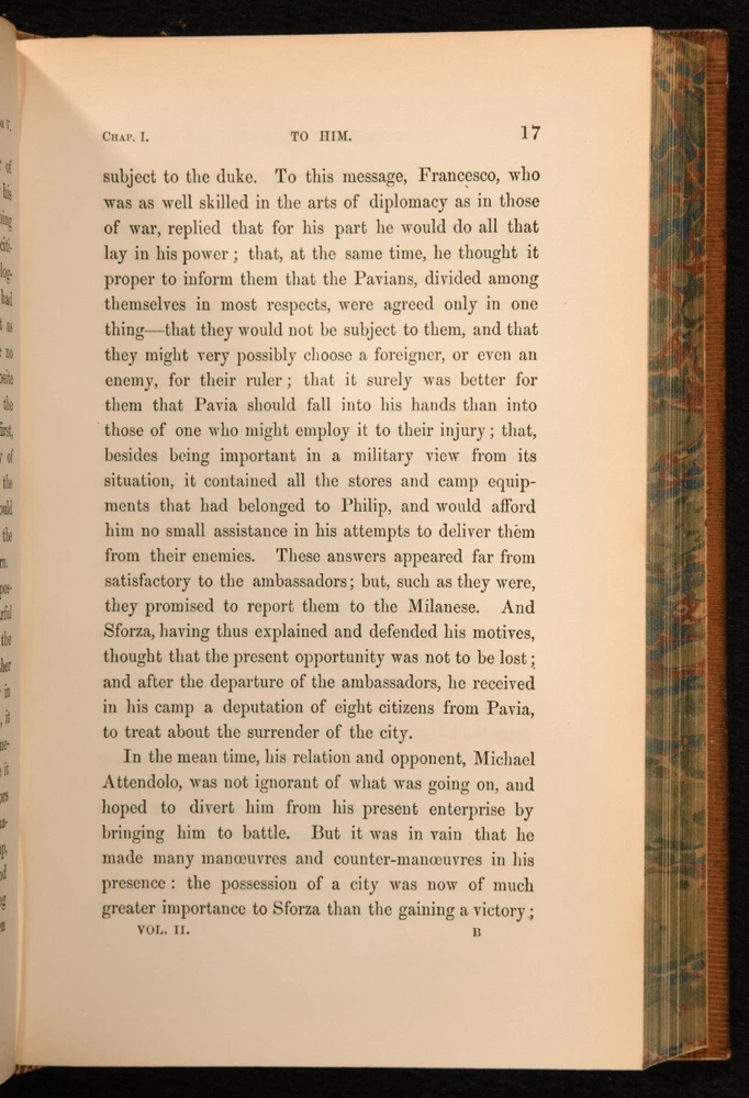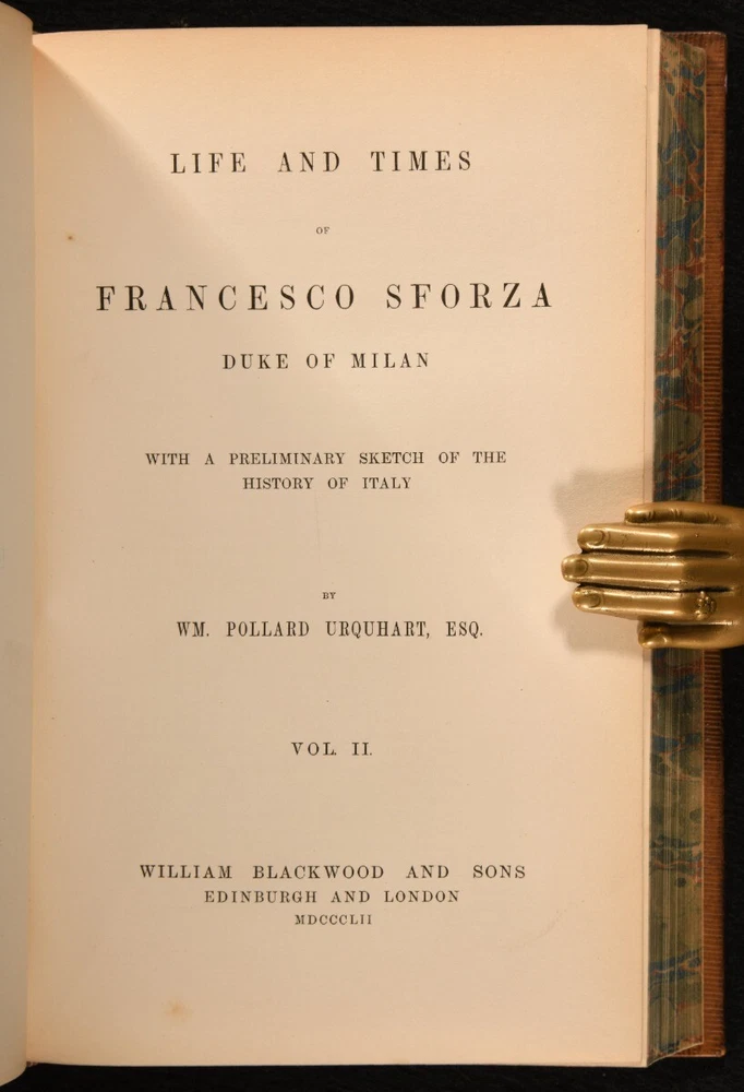 Click here to see our other books! Life and Times of Francesco Sforza Duke of Milan with a Preliminary Sketch of the History of Italy WM. Pollard Urquhart 1852 William Blackwood and Sons : Edinburgh and London 9" by 6" xii, 393, ix, 352pp. SUMMARY A smart complete two volume set of this detailed biography of the Duke of Milan, Francesco Sforza, bound in one volume. First Edition,Leather Binding,Original Binding,Publishers' Original Binding Overall Condition: Very Good This book weighs 1 KG when packed UK Postage: £ 3.99 US Postage: £ 22.99 EU Postage : £ 16.99 European Postage: £ 17.99 Asia Postage: £ 22.99 Worldwide Postage: £ 28.99 DESCRIPTION Complete in two volumes, bound in one. First edition. With a colour portrait frontispiece. The life of Francesco I Sforza, an Italian condottiero who founded the Sforza dynasty in the duchy of Milan, ruling as its duke from 1450 until his death. He participated in the War of L'Aquila, successfully invaded southern Italy alongside Rene of Anjou, pretender to the throne of Naples, and was instrumental in the Treaty of Lodi. With a preliminary sketch of the history of Italy. Written by William Pollard Urquhart, an Irish politician and writer specialising in economic and policy questions of his day. CONDITION Bound in full calf. Externally, smart with minor rubbing to the extremities and light fading to the spine. The odd small mark to the boards. Hinges starting but firm. Internally, firmly bound. Pages are very bright with the odd small spot. Further spotting and light age toning to the first and last few pages. Previous owner's bookplate to the front pastedown. Overall Condition: Very Good GLOSSARY OF TERMS Overall Condition (Dustwrapper condition rating is shown after that for the book itself, where a dustwrapper is present) Fine - Very well preserved copy showing very little wear Very Good Indeed - Only one or two minor faults, really a very attractive copy Very Good - Quite a wide term meaning no major faults but probably several smaller ones often expected given the age of the book, but still a respectable copy Good - Meaning not very good. Some more serious faults as will be described in the condition report under 'condition' Good Only - Meaning one or more faults that could really do with repair Fair - As with good only above but with other faults leaving a compromised copy even after repair Poor - Really bad and possibly seriously incomplete. We only sell books in this condition where their rarity or value makes them attractive none the less. Major defects will be described. GUARANTEE We offer a full money back guarantee on our descriptions. Please ask for details and conditions. We prefer PAYPAL. If you pay via PAYPAL we will post the item off the same or the next working day with the postage you have selected. Please note we cannot accept USD cheques