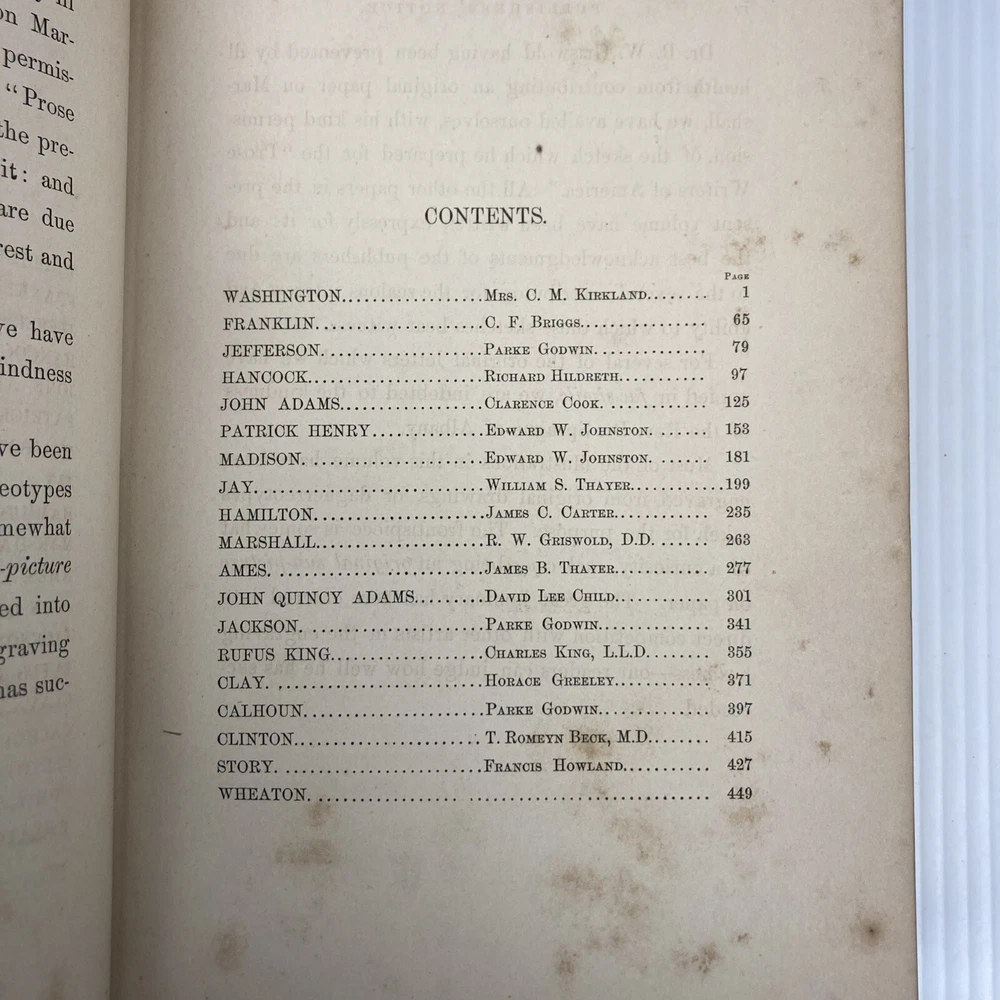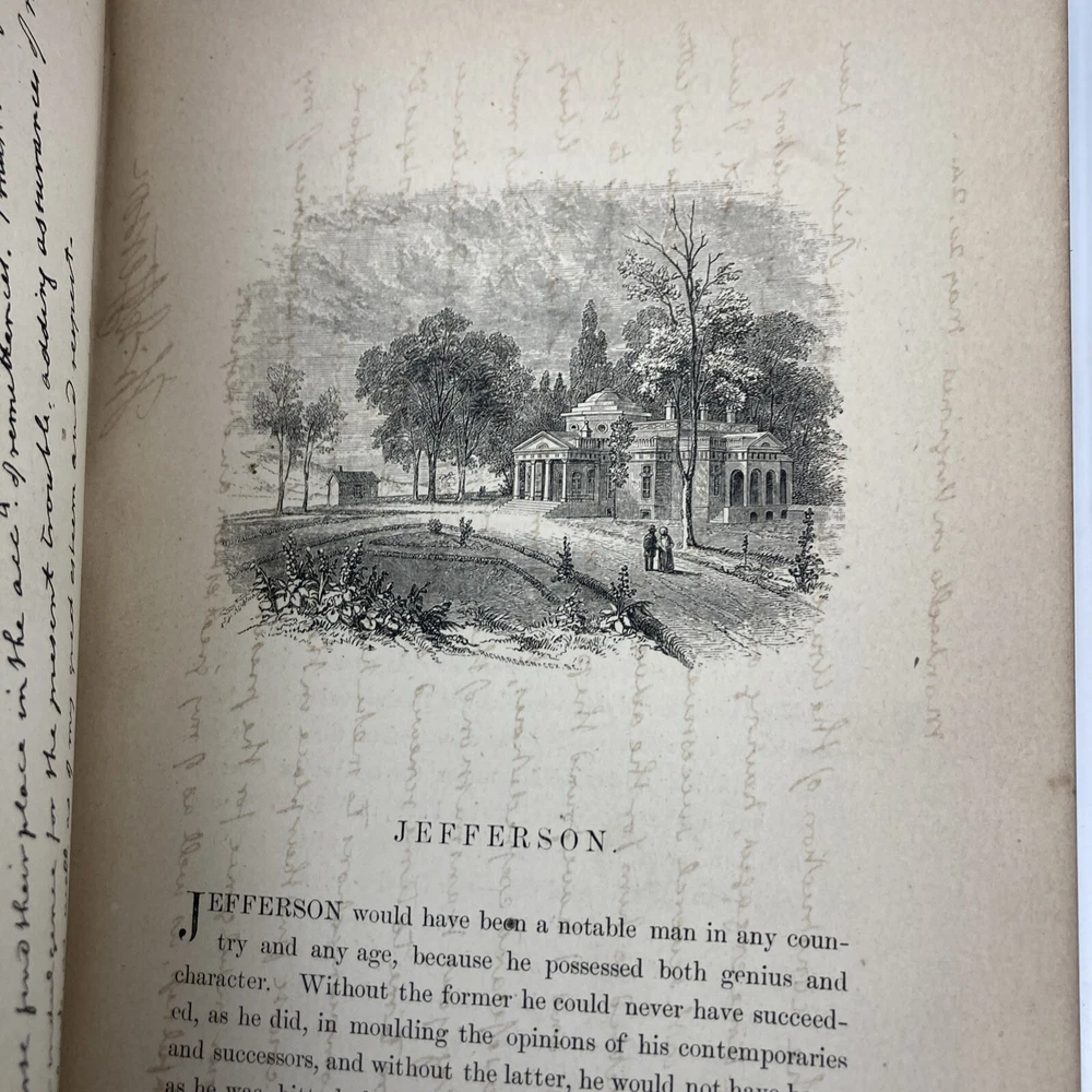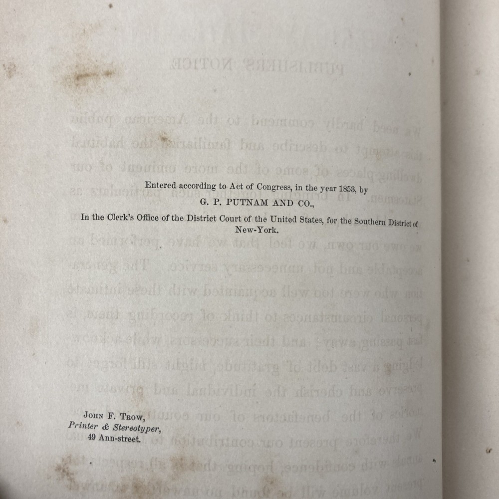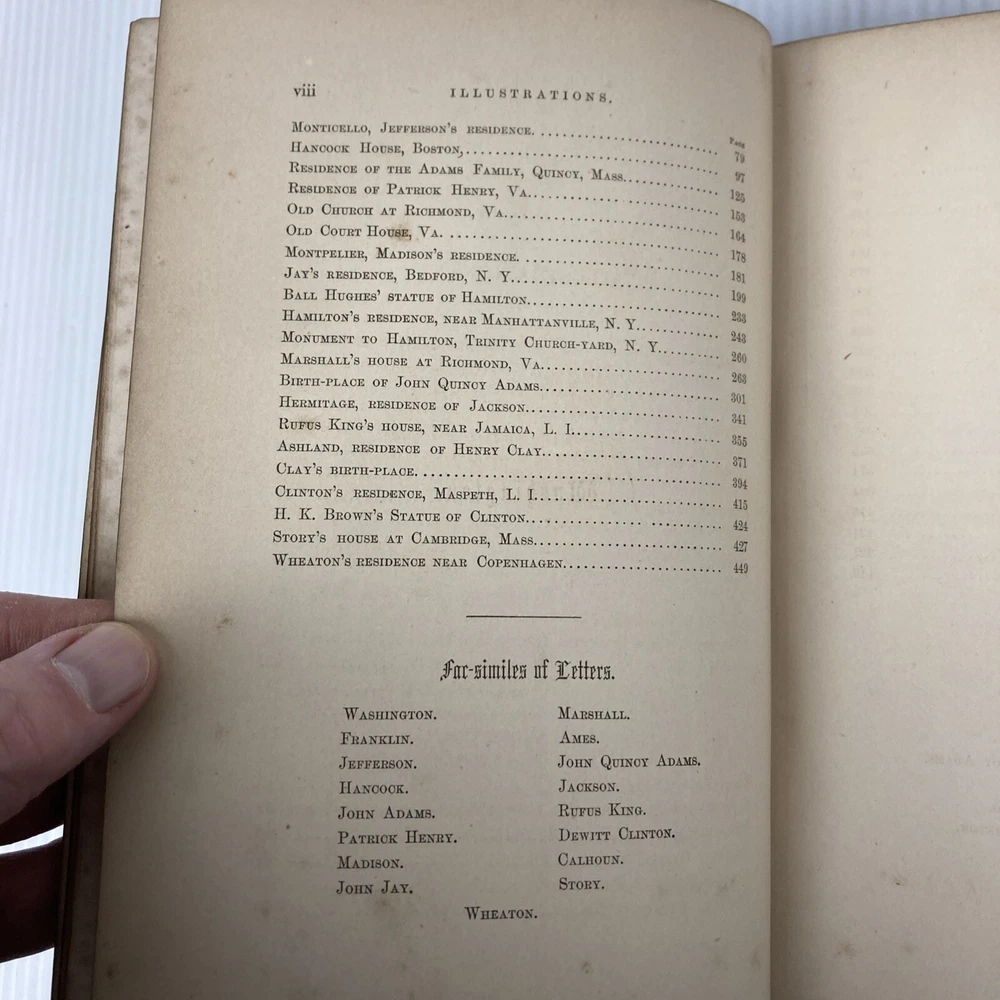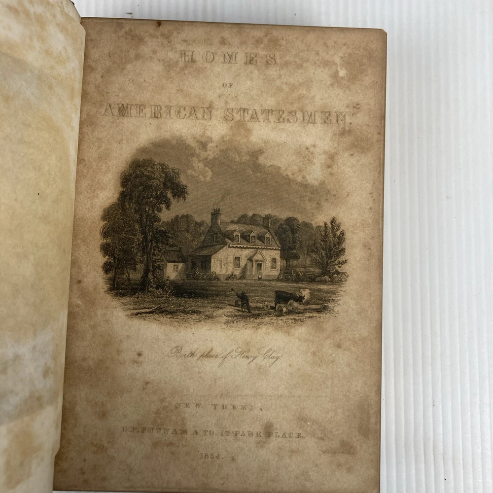 This antique book Homes of American Statesmen , is a rare, first edition with illustrations of the homes of prominent Americans, including Washington, Jefferson, Adams, Hancock,Madison, and others. It includes biographical profiles of each statesmen. It was published by G.P. Putnam and Co. in 1854. I ship books carefully and securely in protective boxes.