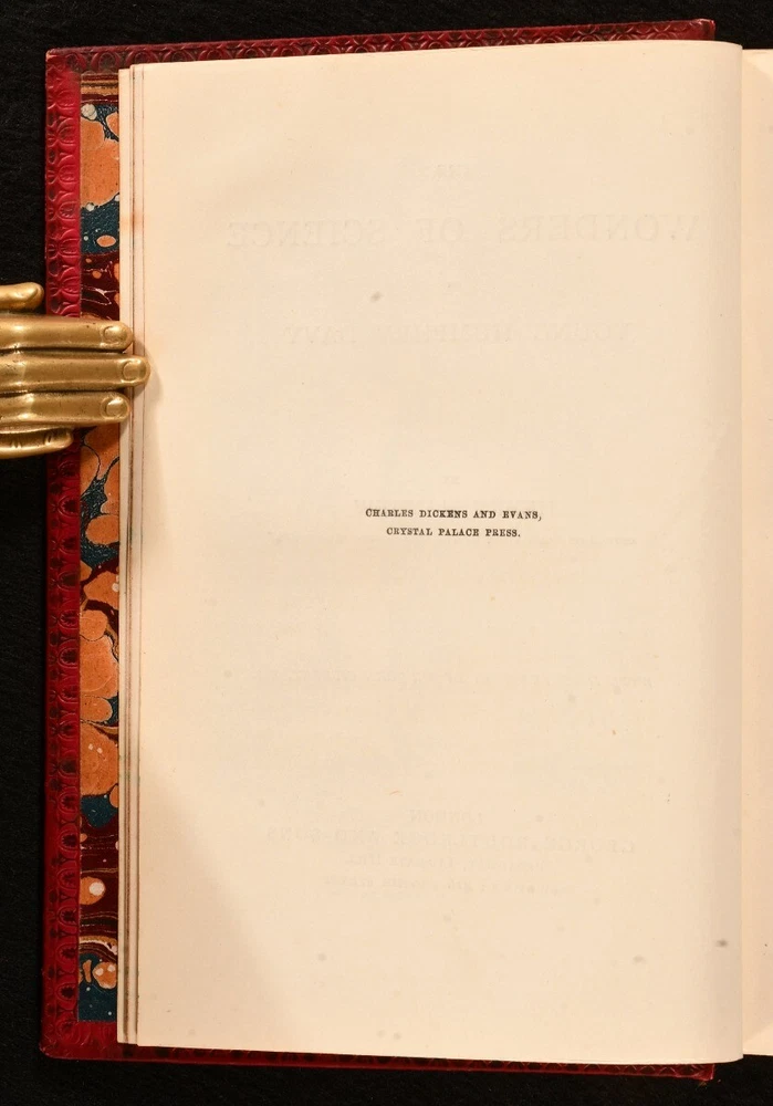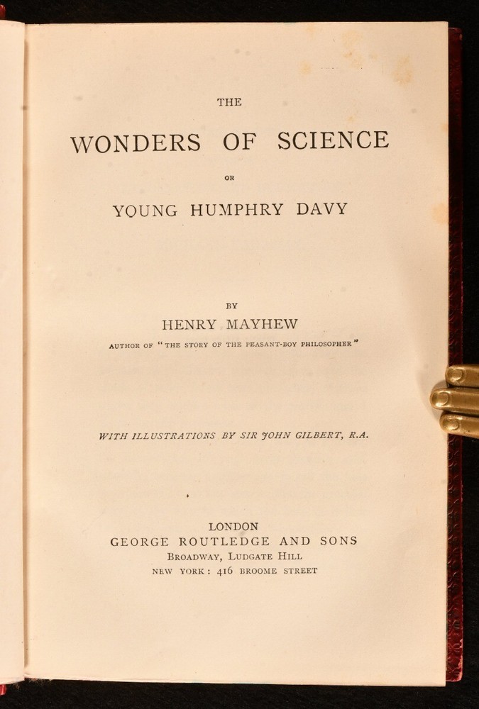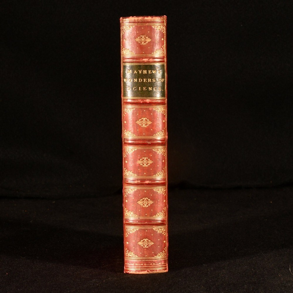 Click here to see our other books! The Wonders of Science or Young Humphry Davy Henry Mayhew [1854] George Routledge and Sons : London 7" by 4.5" xvi, 424pp SUMMARY A bright copy of this ode scientific wonders by Henry Mayhew in full calf prize binding. Illustrated,Leather Binding,Prize Binding,Rebound Overall Condition: Very Good Indeed This book weighs 0.75 KG when packed UK Postage: £ 3.99 US Postage: £ 19.99 EU Postage : £ 15.99 European Postage: £ 16.99 Asia Postage: £ 21.99 Worldwide Postage: £ 25.99 DESCRIPTION Dated via Jisc. A scarce work. Celebrative of scientific wonders including the invention of the safety-lamp, the wonderful effects of heat, the wonders of the reflection of light, and more. Written by Henry Mayhew, English journalist and playwright, co-founder of the satirical magazine 'Punch.' With frontispiece and further vignette illustrations in text. CONDITION Rebound in full calf with five raised bands, titles in gilt to morocco spine label, gilt tooling to spine, gilt blind stamp to front board, marbled edges and endpapers. Externally very smart with only light rubbing to joints and head and tail of spine. Internally, firmly bound. Light minor spotting to first and last few leaves, pages otherwise generally bright and clean. Overall Condition: Very Good Indeed GLOSSARY OF TERMS Overall Condition (Dustwrapper condition rating is shown after that for the book itself, where a dustwrapper is present) Fine - Very well preserved copy showing very little wear Very Good Indeed - Only one or two minor faults, really a very attractive copy Very Good - Quite a wide term meaning no major faults but probably several smaller ones often expected given the age of the book, but still a respectable copy Good - Meaning not very good. Some more serious faults as will be described in the condition report under 'condition' Good Only - Meaning one or more faults that could really do with repair Fair - As with good only above but with other faults leaving a compromised copy even after repair Poor - Really bad and possibly seriously incomplete. We only sell books in this condition where their rarity or value makes them attractive none the less. Major defects will be described. GUARANTEE We offer a full money back guarantee on our descriptions. Please ask for details and conditions. We prefer PAYPAL. If you pay via PAYPAL we will post the item off the same or the next working day with the postage you have selected. Please note we cannot accept USD cheques
